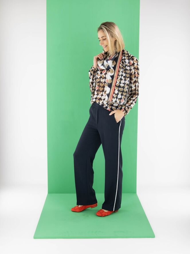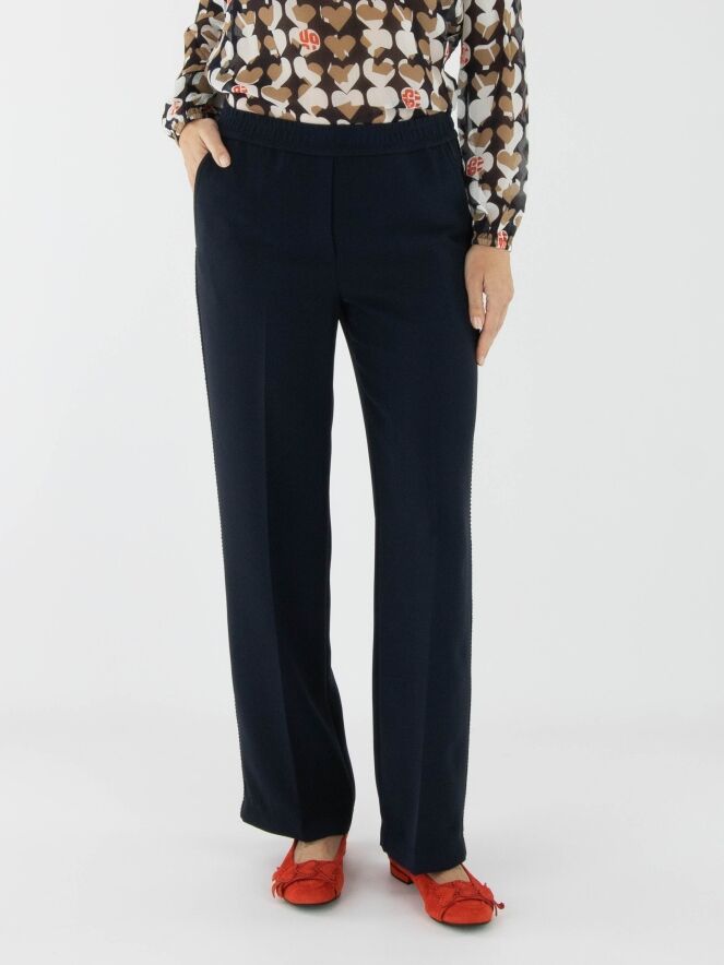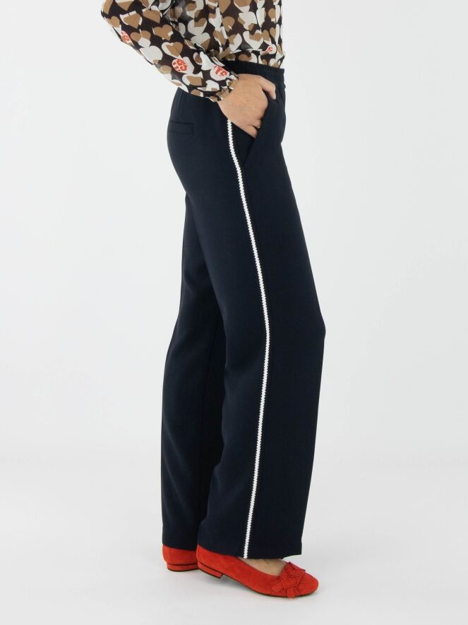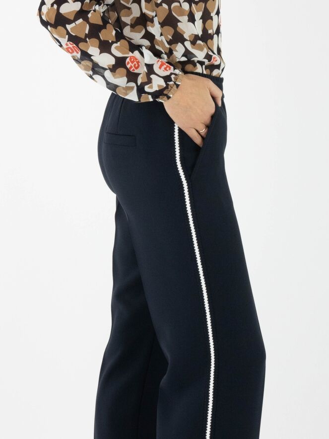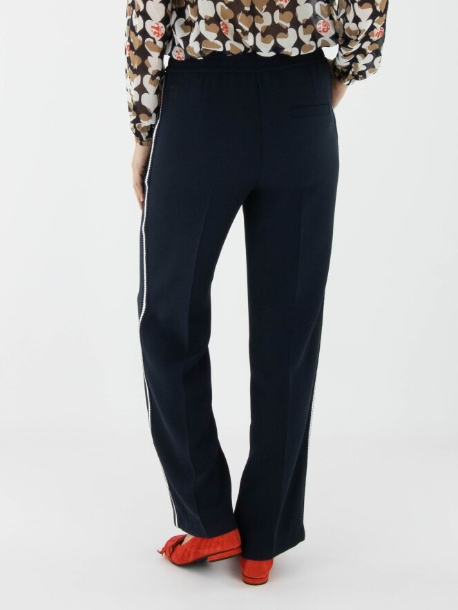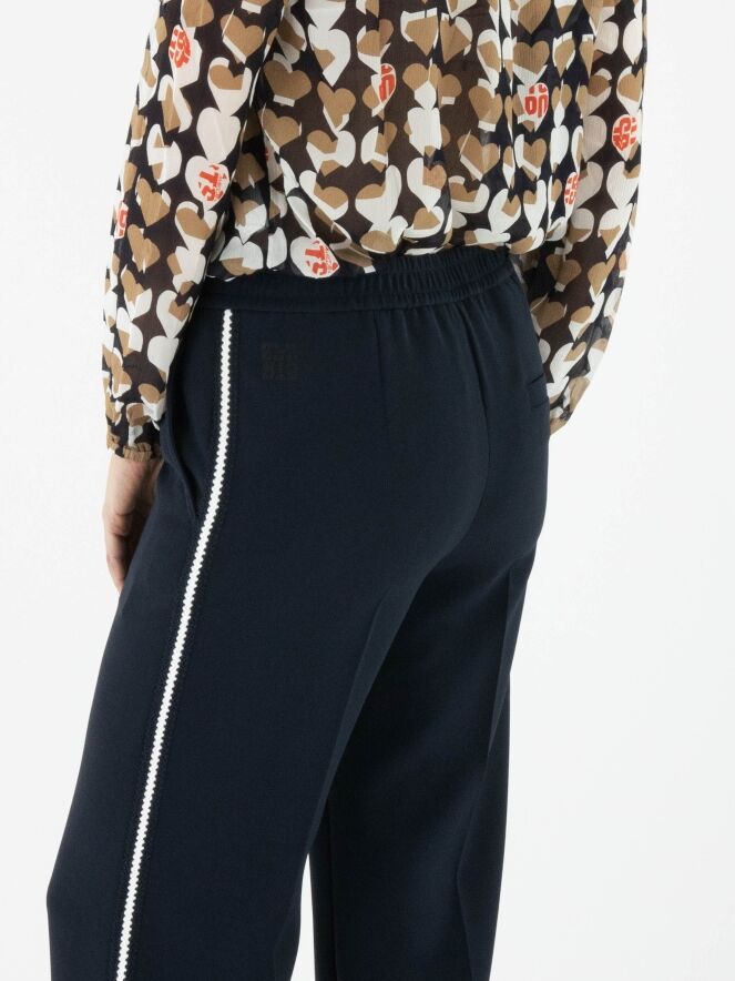A Marc Cain jogging trousers in navy blue. The waistband features a finely pleated elastic band. Along the sides is a knitted stripe trim in white and navy blue. The trousers have side pockets and can be washed at 30 degrees.