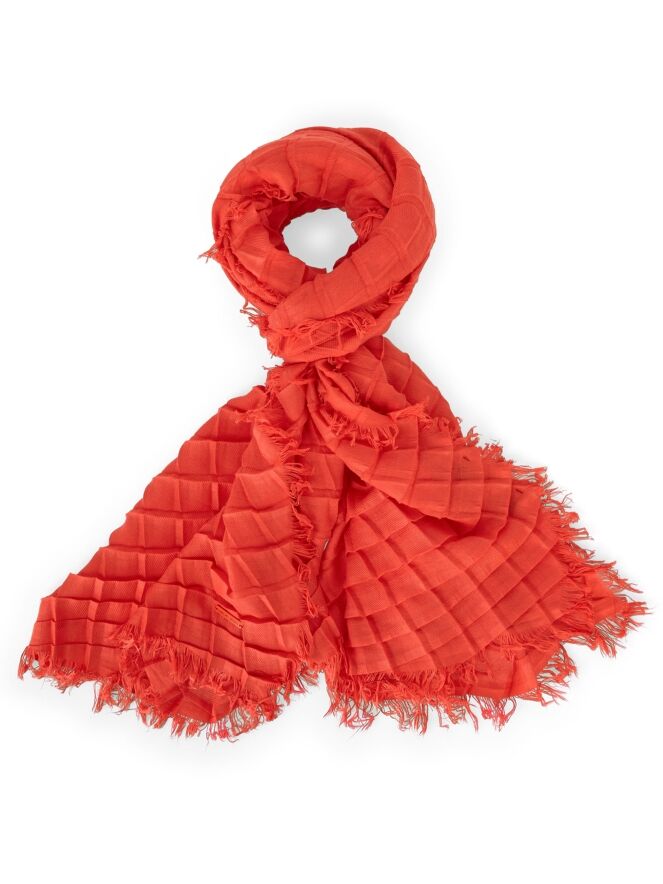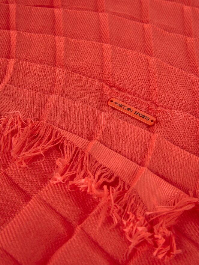 A Marc Cain shawl in a fresh red color. The shawl is woven in a waffle texture and features delicately frayed edges. This shawl should be hand-washed.