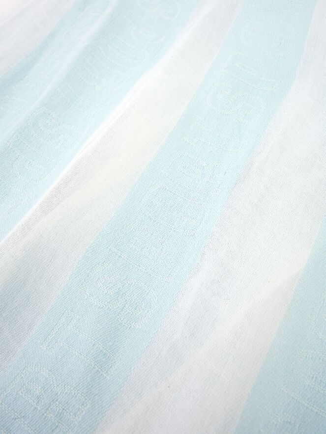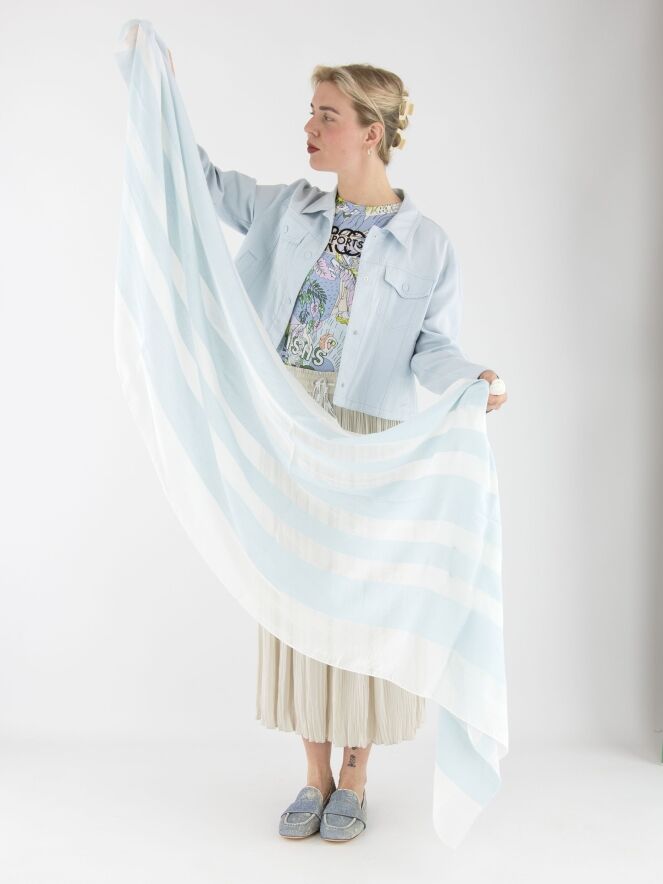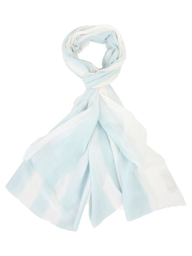 A lightly transparent scarf from Marc Cain with a striped pattern in pastel blue and white. The ends of the scarf are subtly frayed. This scarf should be hand-washed.