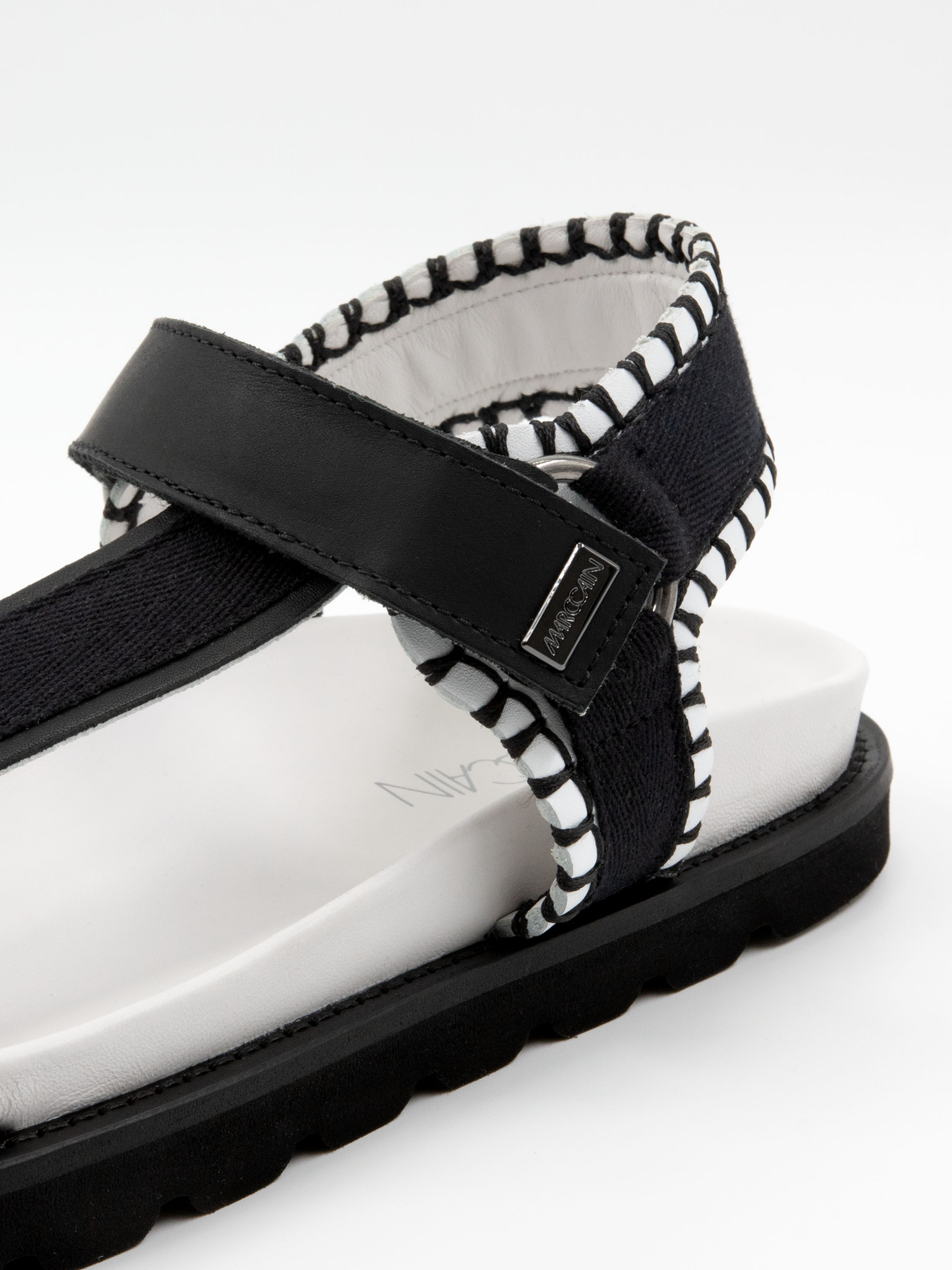 A sandal by Marc Cain in the color black. Two straps cross the forefoot, with a decorative asymmetrical strap over the instep. Decorative white stitching runs along the strap. The sole and footbed are finished in black. The sandal has a Velcro fastening.