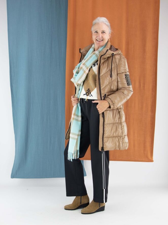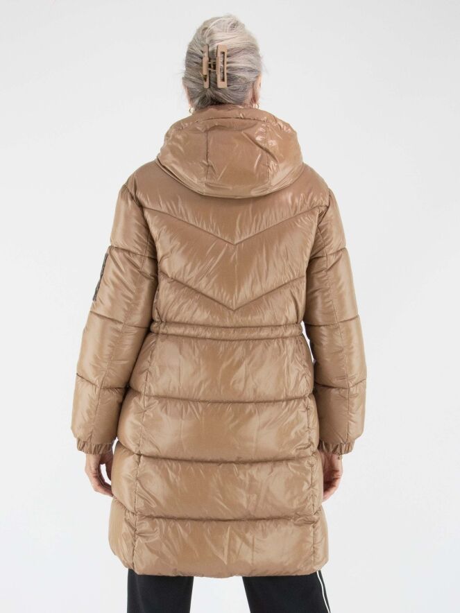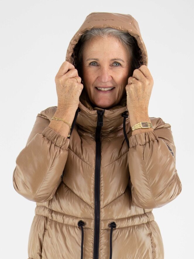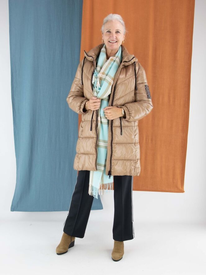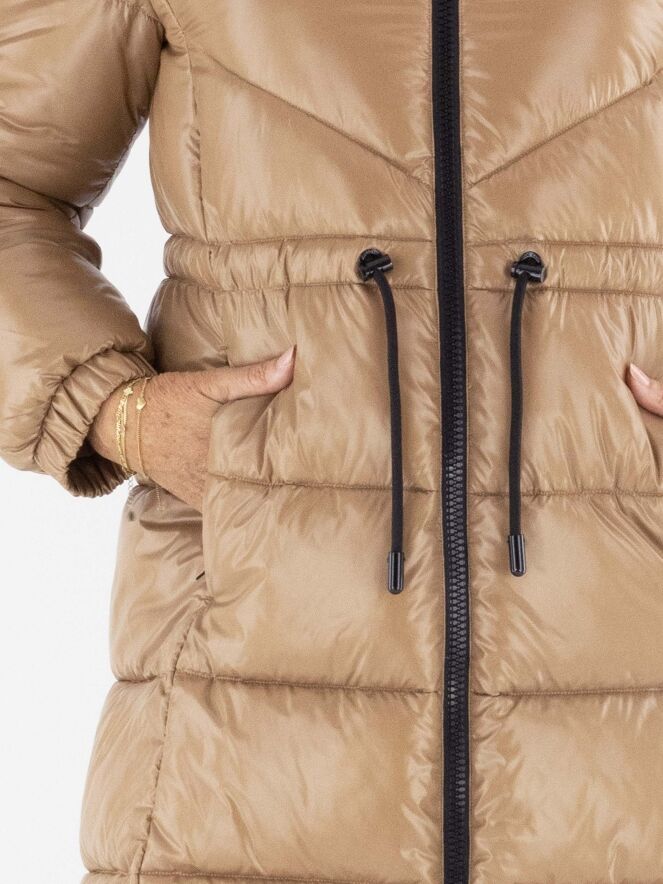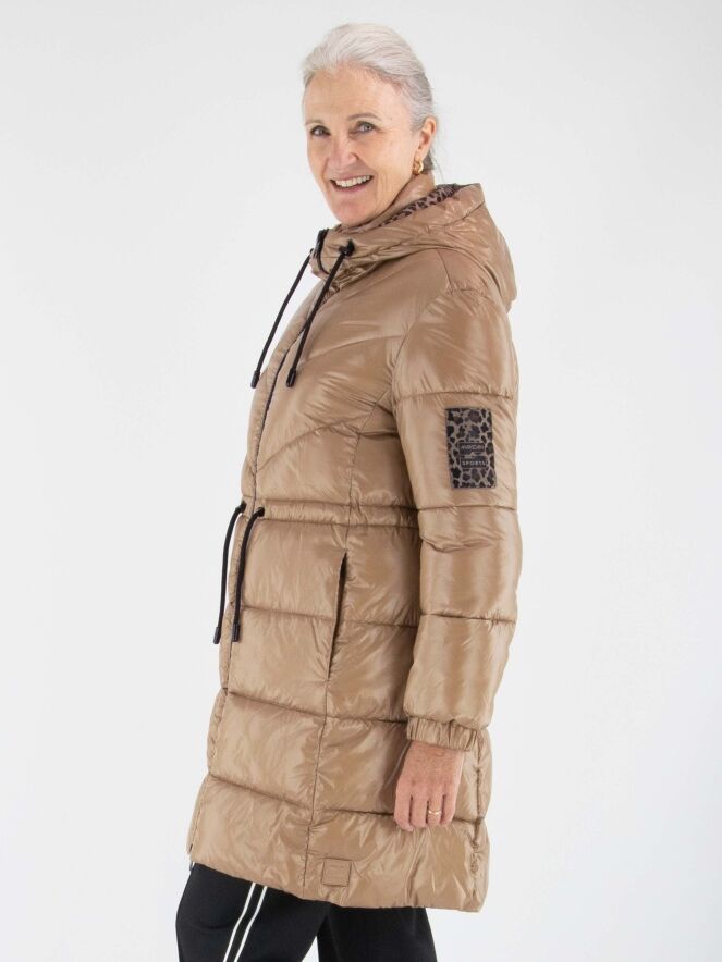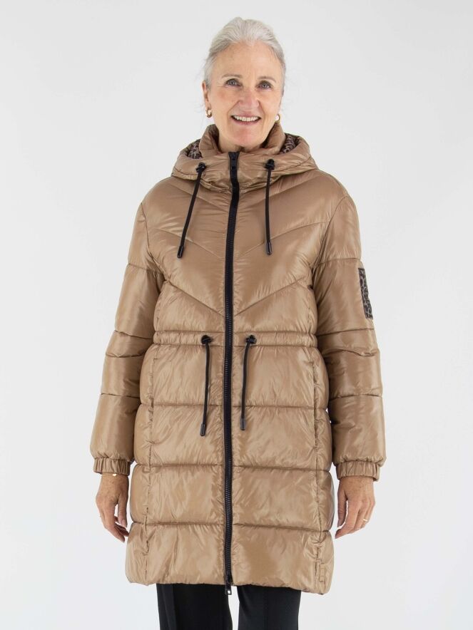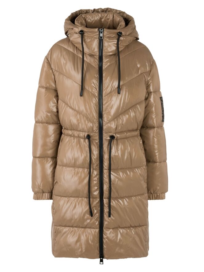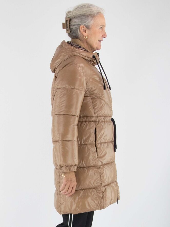 A stylish long quilted coat from Marc Cain in camel with a glossy lacquer look. The hood is finished with a leopard print lining for a playful touch. The slit pockets at waist height are fitted with zippers. Both the edge of the hood and the waist feature a drawstring tunnel that can be tightened for a perfect fit. The coat closes with a zipper and can be washed at 30 degrees.