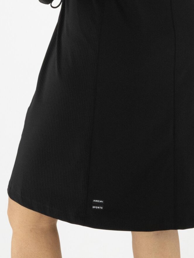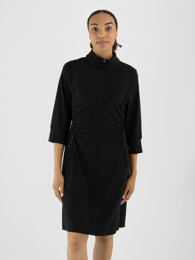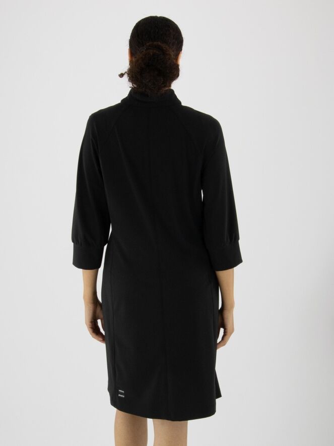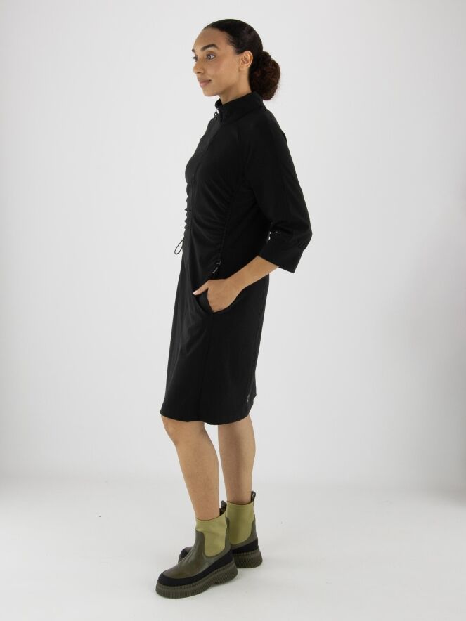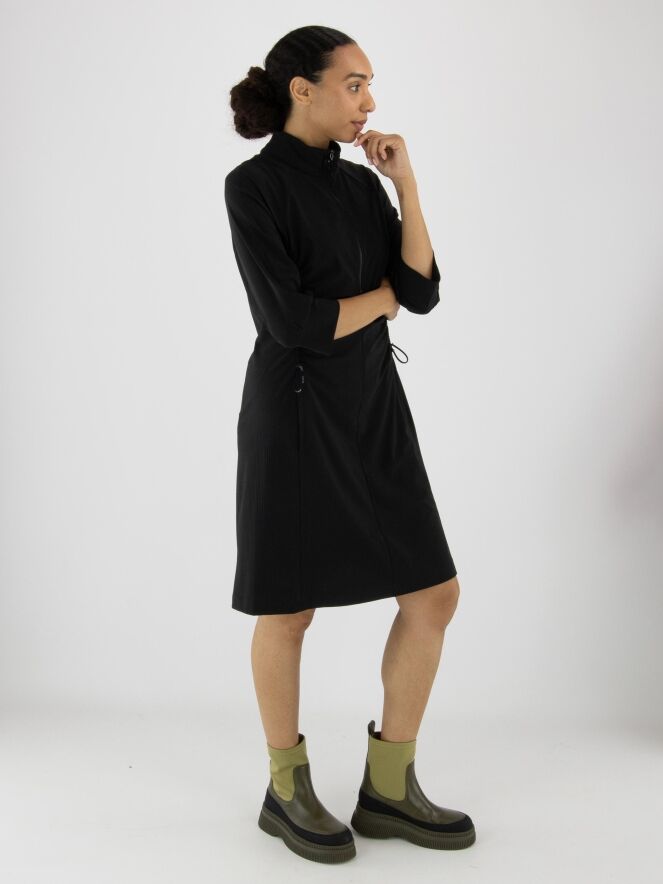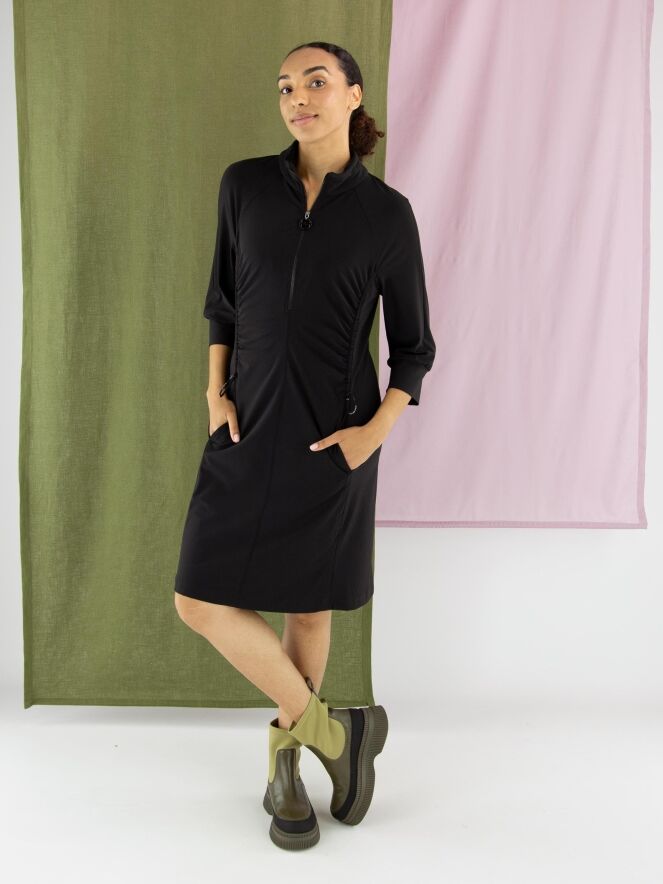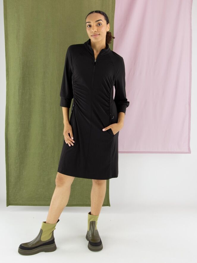 A dress by Marc Cain in black. The high neckline is finished with a fine ribbed trim, a detail that is repeated at the ends of the half-length sleeves. A zipper runs from the neckline to just above the waist. From the bottom of the sleeve insertion, a drawstring is integrated into the seam down to the waist, allowing for a pleated effect. The fabric along the sides is finely ribbed. This dress can be washed at 30 degrees.