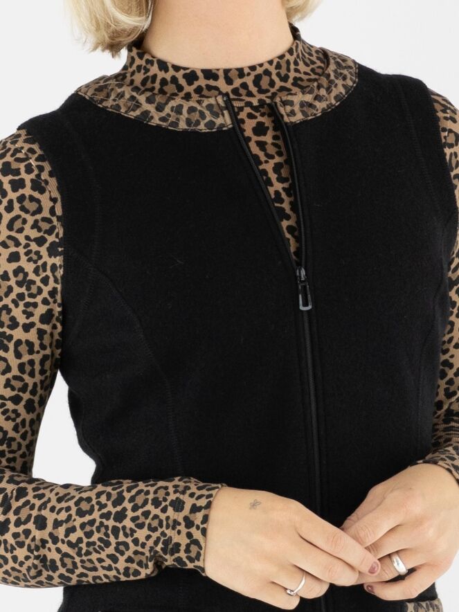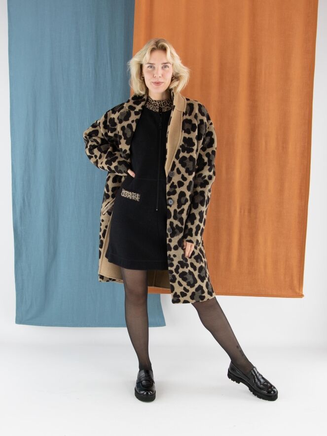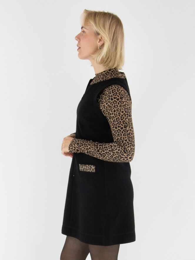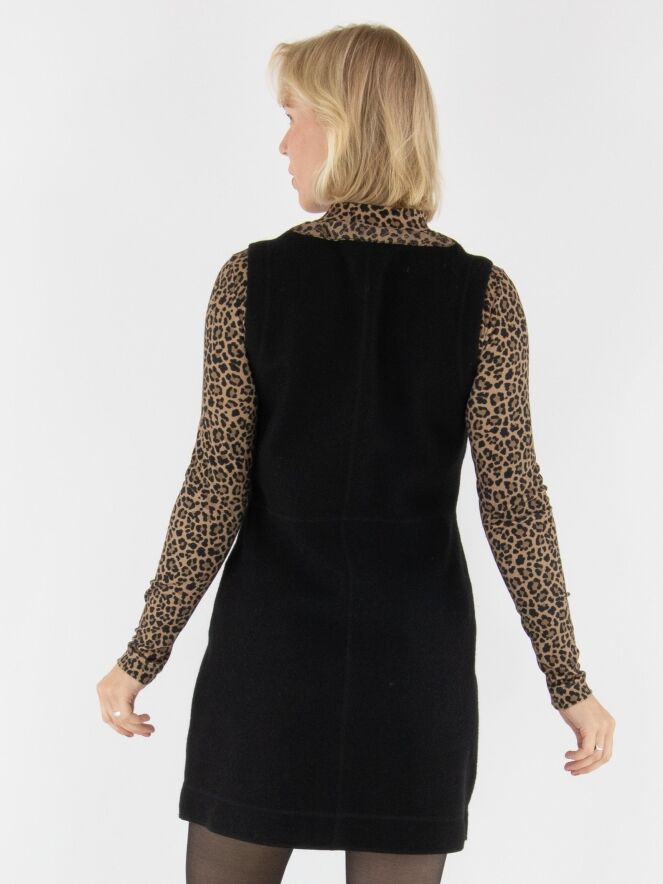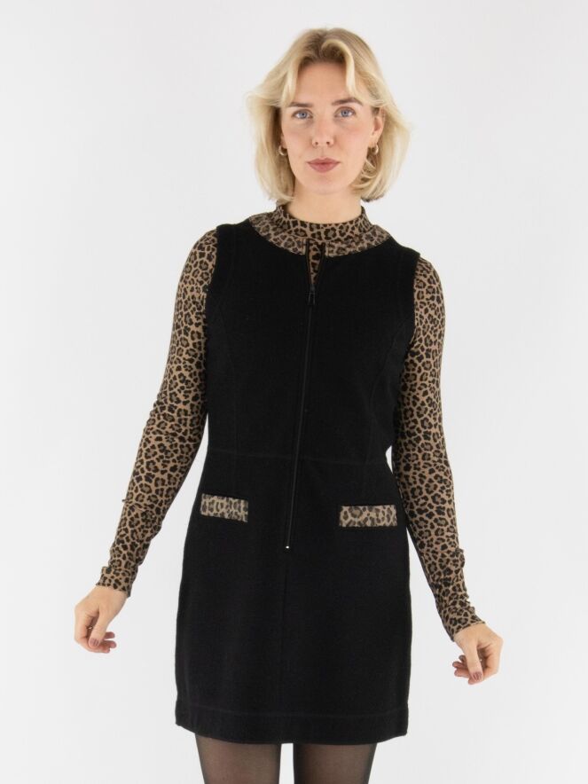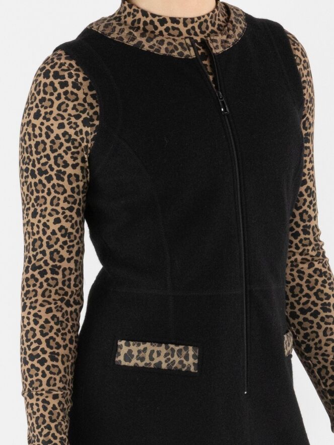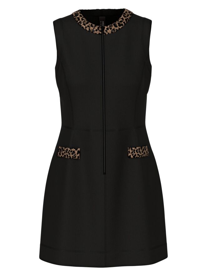 An elegant dress from Marc Cain in boiled wool quality in classic black. Along the edge of the round neckline runs a padded trim in leopard print with shades of brown and black. This detail is mirrored at the pocket edges on the front, creating a stylish finish. A zipper extends from the neckline down to below the waist. This dress must not be washed.