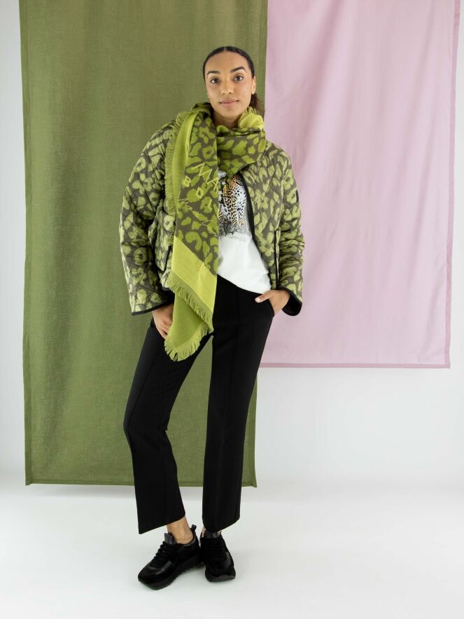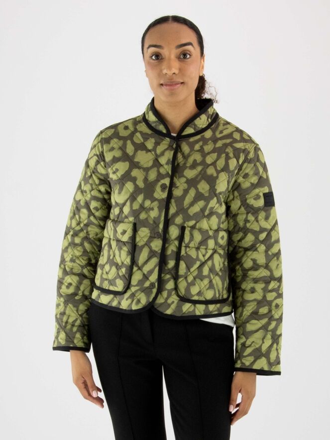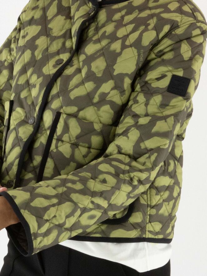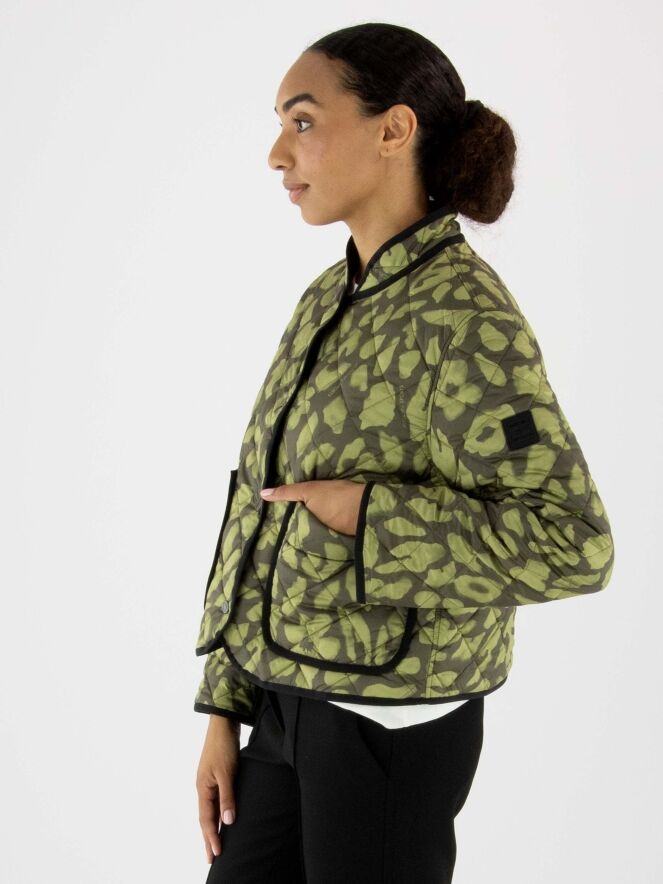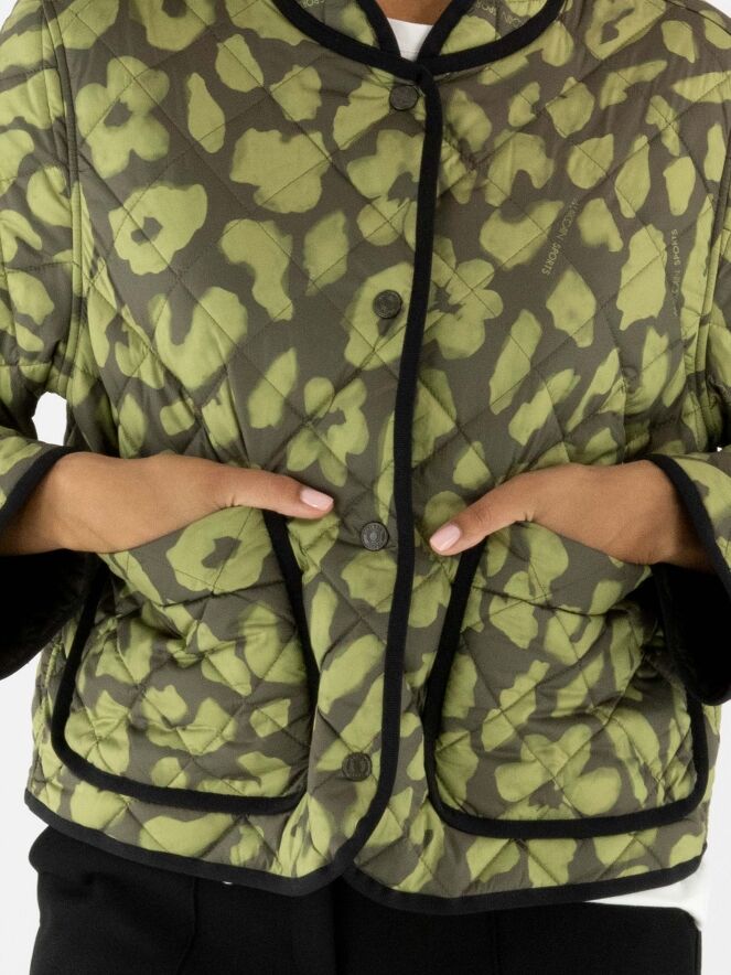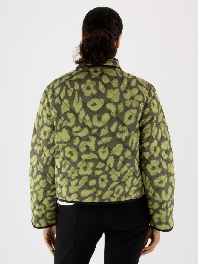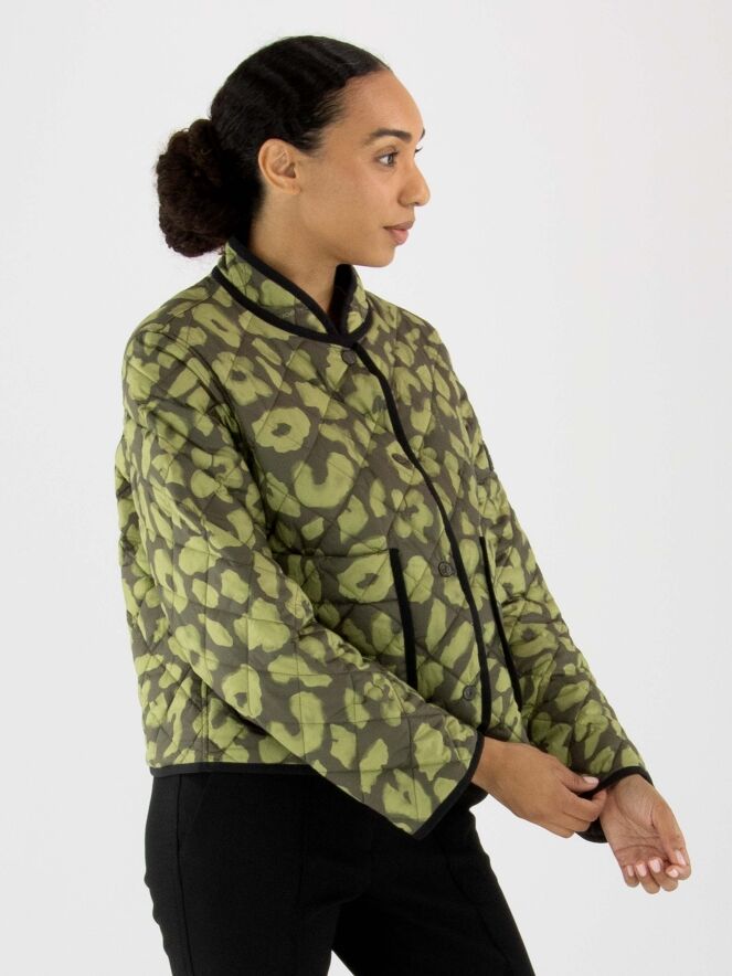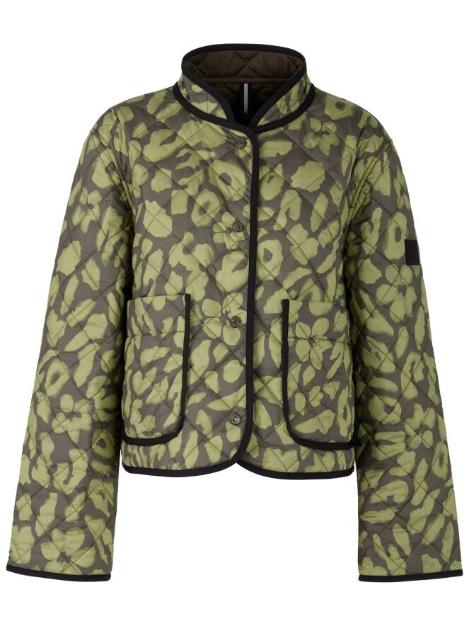 A padded reversible coat by Marc Cain featuring a print in pistachio green and olive green. A black trim runs along the collar and neckline and continues down the snap-button closure. The reverse side is in a solid olive green. This coat can be washed at 30 degrees.