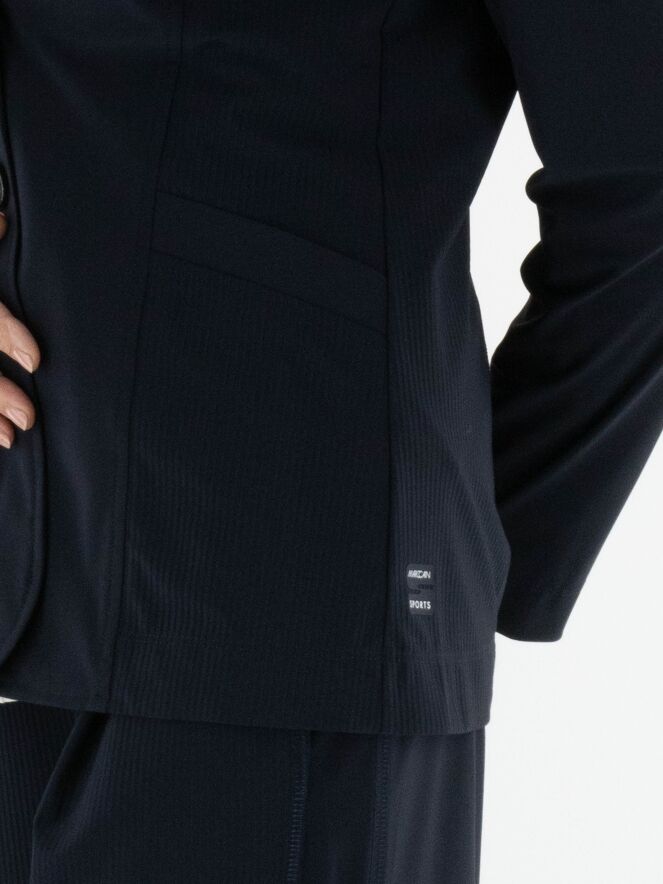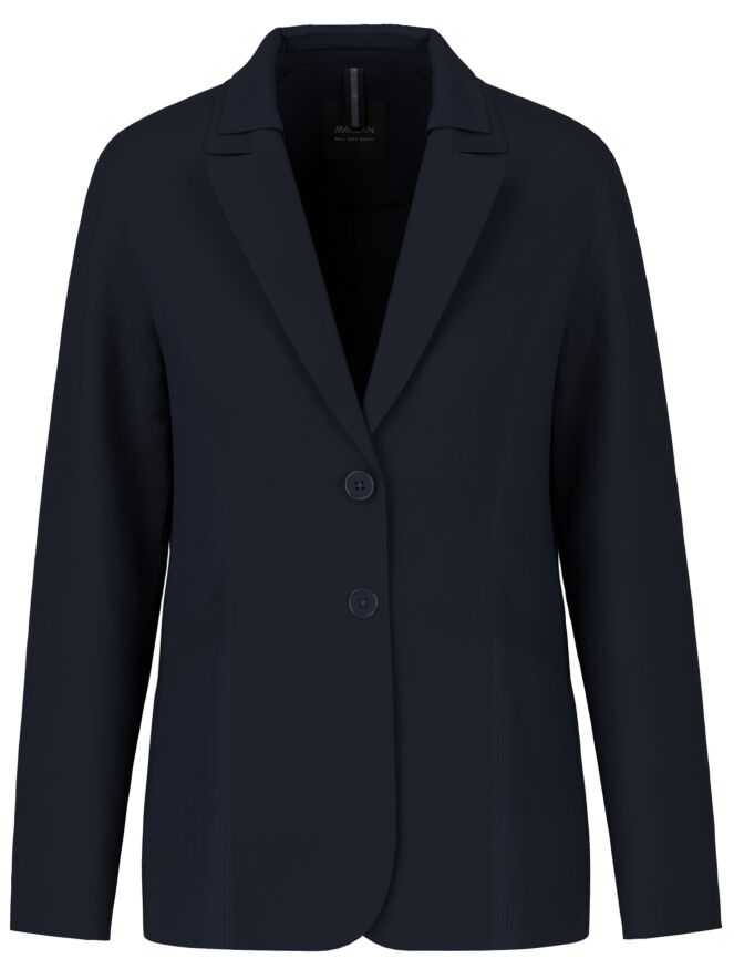 A blazer by Marc Cain in navy blue. The side panels on the front and back feature a pinstripe texture. The top layer of the double collar is also made from this ribbed fabric. The blazer has a two-button closure and is unlined. This blazer can be washed at 30 degrees.