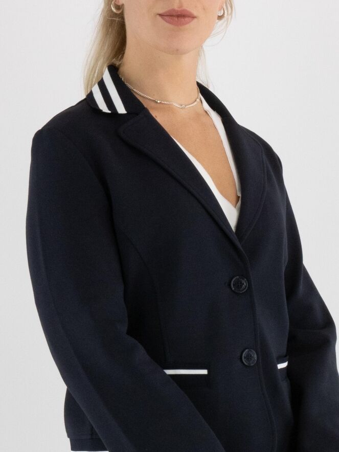 A blazer by Marc Cain in navy blue. The striped collar and hem are made of finely ribbed knit fabric. The pocket edges are finished with a trim in the same knit material. The blazer is unlined and fastens with two buttons. This blazer can be washed at 30 degrees.