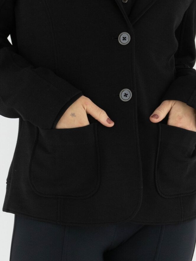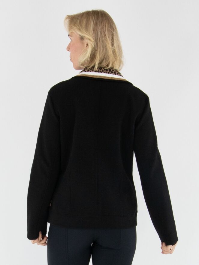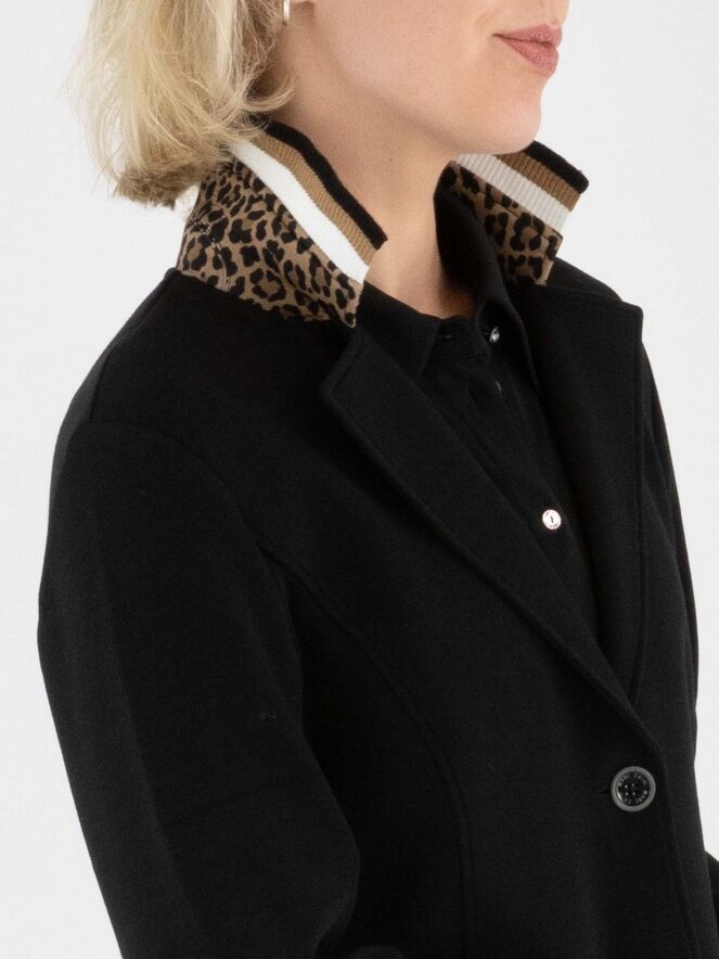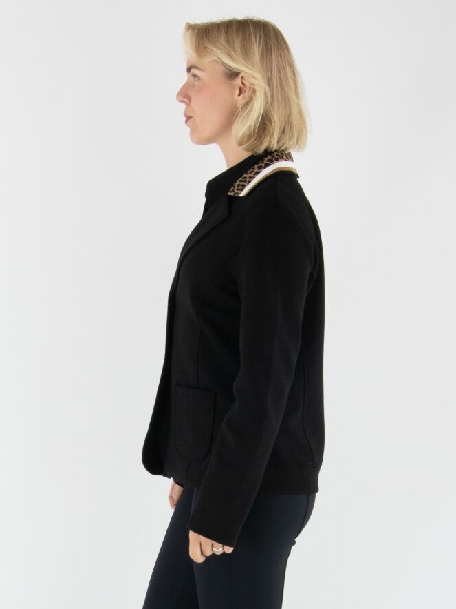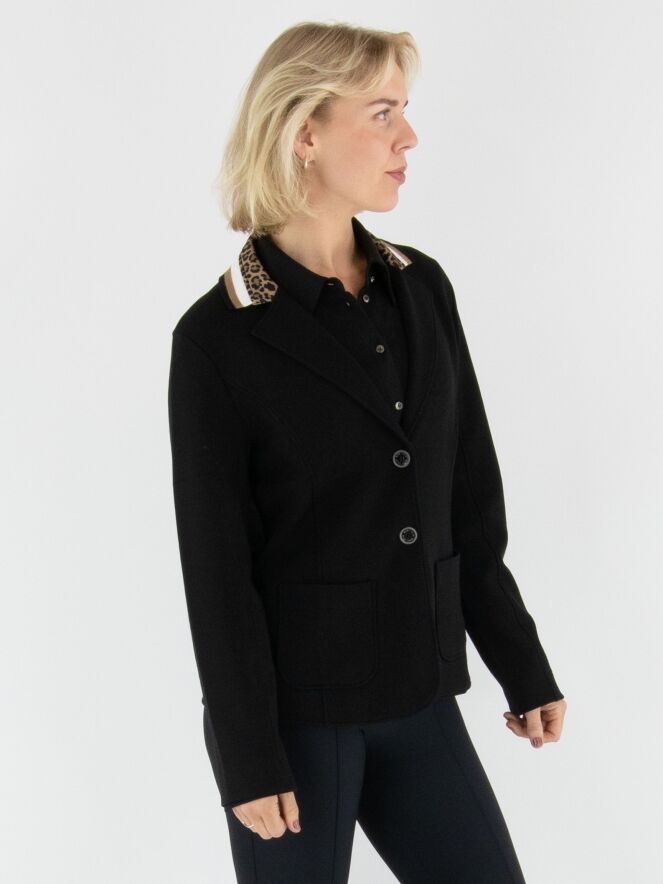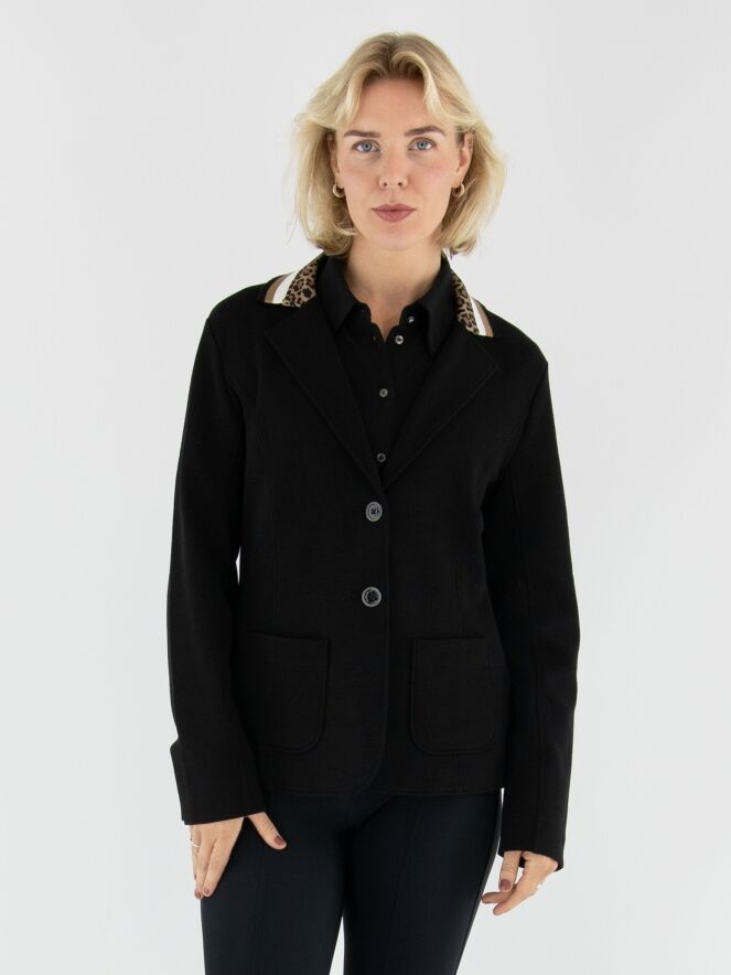 A blazer from Marc Cain in black. The collar is finished in finely ribbed jersey with a striped pattern in off-white, black, and camel, combined with a leopard-print trim for a stylish contrast. The blazer fastens with two buttons and is unlined, making it lightweight and comfortable to wear. This blazer can be washed at 30 degrees.
