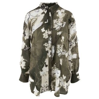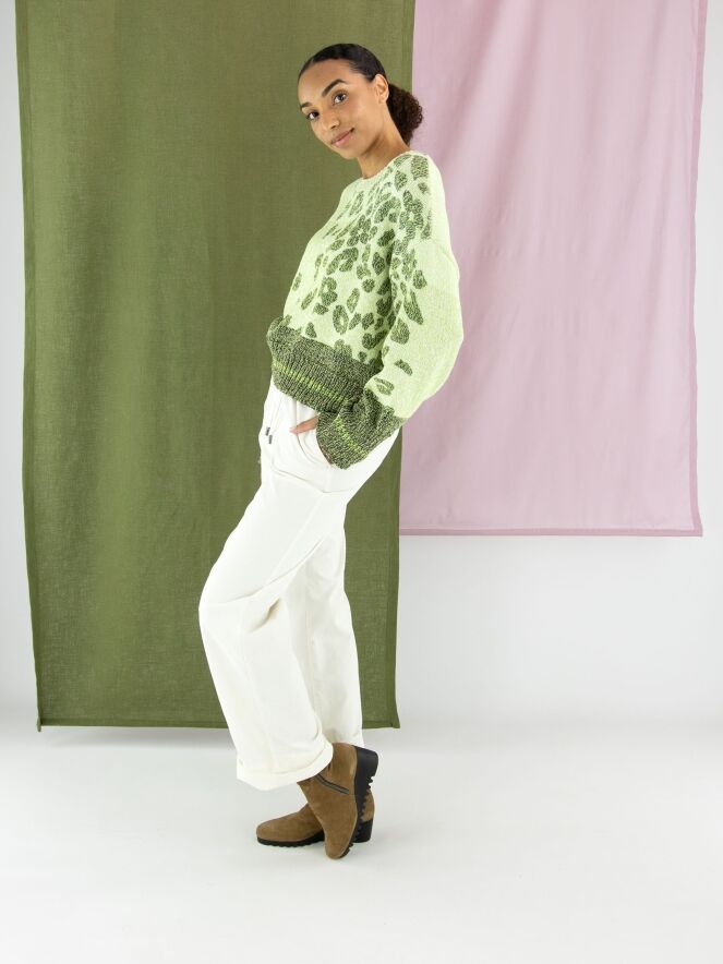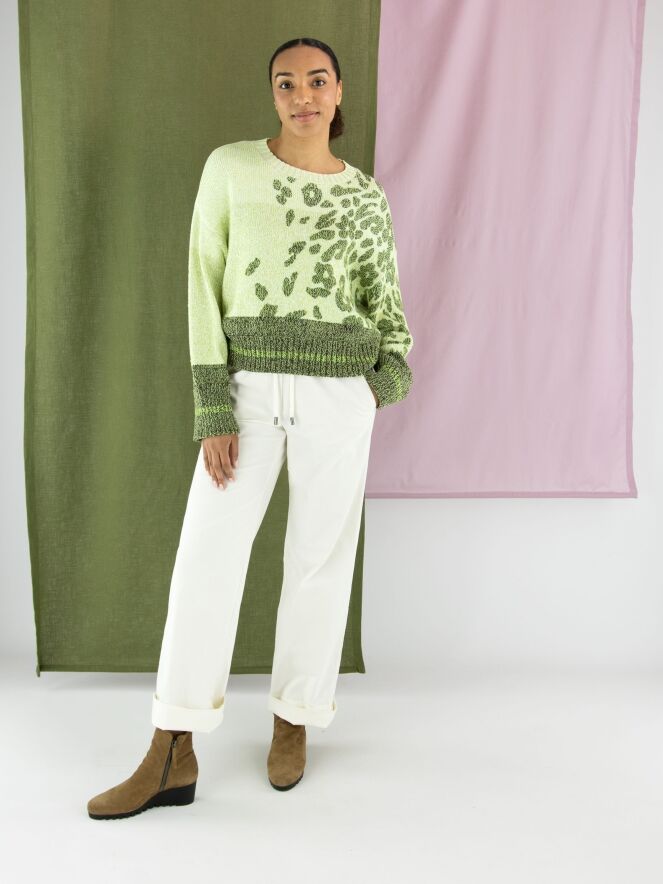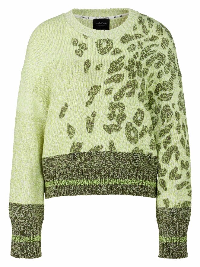 A mottled pullover by Marc Cain, partly featuring a leopard print in olive green, off-white and pistachio green. The round neckline is finished with a ribbed trim. The ends of the long sleeves and the hem are detailed with a mottled ribbed border. This pullover can be washed at 30 degrees.