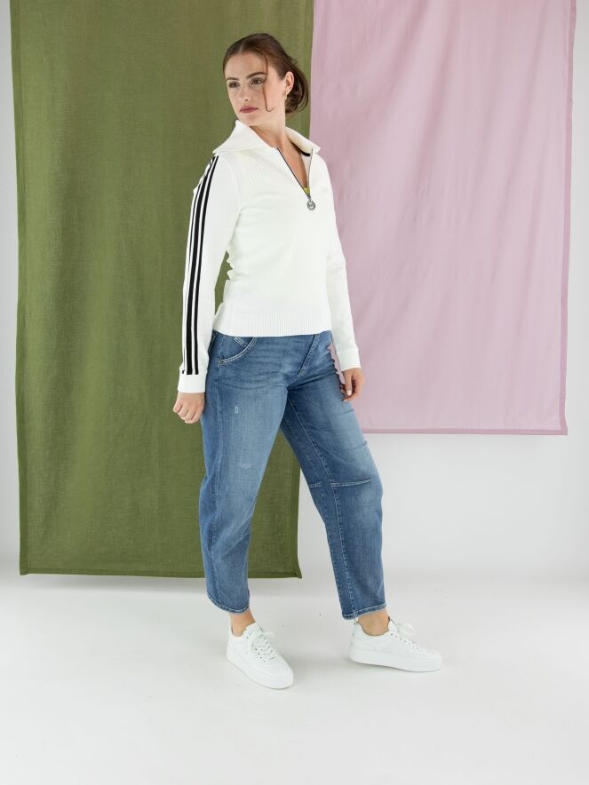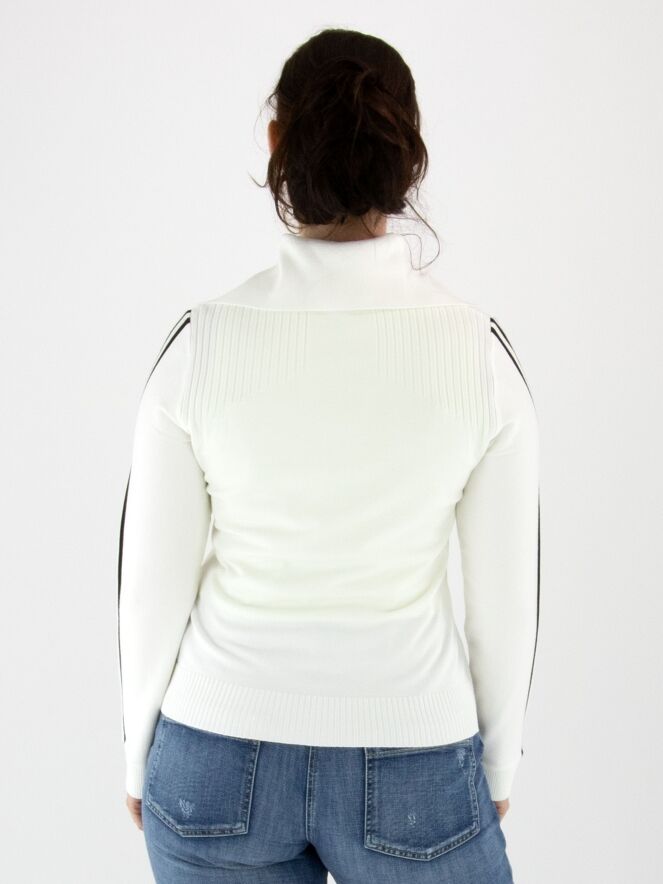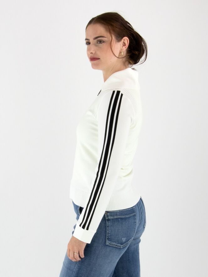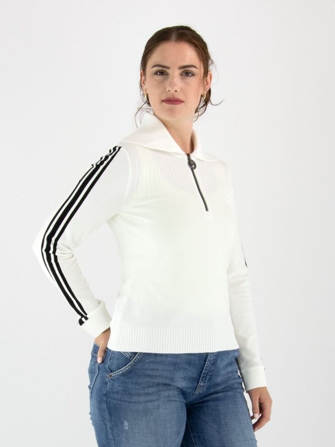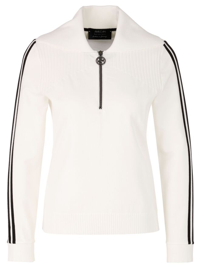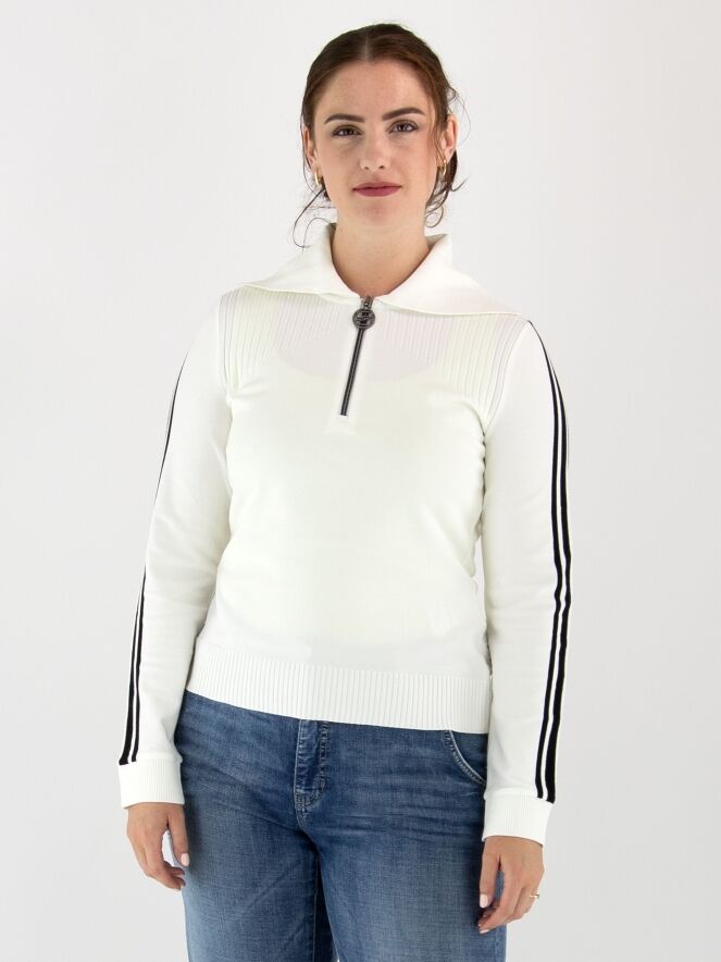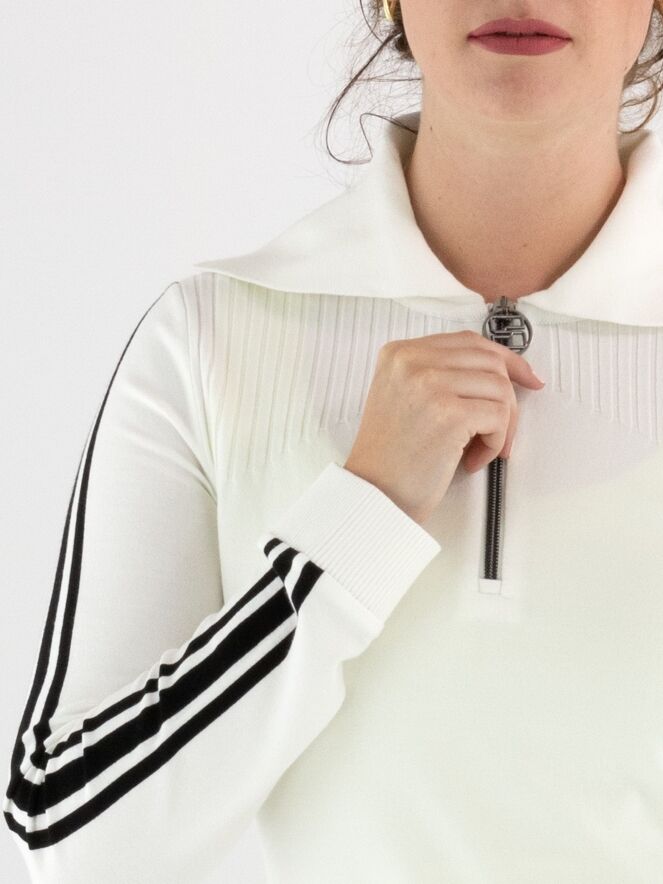 A pullover by Marc Cain in a polo style in off-white. The collar is finely ribbed and a zipper runs from the centre to the bust. Above the bust, a striped pattern is knitted on the front. Two black trims run across the top of the long sleeves. The cuffs and the hem of the pullover are finished with finely ribbed knit trims. This sweater can be washed at 30 degrees.