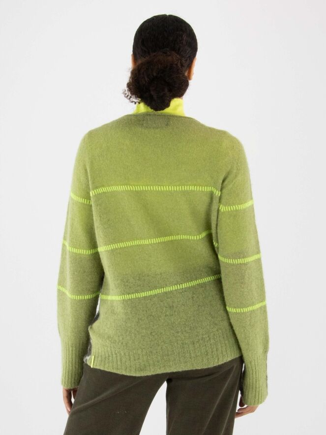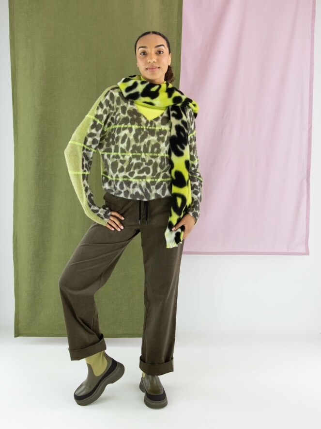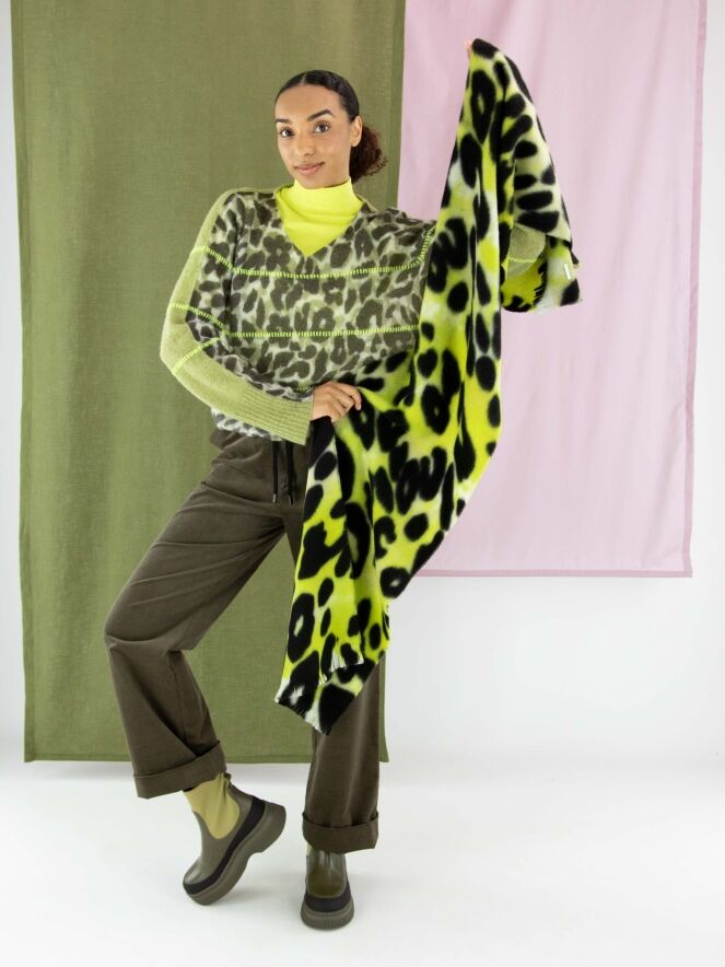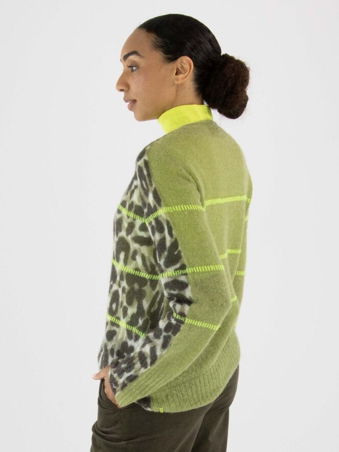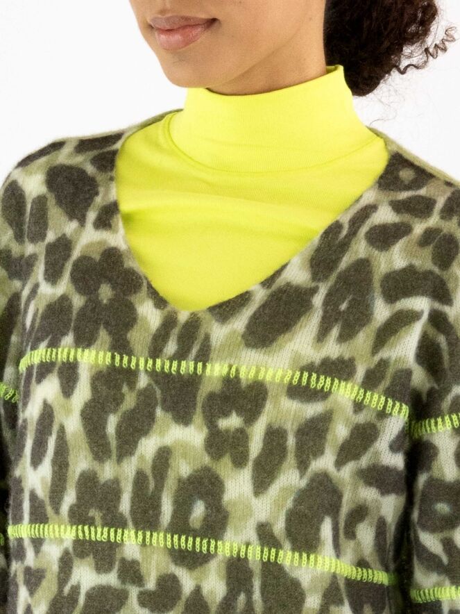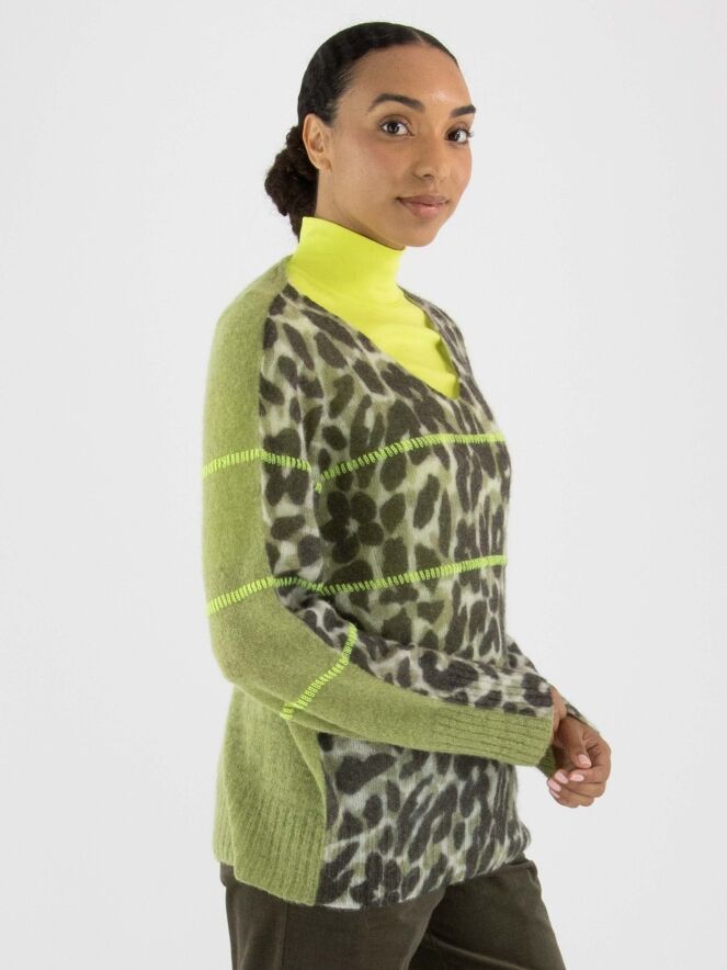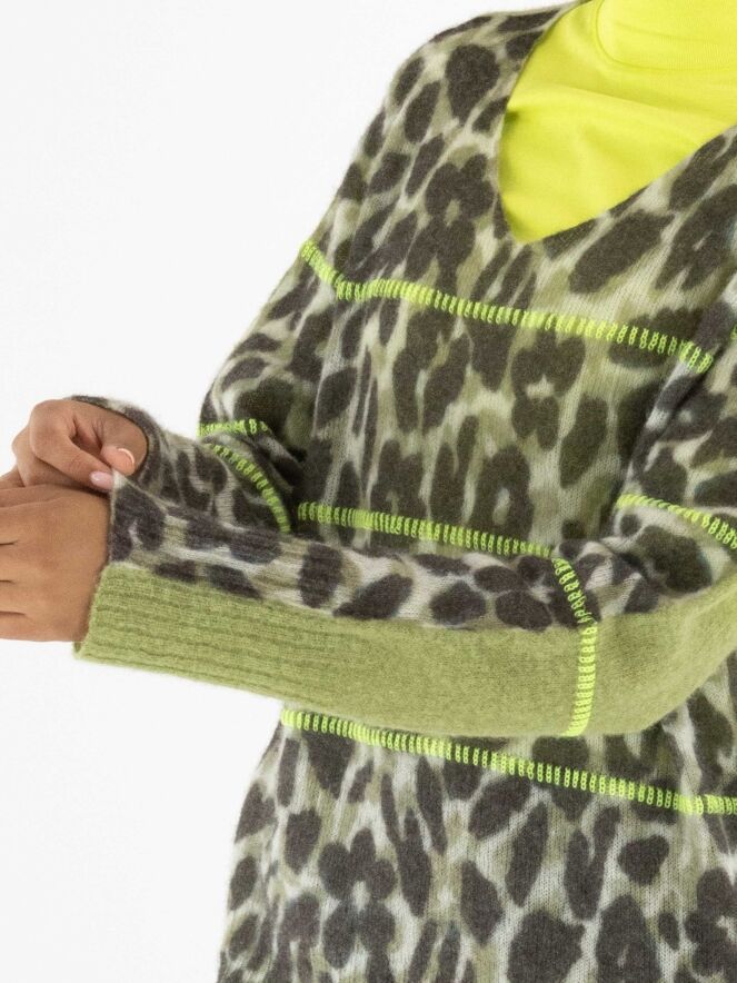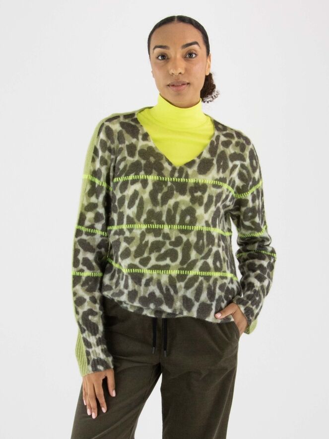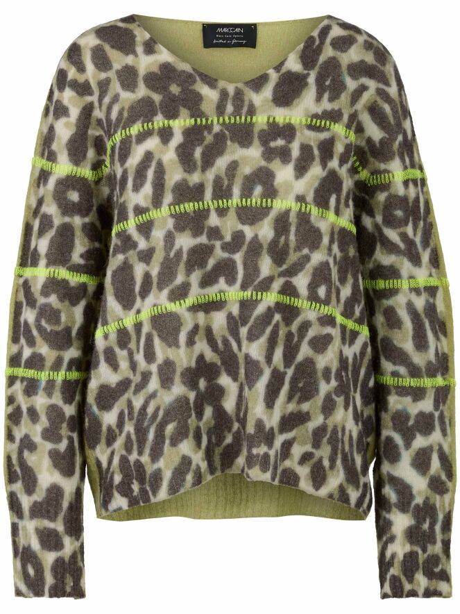 A pullover by Marc Cain featuring a leopard print in various shades of olive green and off-white. The back is in a solid pistachio green colour. Three lime green lines are knitted into the pullover. It has a V-neckline and should be hand washed.