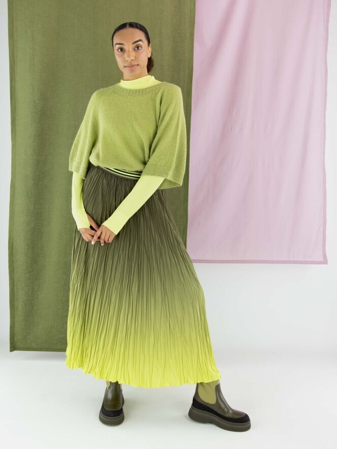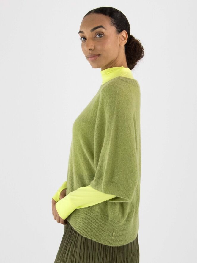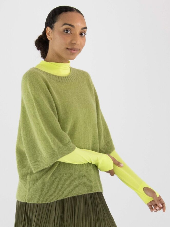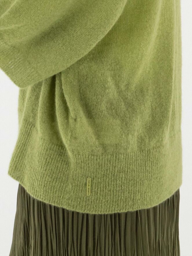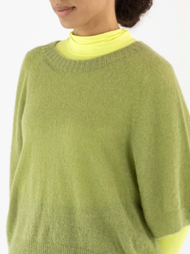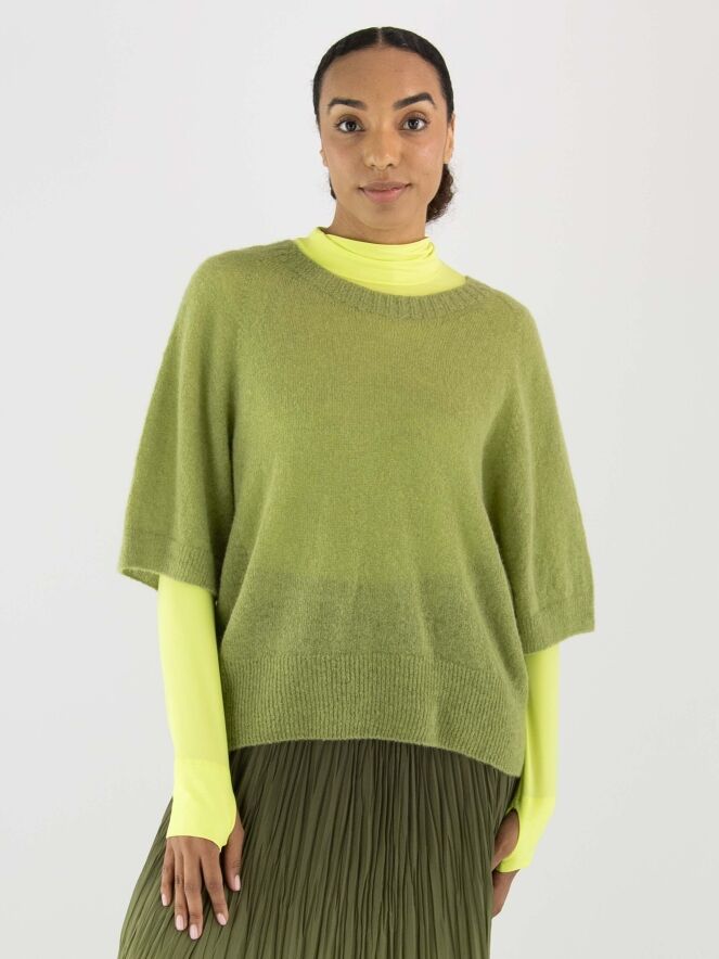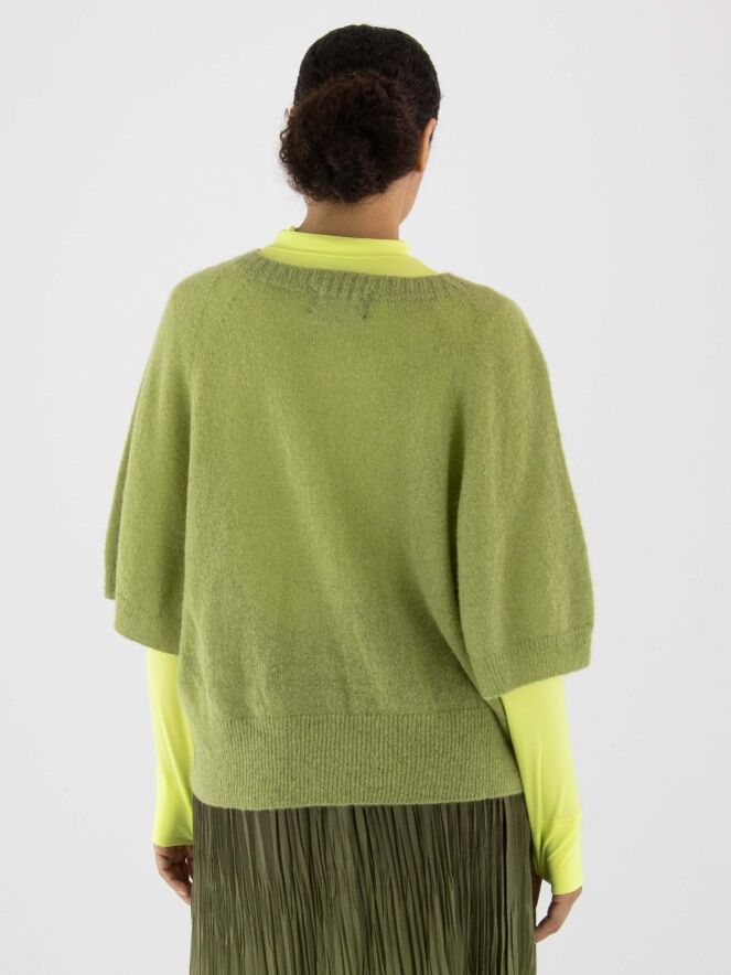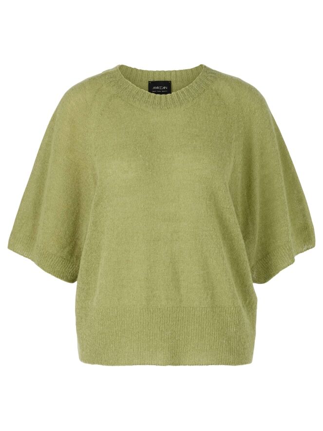A mottled pullover by Marc Cain in pistachio green. The pullover features a round neckline and short sleeves. This pullover should be hand-washed.