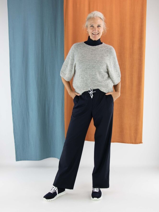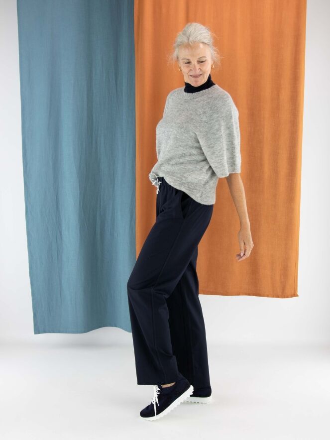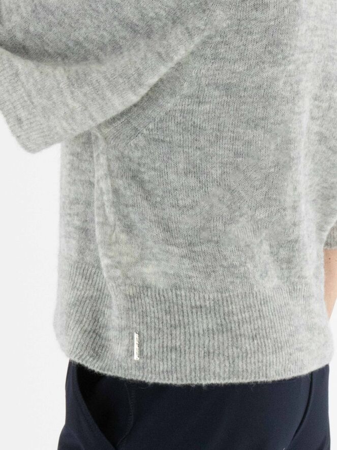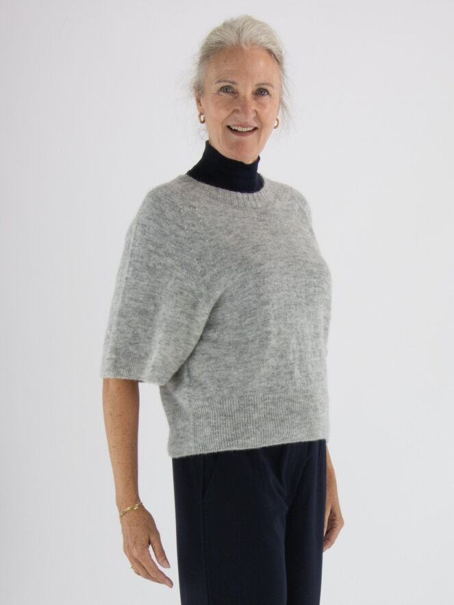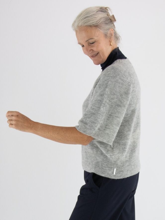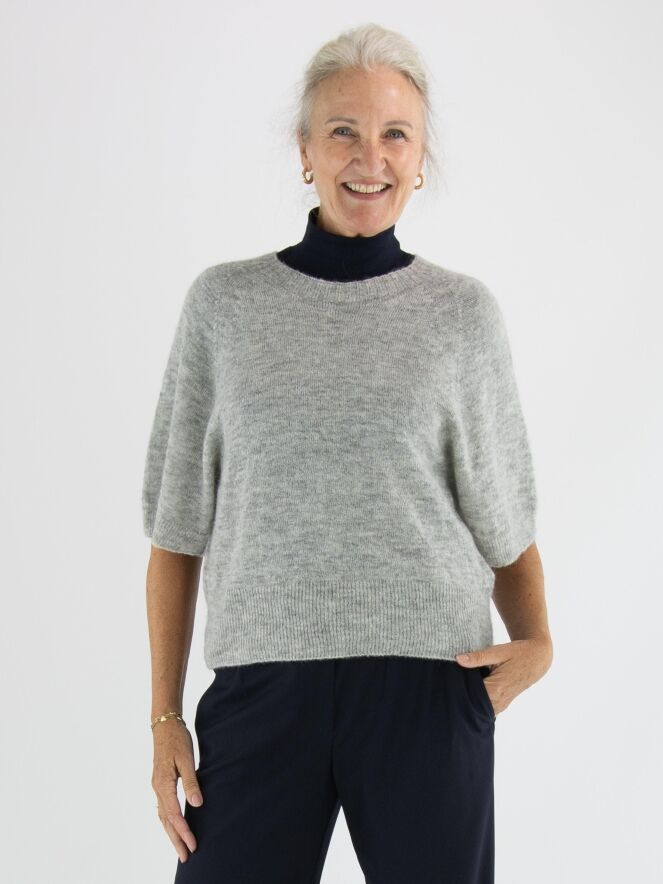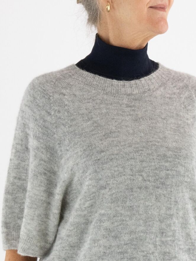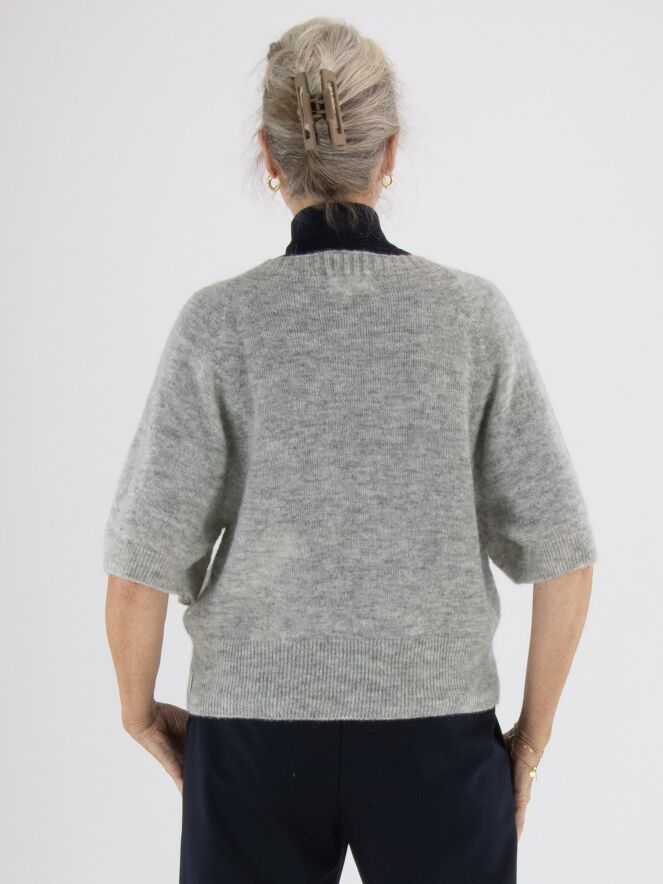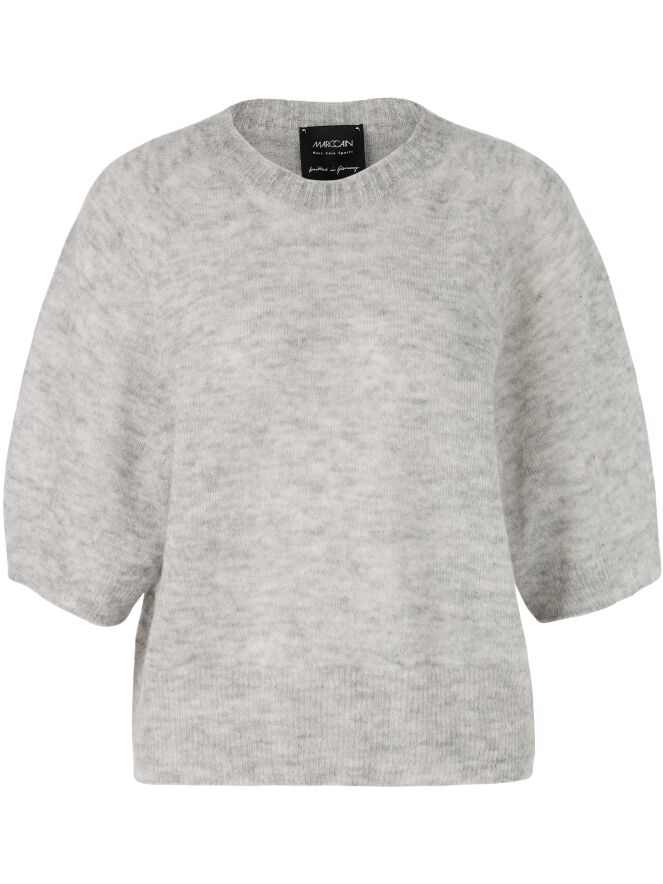 A mottled pullover by Marc Cain in various shades of grey. The pullover features a round neckline and short sleeves. This pullover should be hand washed.