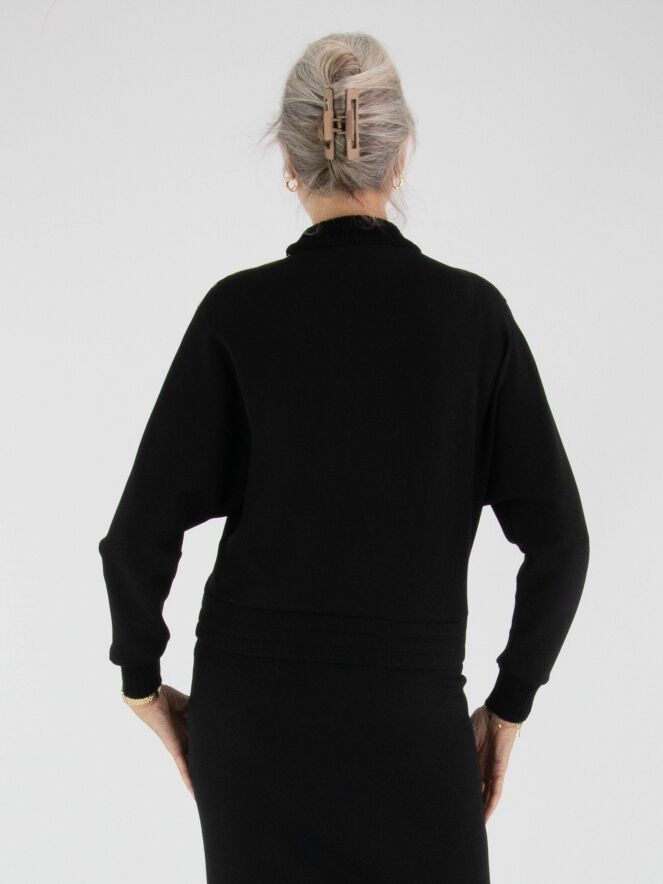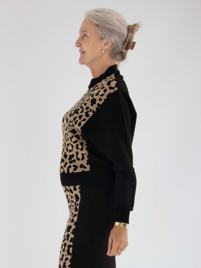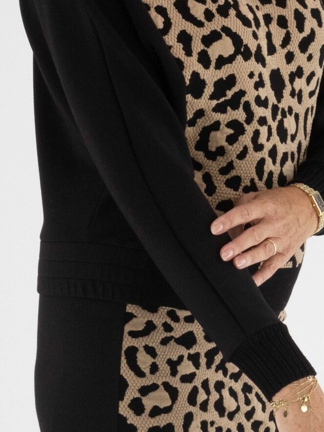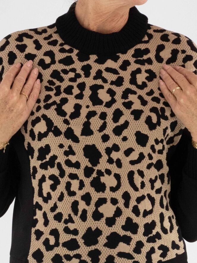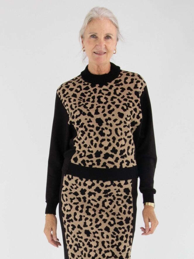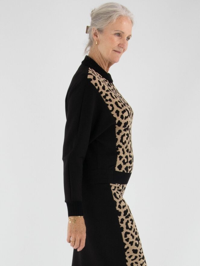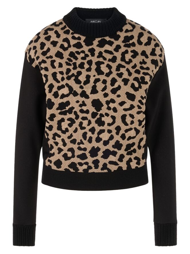 A pullover by Marc Cain with a leopard print in camel and black on a finely perforated fabric at the front, and a solid scuba fabric at the back. The round neckline and sleeve ends are finished with ribbed knit trims. The hem features a pleated elastic band at the back and a fine knit trim at the front. This pullover can be washed at 30 degrees.