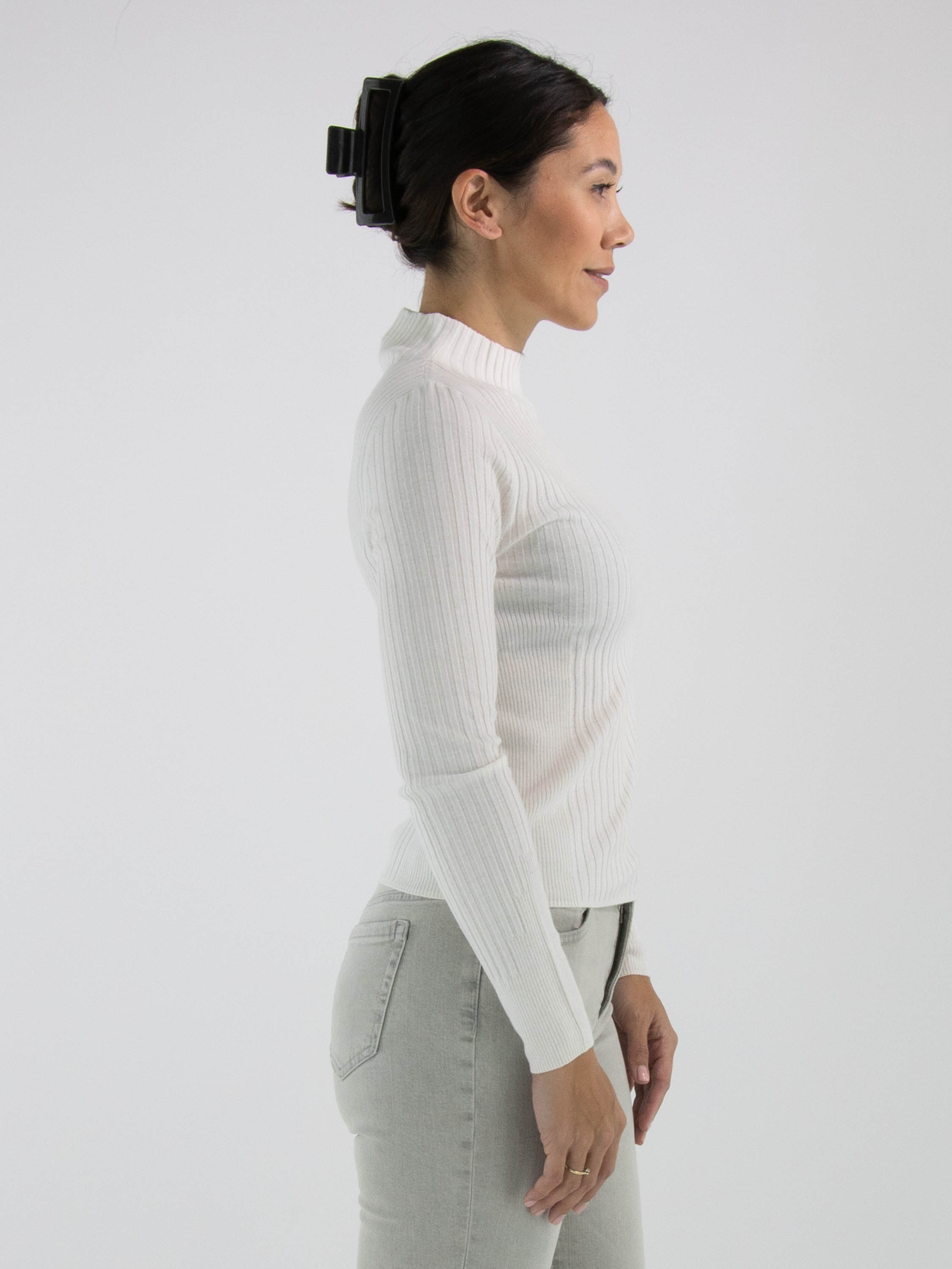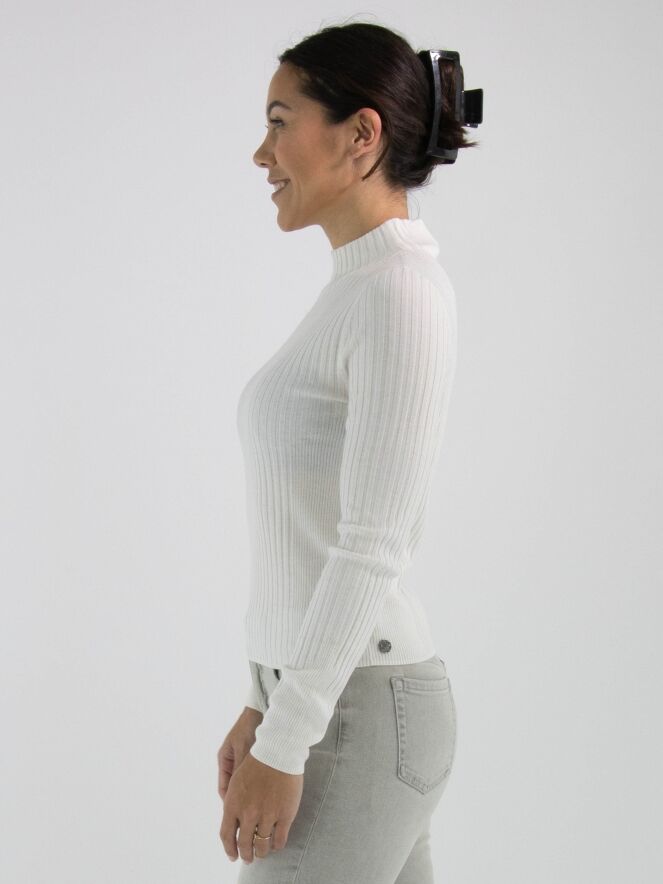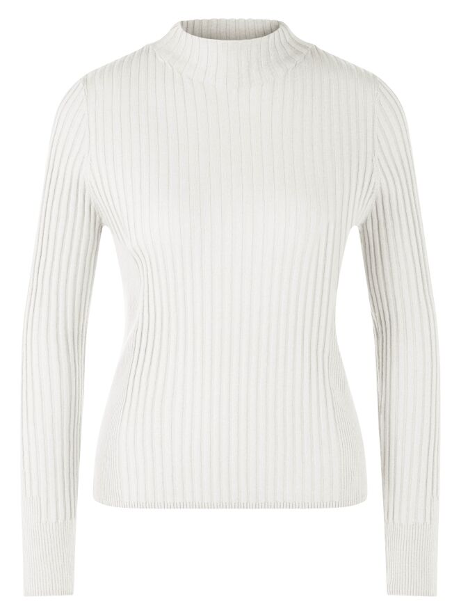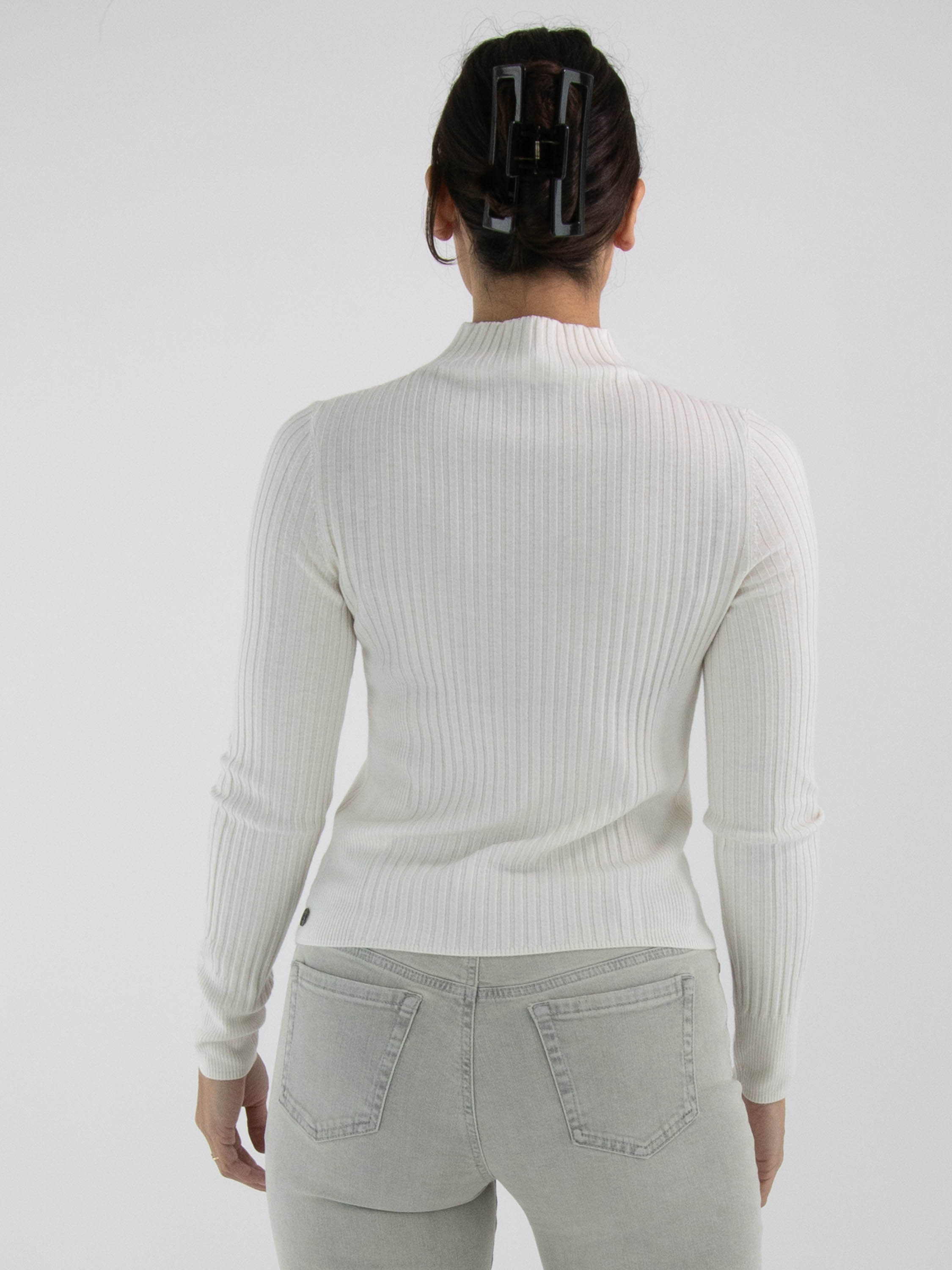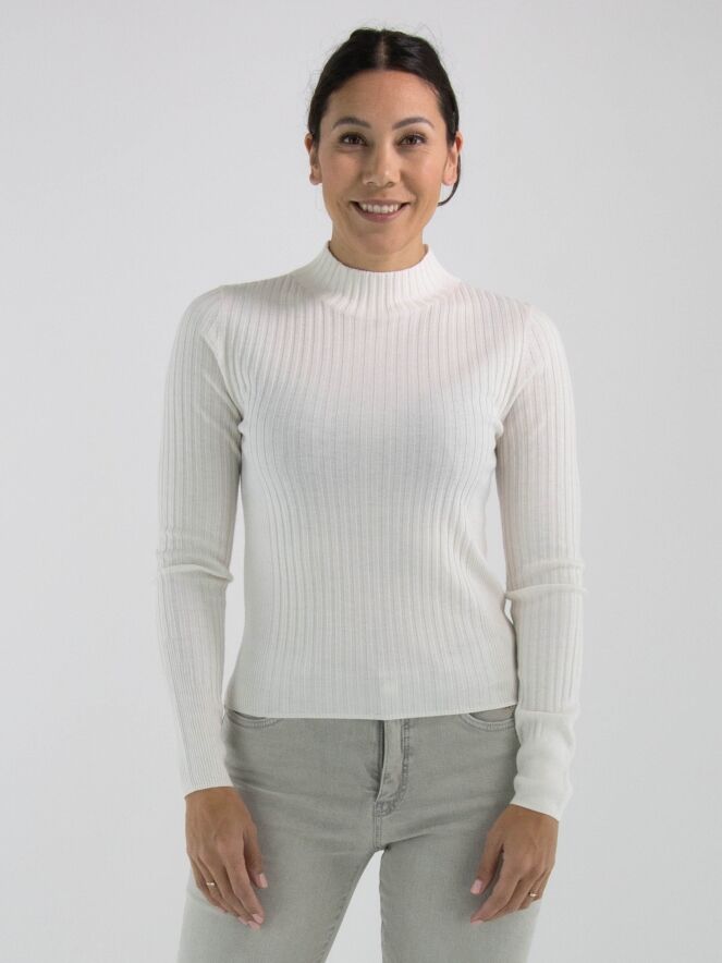 A stylish pullover from Marc Cain in a soft off-white shade. The sweater features a high turtle neck and long sleeves. The sides are detailed with a fine rib texture, adding an elegant touch. This pullover can be hand-washed.