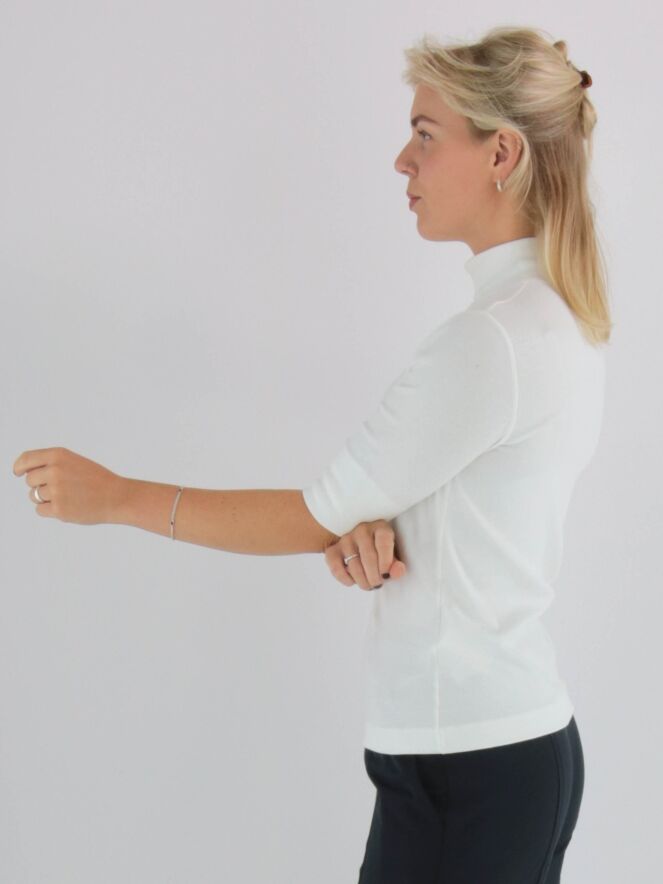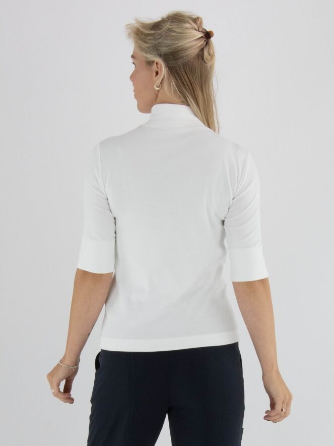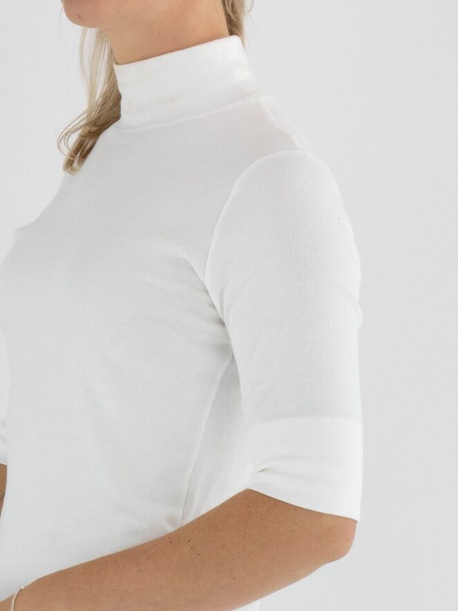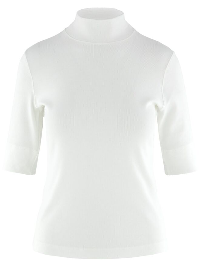 A shirt by Marc Cain in an off-white colour. The fabric is finely ribbed. The shirt features a turtleneck, short sleeves, and can be washed at 30 degrees.