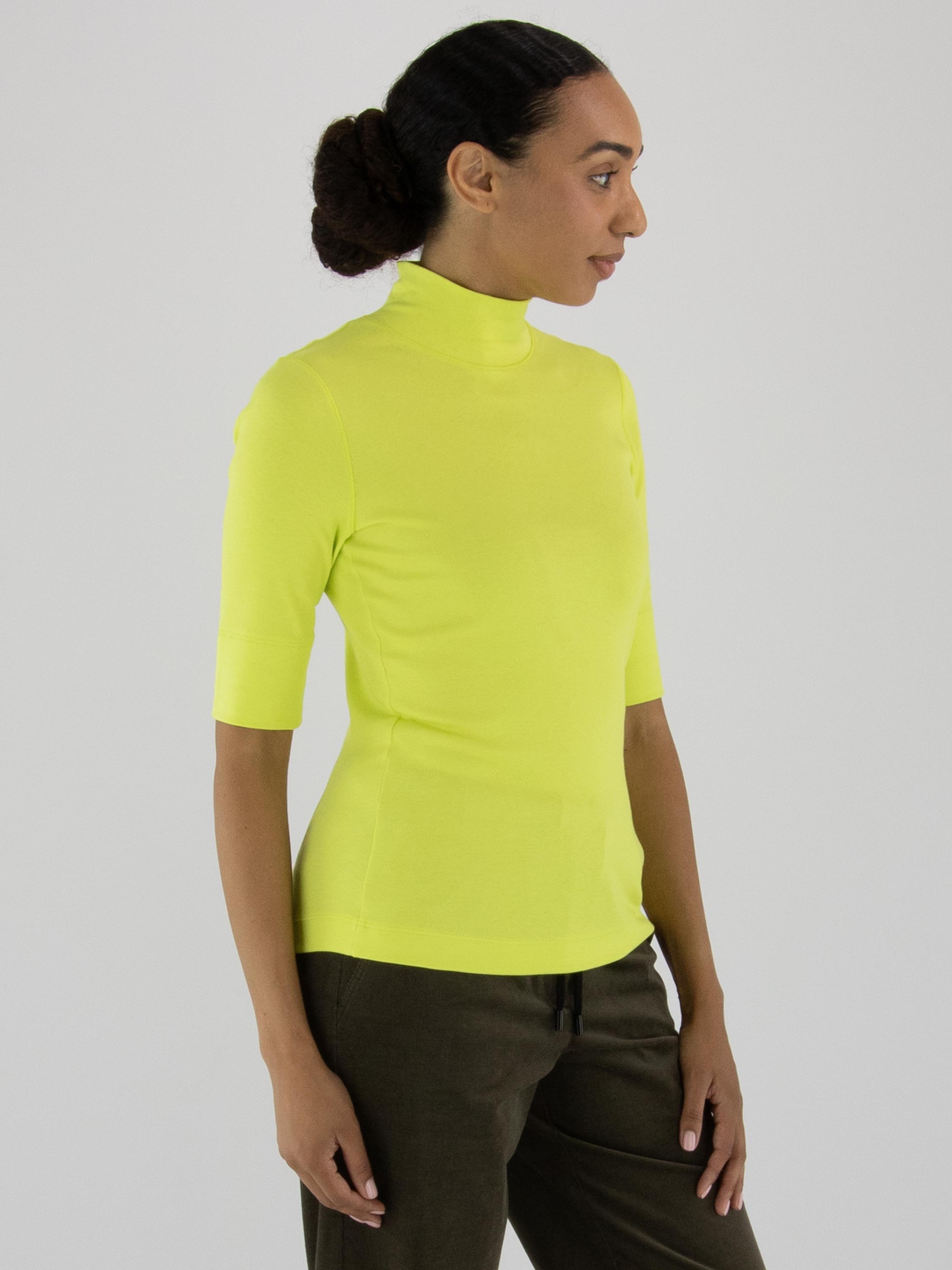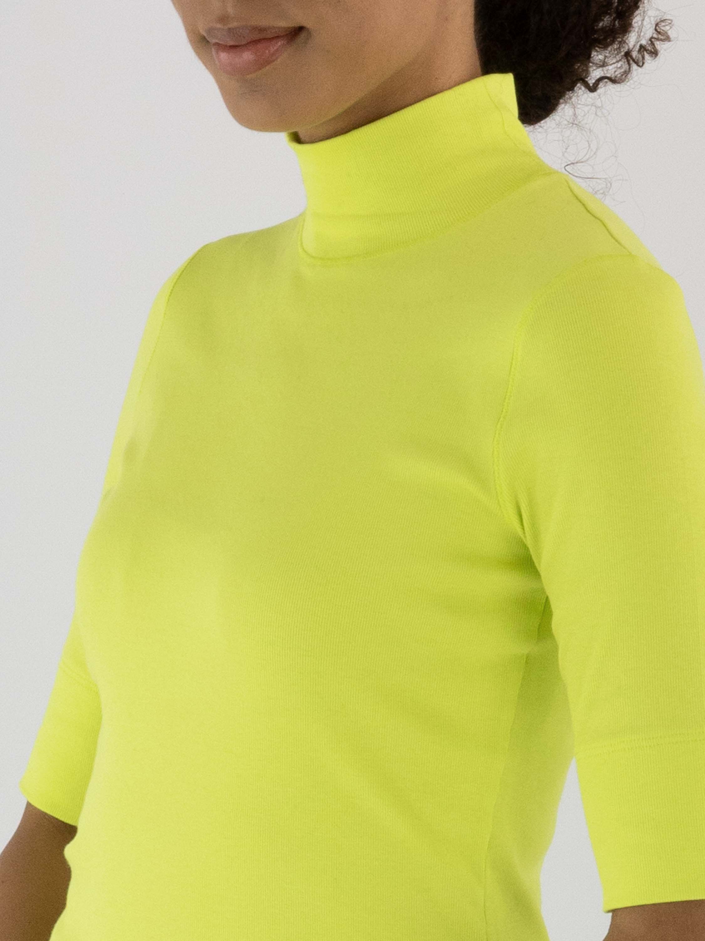 A shirt by Marc Cain in lime green. The fabric is finely ribbed. The shirt features a turtle neck, short sleeves, and can be washed at 30 degrees.