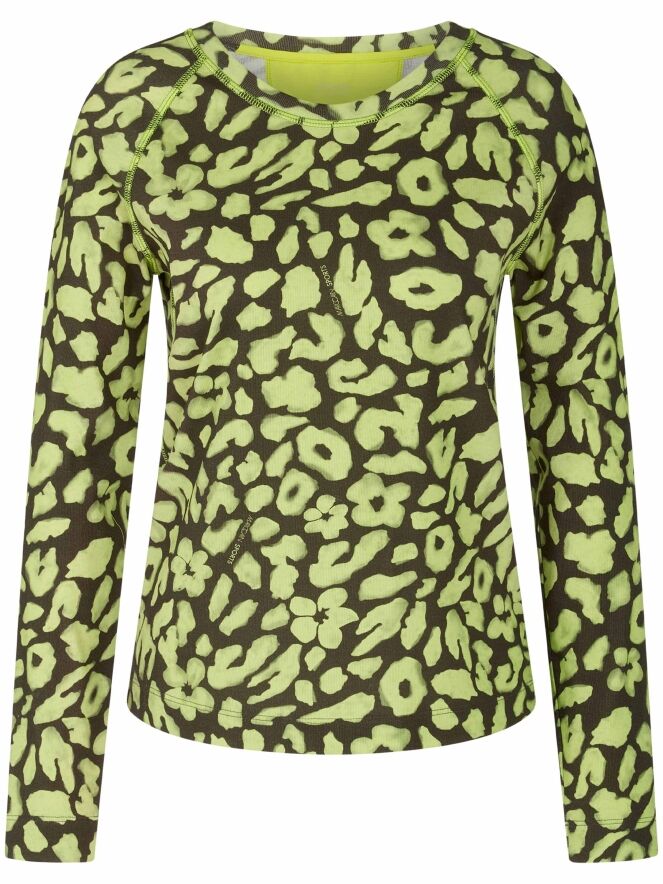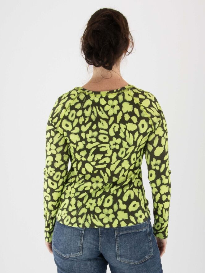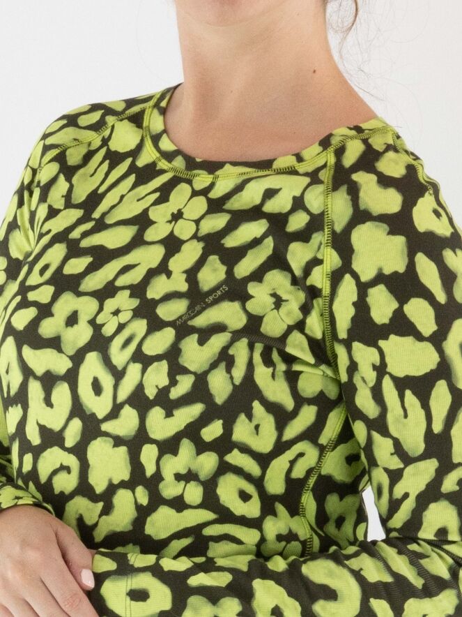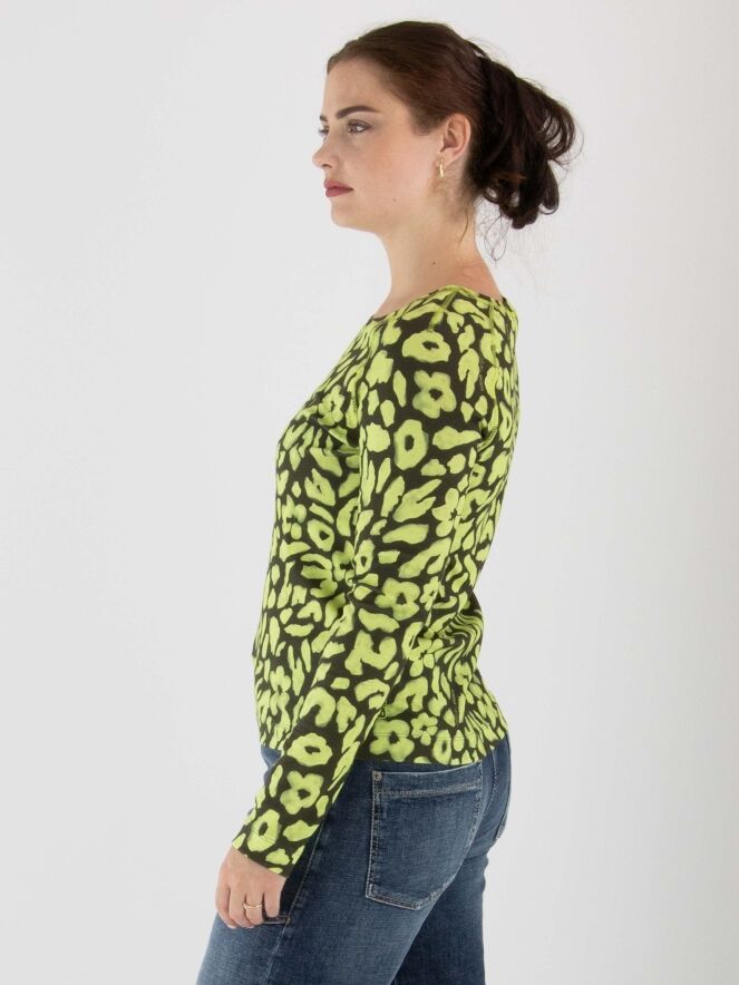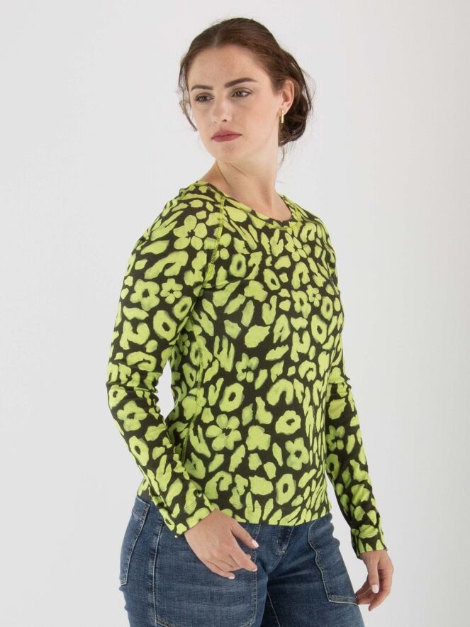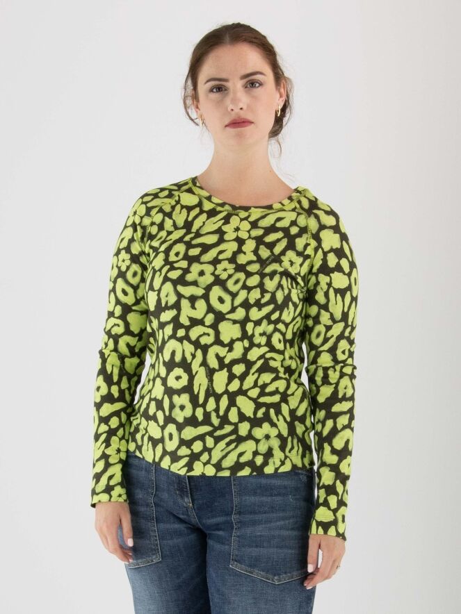 A shirt by Marc Cain in a leopard print with lime green and olive green tones. The shirt features a round neckline and long sleeves. This shirt can be washed at 30 degrees.