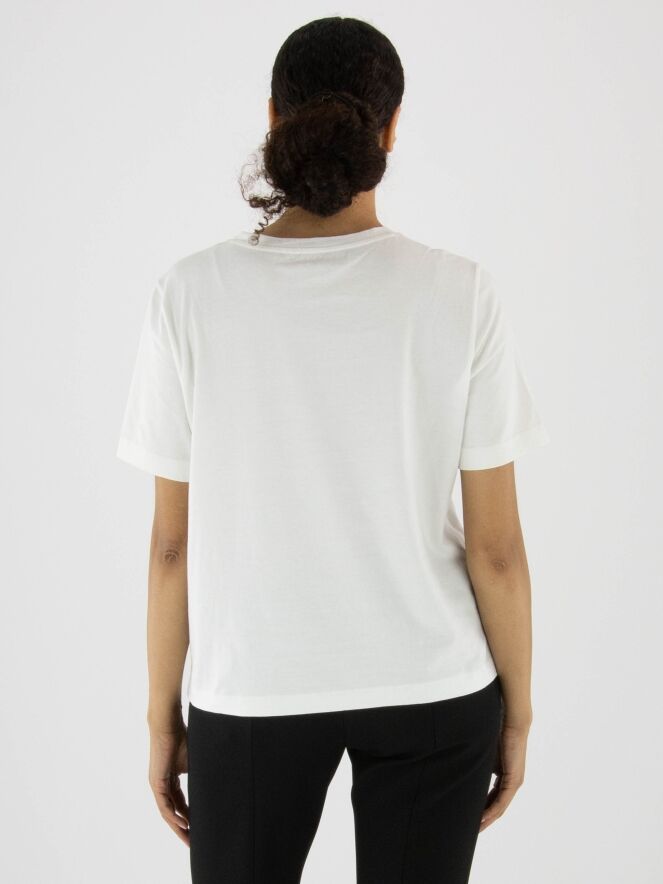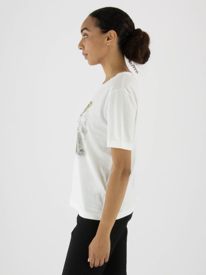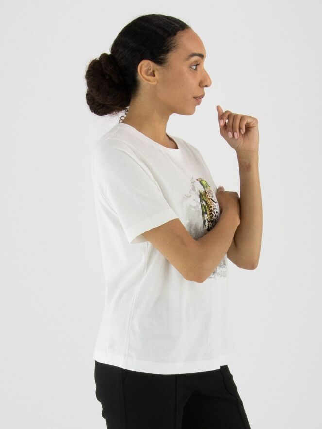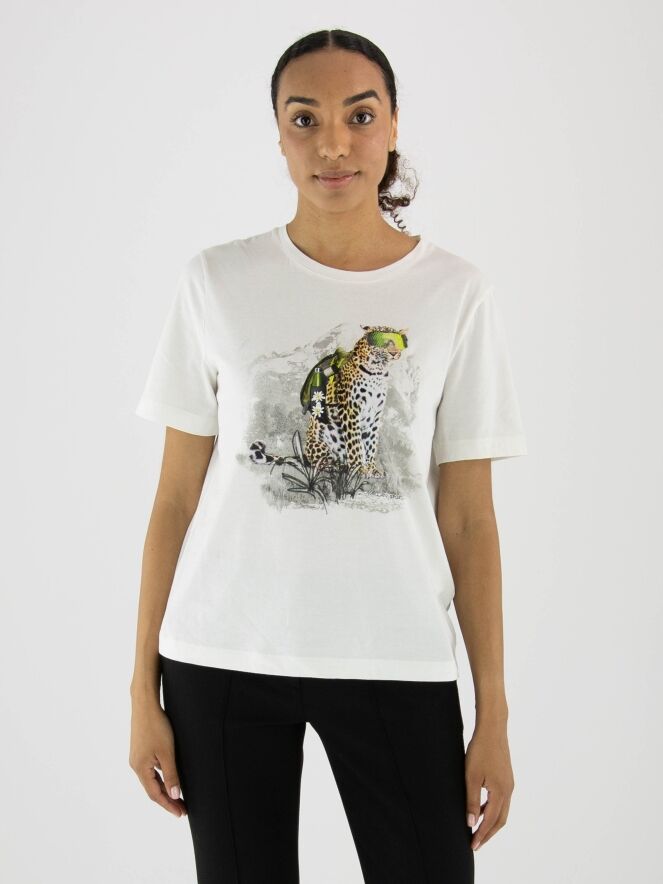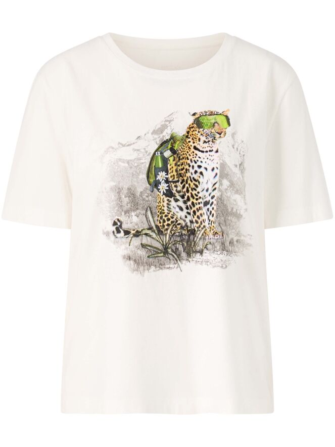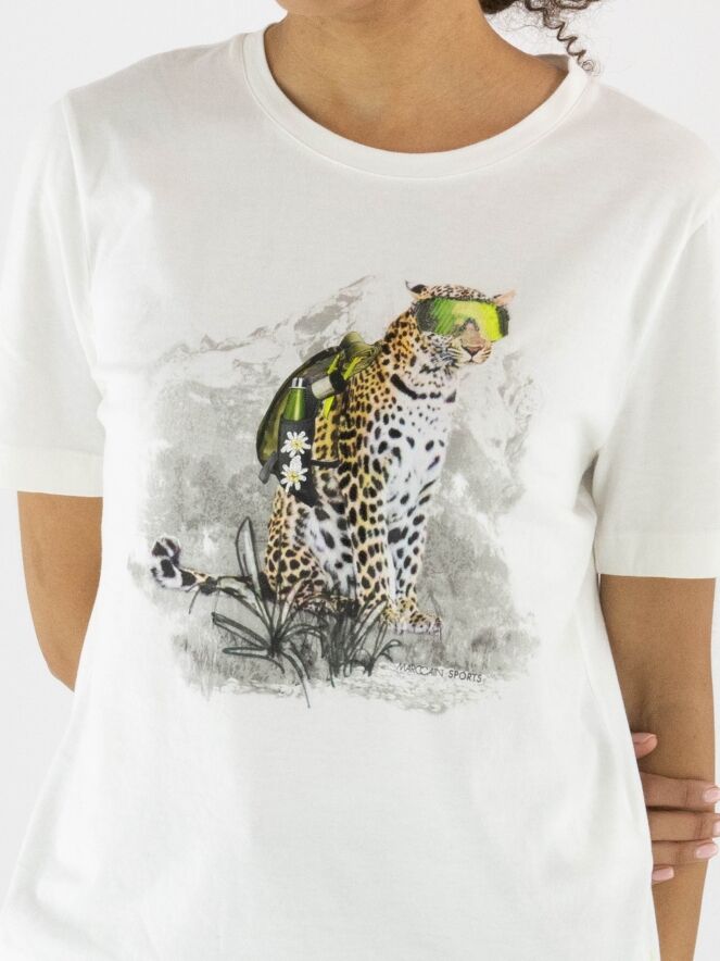 A Marc Cain shirt in off-white with a front print of a leopard wearing sunglasses. The shirt has short sleeves and a round neckline. This shirt can be washed at 30 degrees.