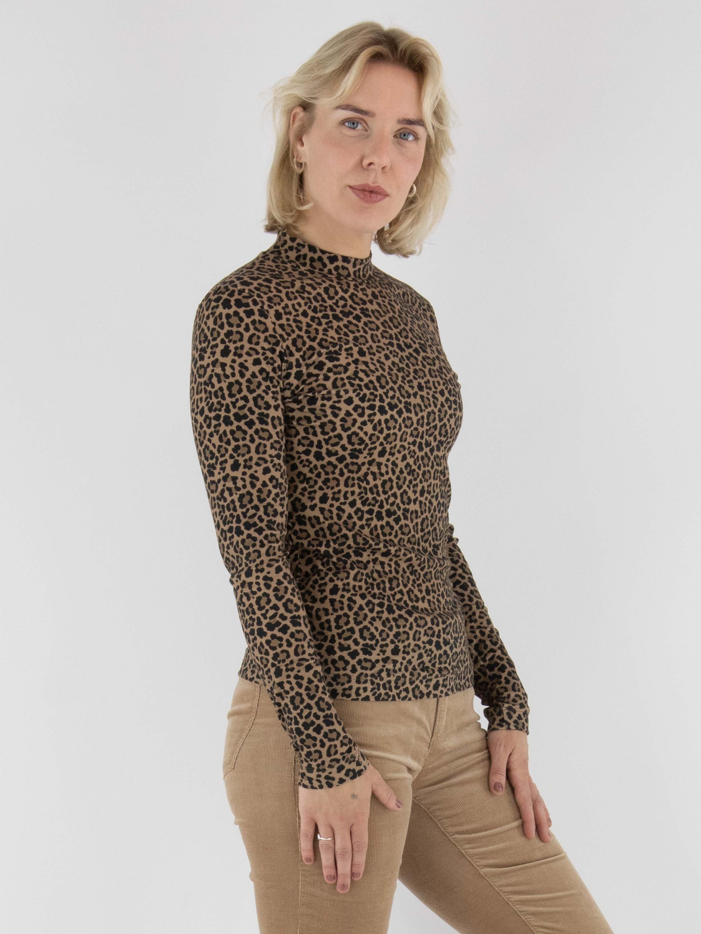 A finely ribbed pullover from Marc Cain in a leopard print with shades of brown and black. The pullover features a turtle neckline and long sleeves. This style can be washed at 30 degrees.
