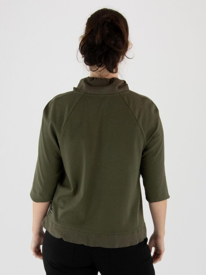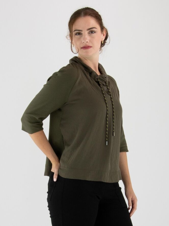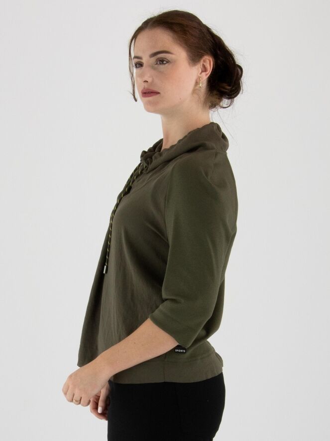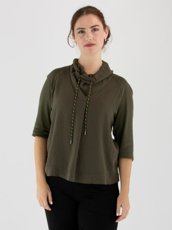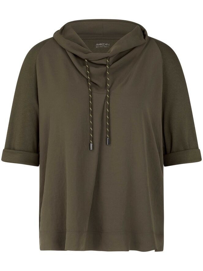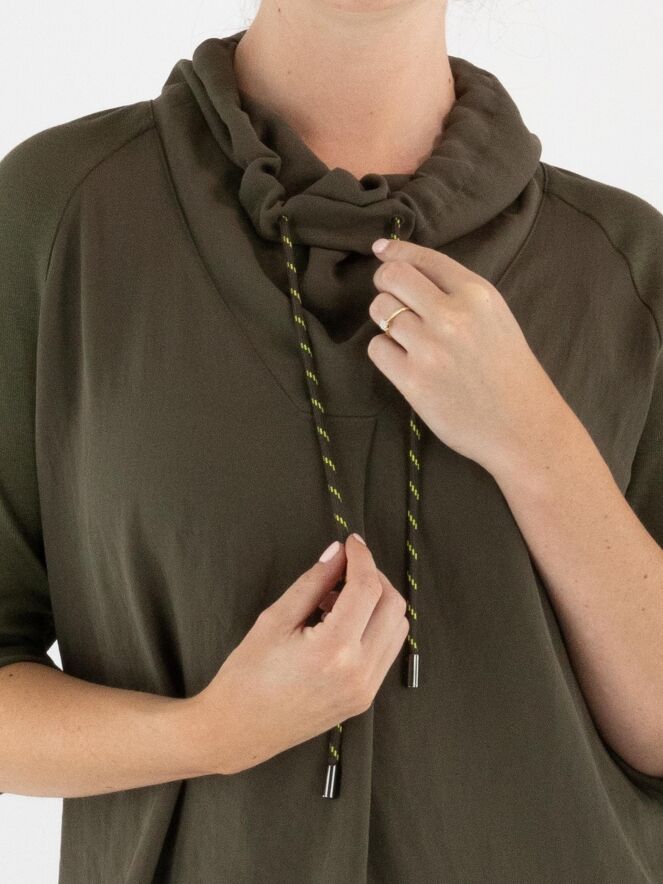 A shirt by Marc Cain in olive green. A drawstring is inserted into the edge of the draped neckline. The short sleeves are finished with a turn-up. This shirt can be washed at 30 degrees.