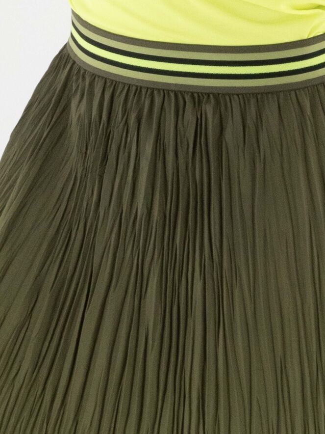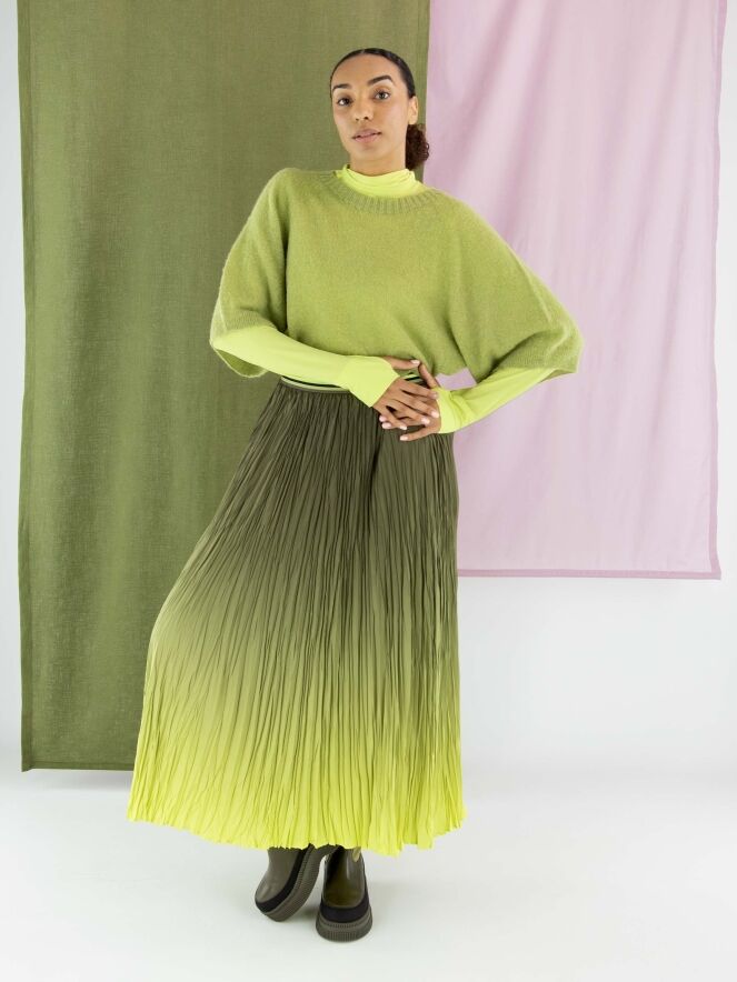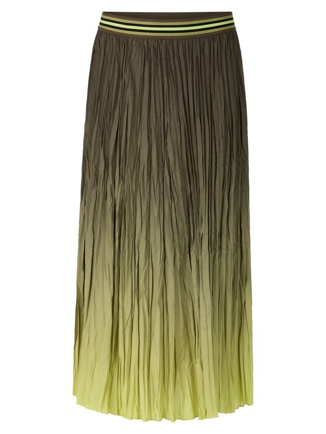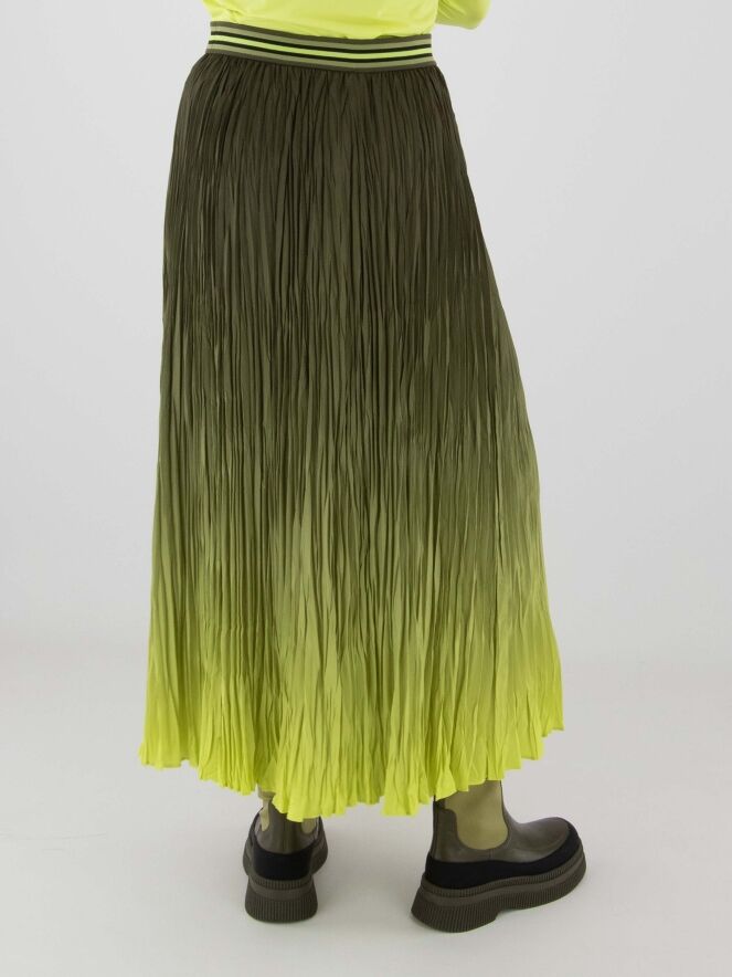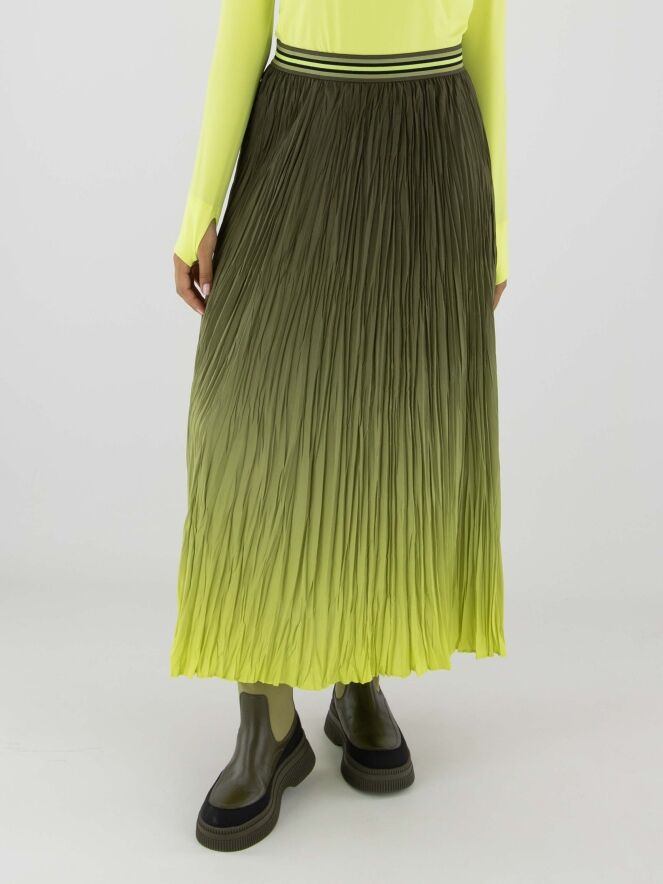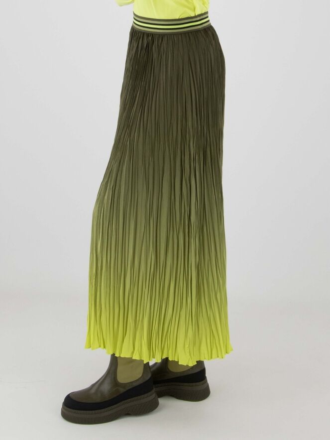 A pleated skirt by Marc Cain in a gradient from olive green to lime green. The waistband features an elastic band with a striped pattern. This skirt can be washed at 30 degrees.
