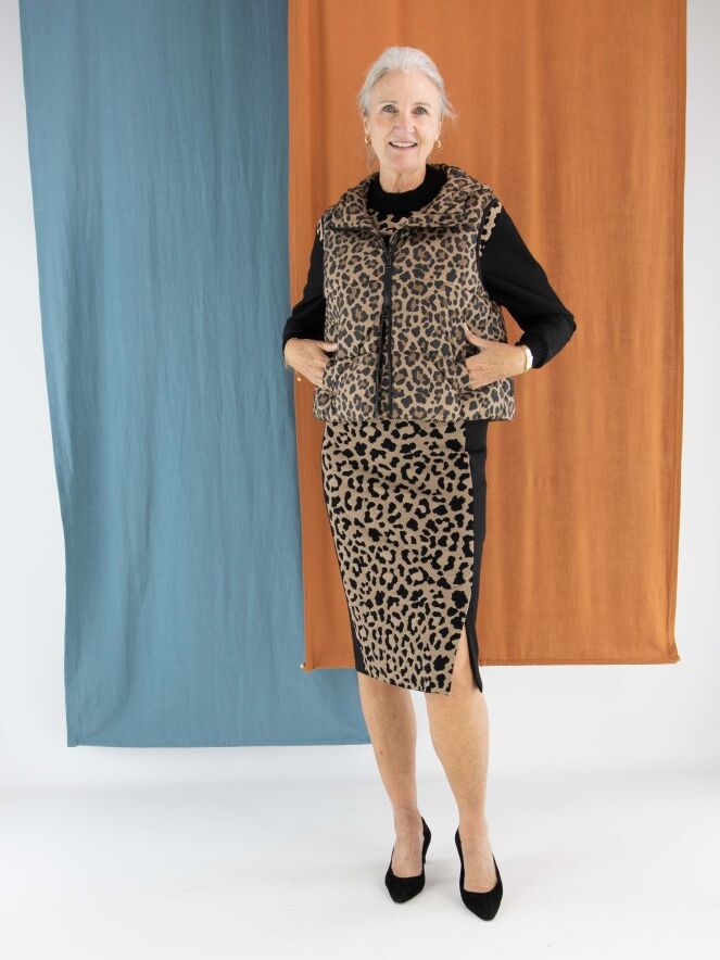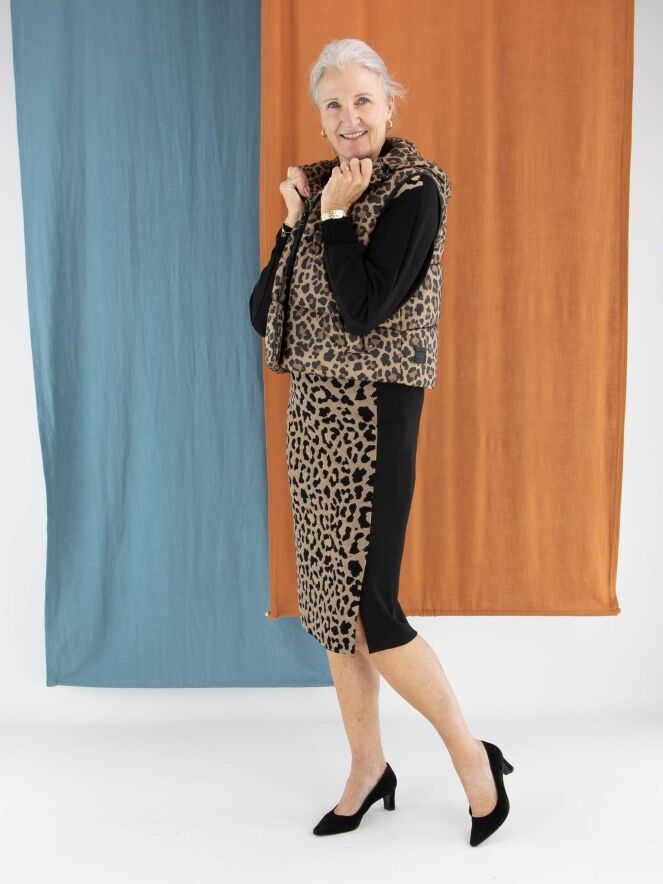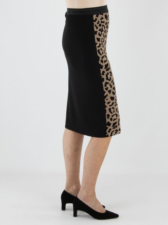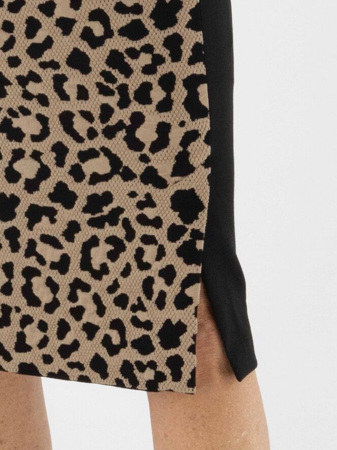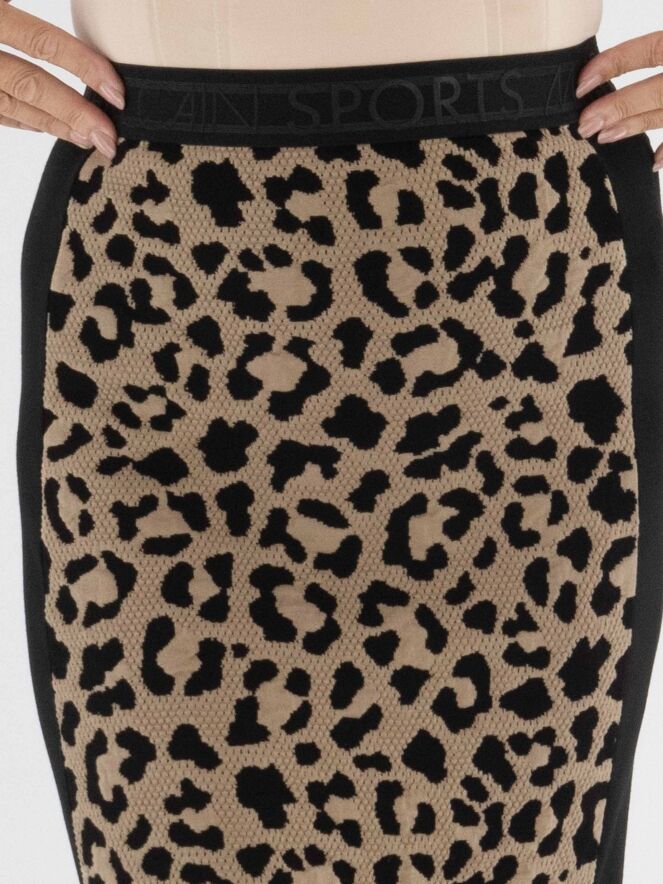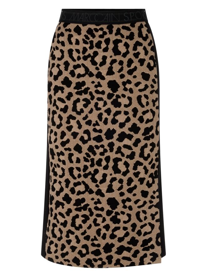A skirt from Marc Cain featuring a leopard print in camel and black on the front. The printed fabric is finely perforated, giving it a modern and refined look. The back is designed in solid black. At the waist, a comfortable elastic band ensures a perfect fit. The skirt is fully lined and can be washed at 30 degrees.
