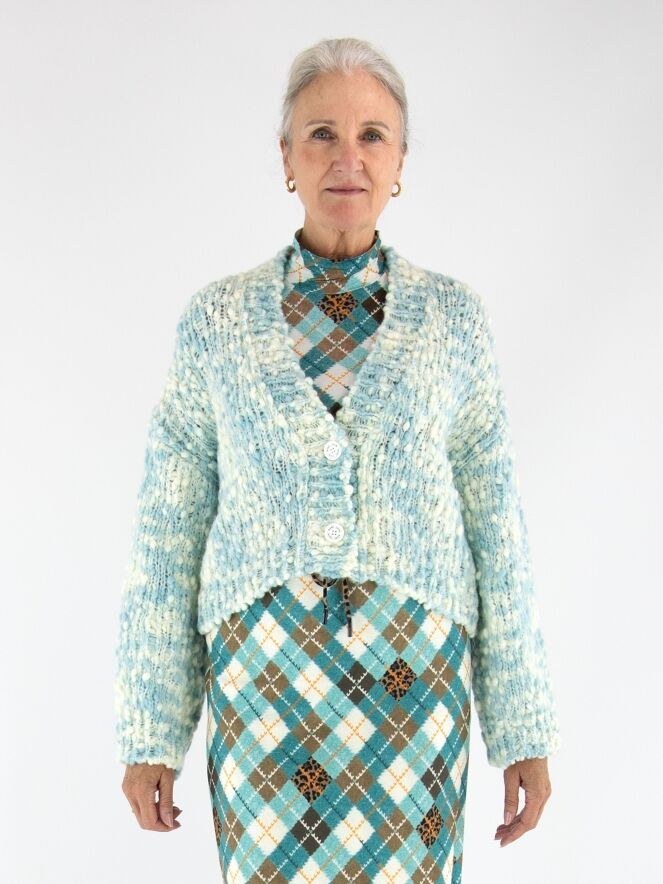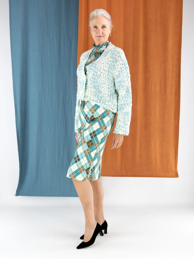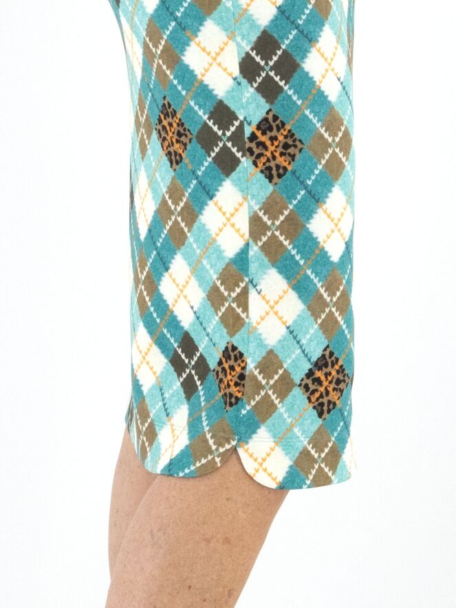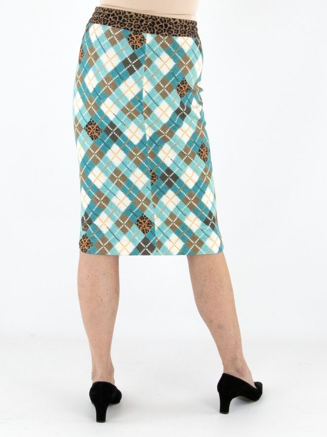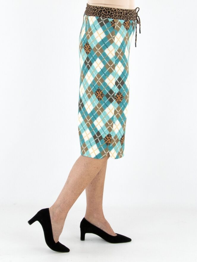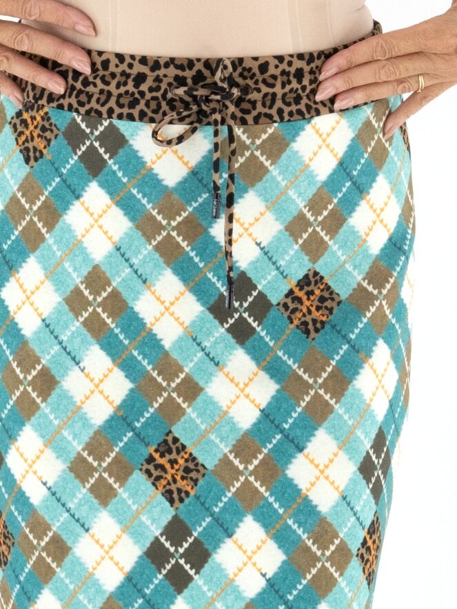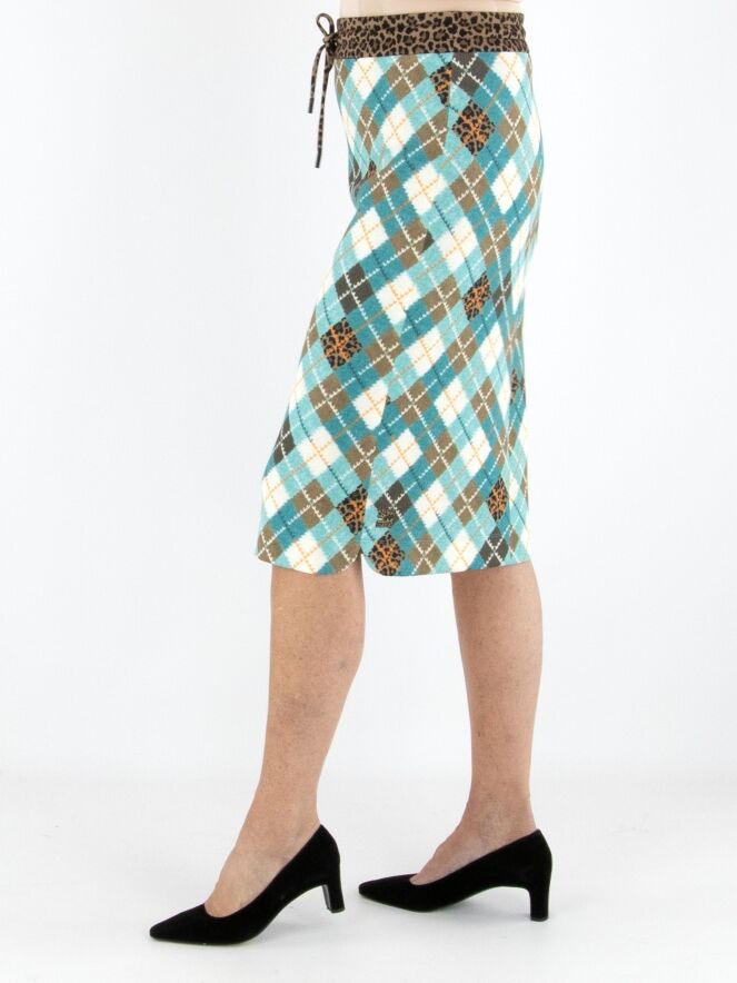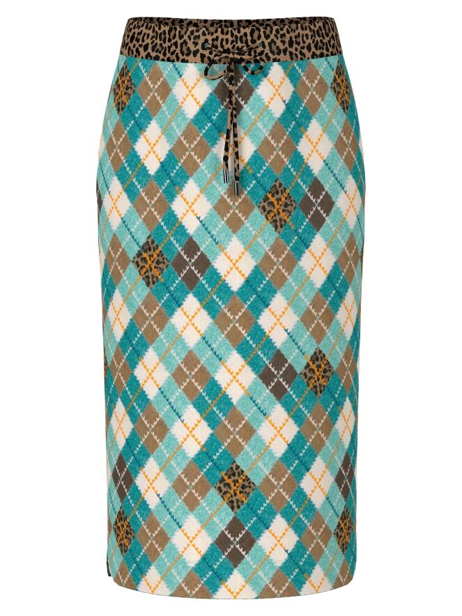A striking skirt from Marc Cain crafted from comfortable scuba fabric. The skirt features a classic argyle pattern in shades of turquoise, brown, orange, and off-white. At the waist, a wide elastic band in leopard print is finished with a drawstring tunnel for added comfort. The skirt is fully lined and can be washed at 30 degrees.