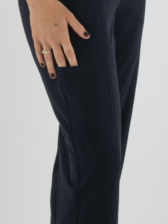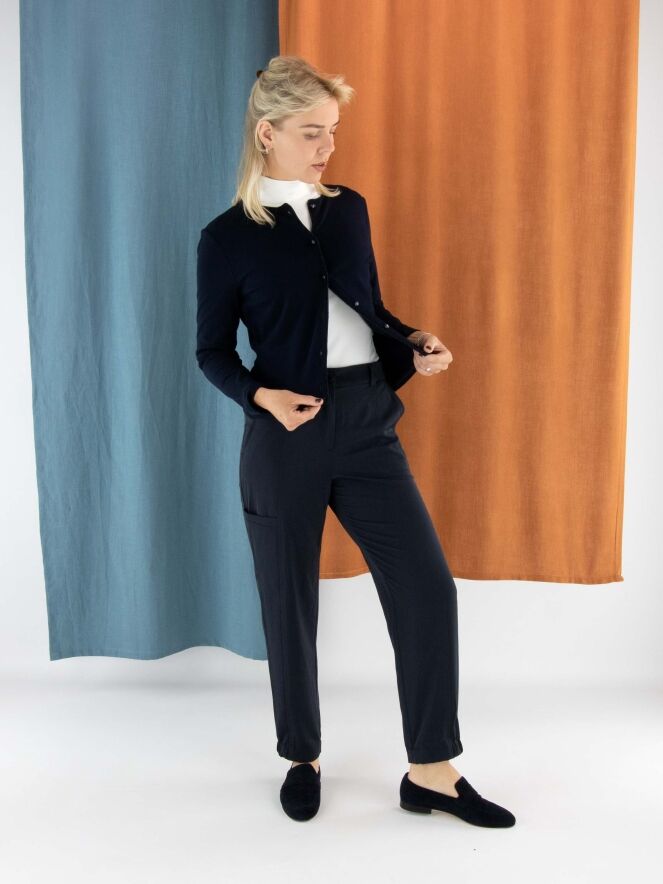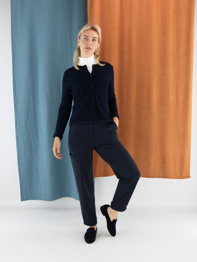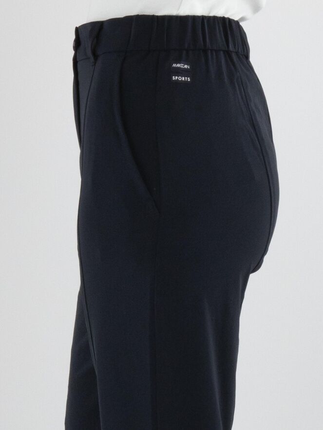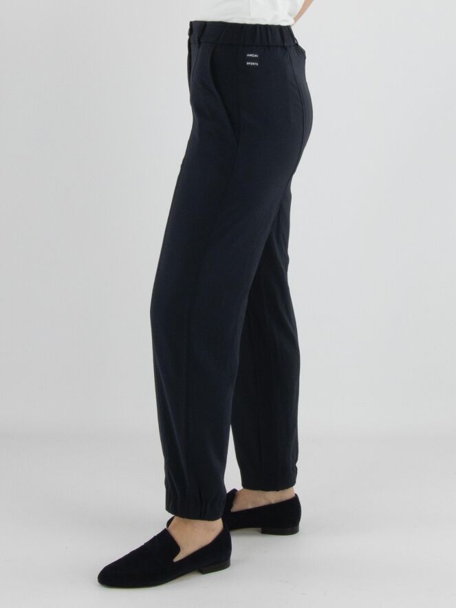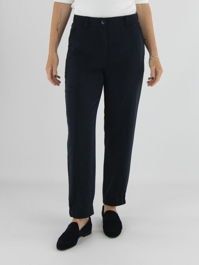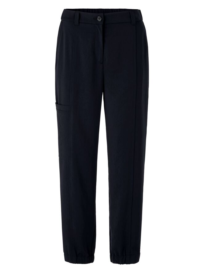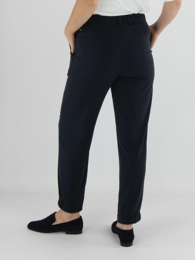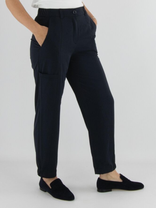 A cargo trousers by Marc Cain in a navy blue shade. The waistband features a finely gathered elastic band running from the sides to the back. The trouser legs are also finished with finely gathered elastic bands at the hem. These trousers can be washed at 30 degrees.