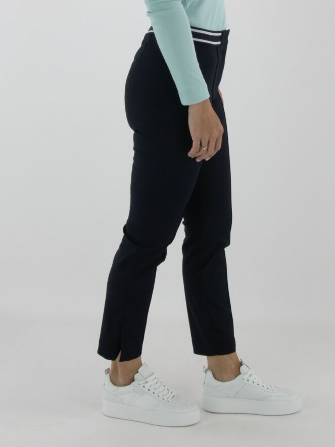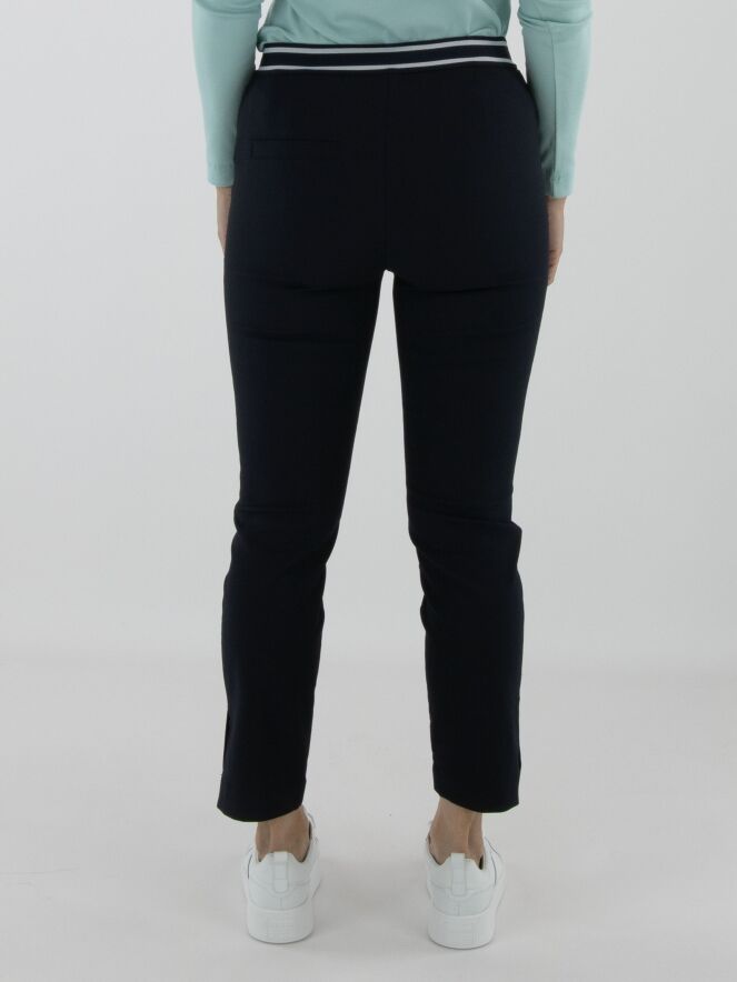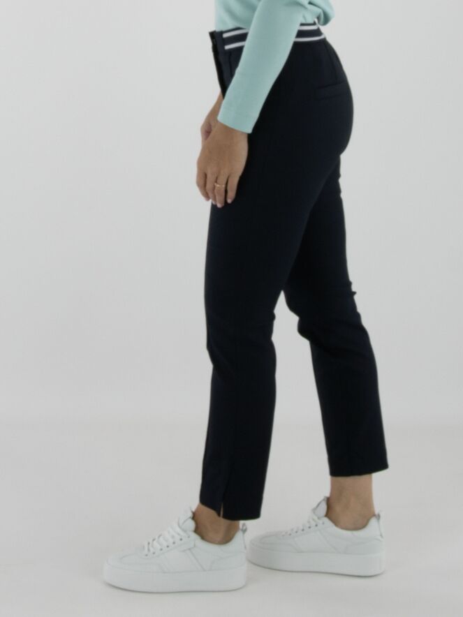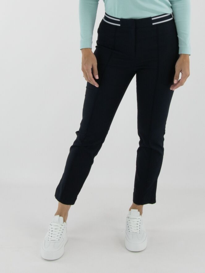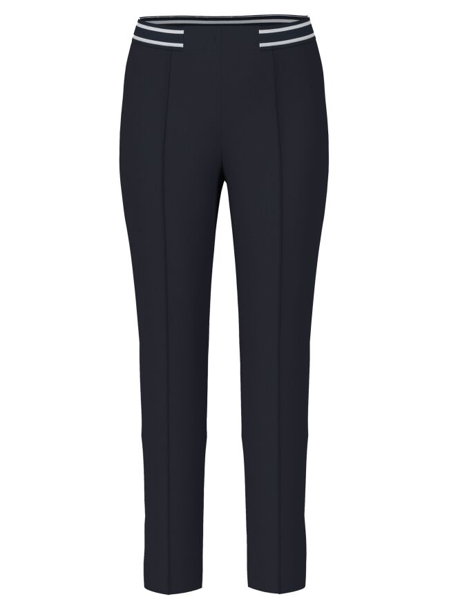 Trousers by Marc Cain in navy blue. The waistband features a striped elastic band. A reverse seam runs down the center front of the legs. These trousers can be washed at 30 degrees.