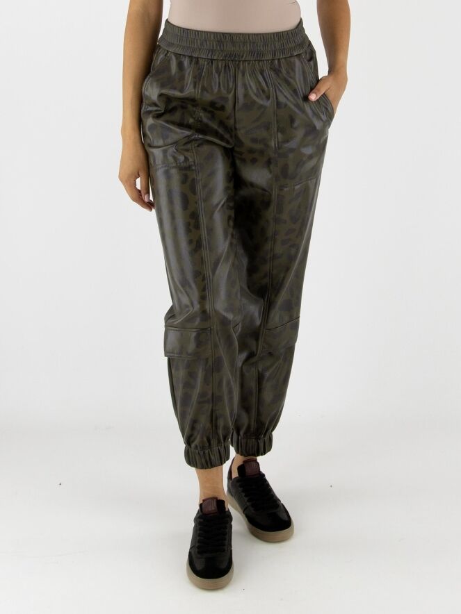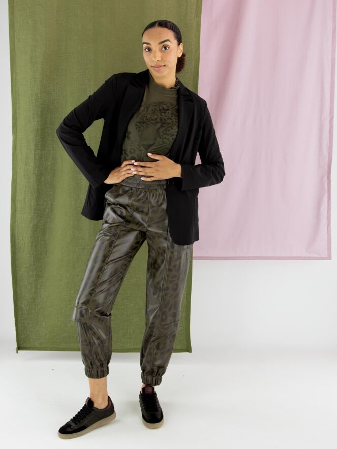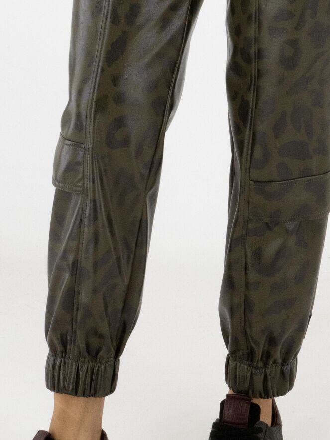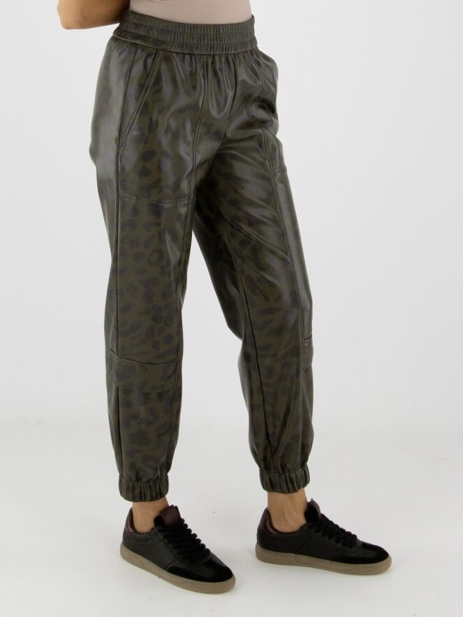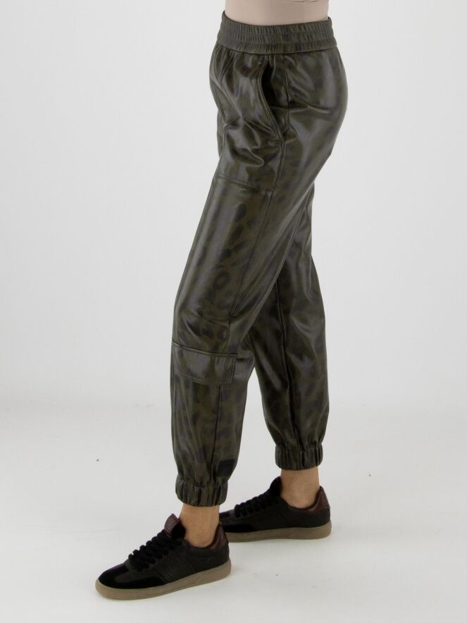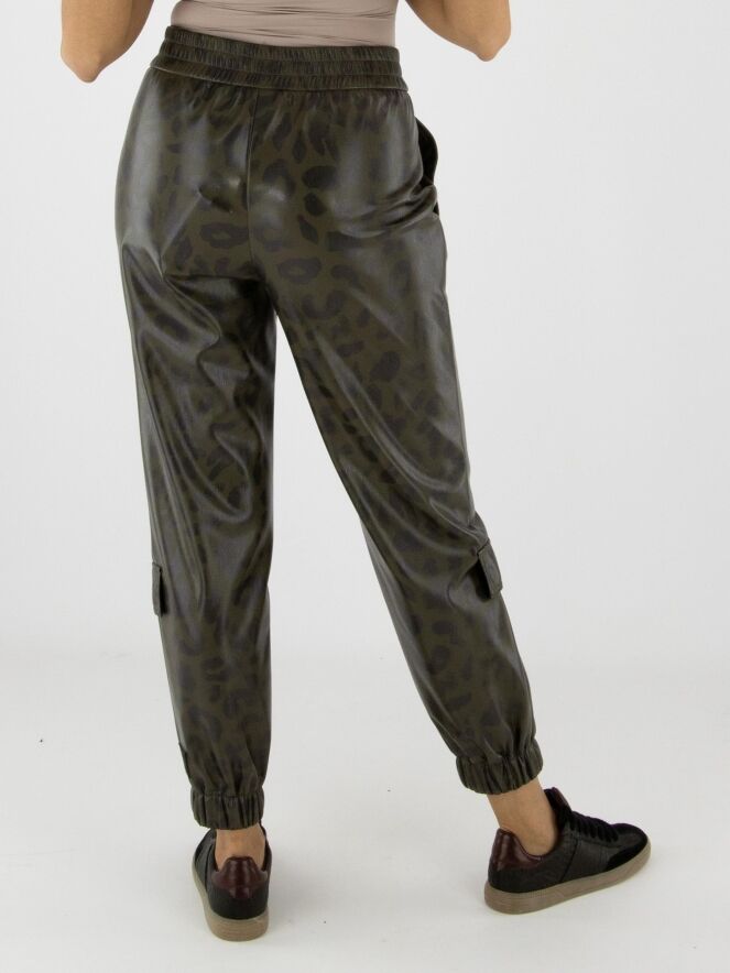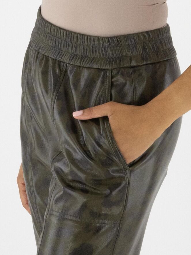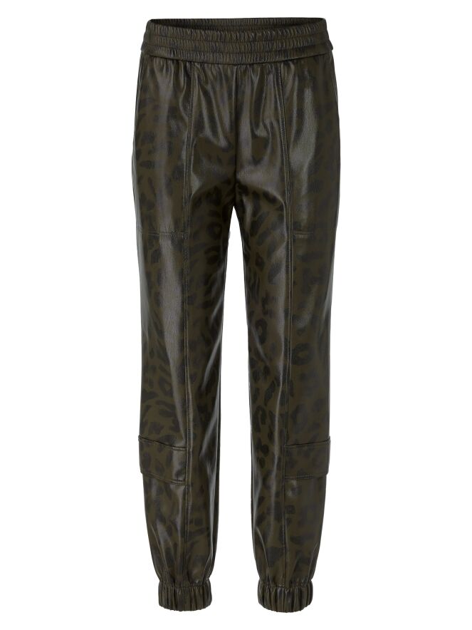 Trousers by Marc Cain in a wet-look finish with a leopard print in various shades of olive green and black. The waistband is finely ribbed and elasticated. A decorative turn-up detail is featured on the lower leg. These trousers have slit pockets and can be washed at 30 degrees.