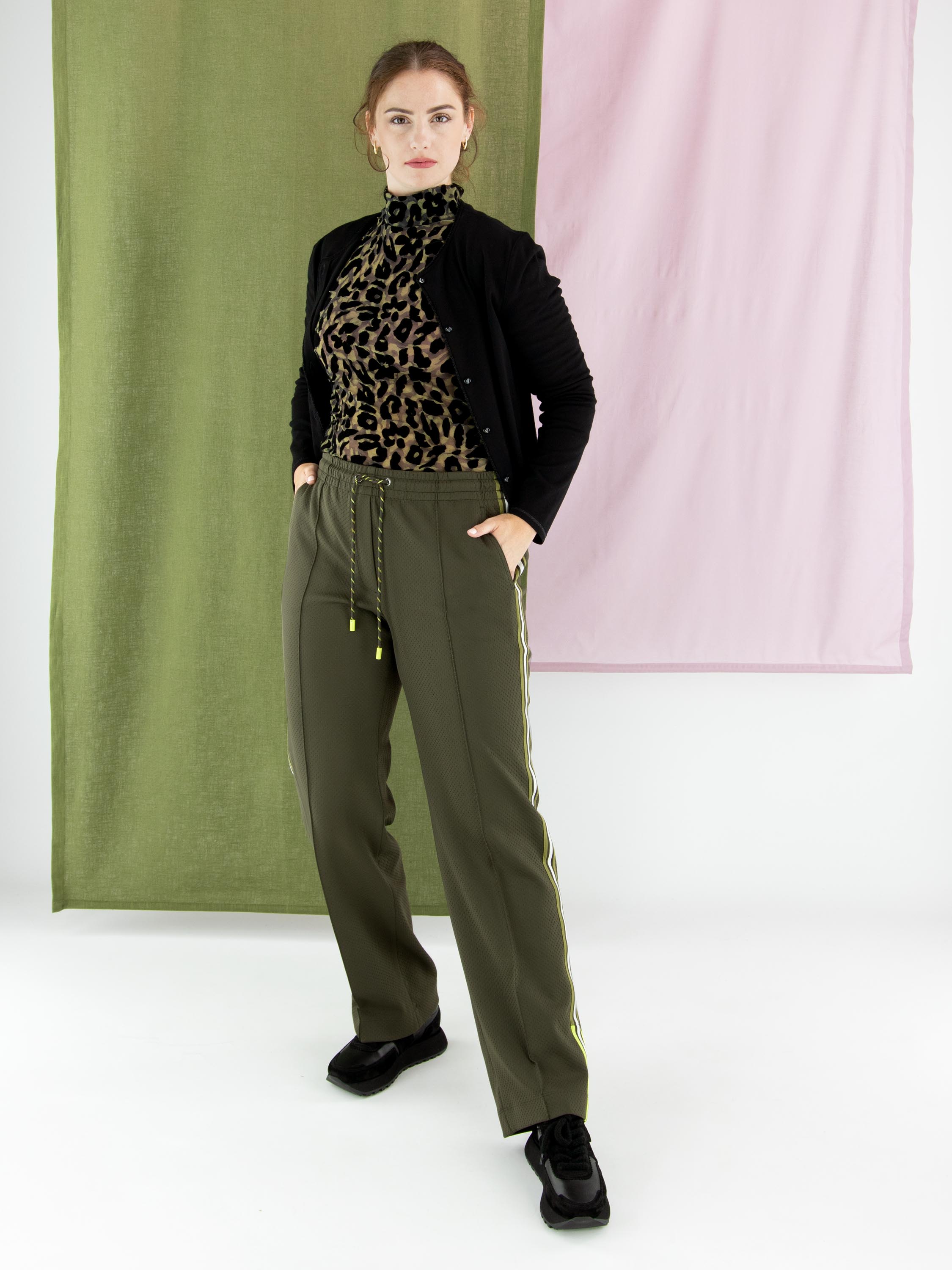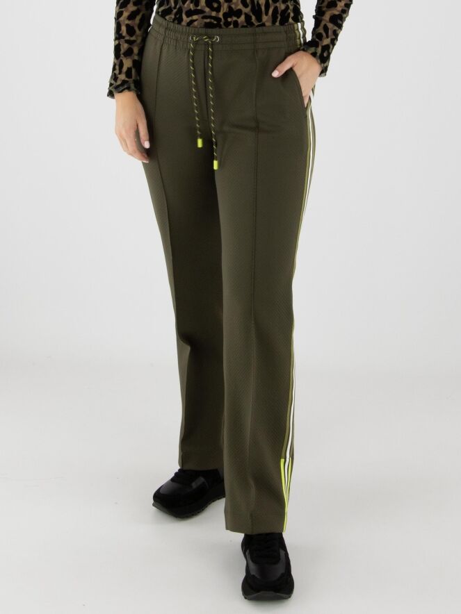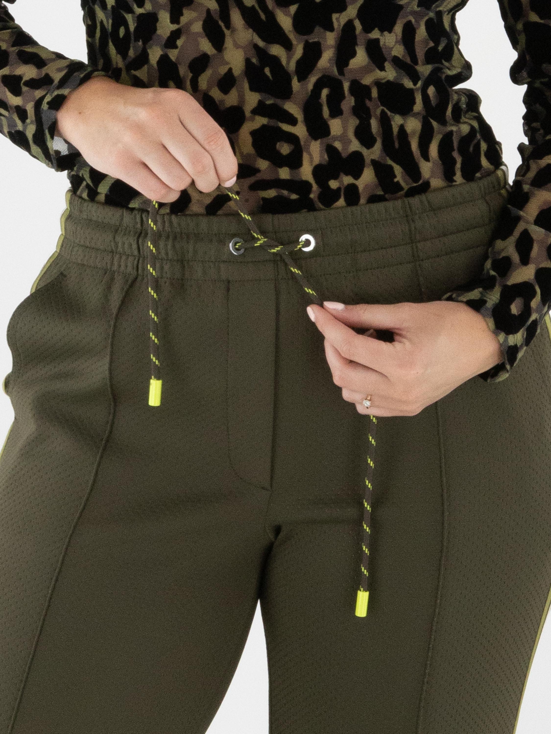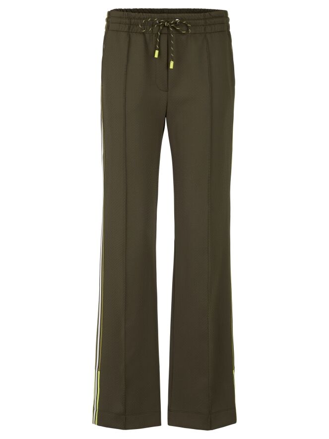 A pair of jogging trousers by Marc Cain in olive green. The trousers are made from two layers of fabric, with the top layer finely perforated. The wide, elastic waistband features a drawstring in a tunnel design. A stripe trim in pistachio green, white and black runs down the sides of the legs. The trousers have side pockets and can be washed at 30 degrees.