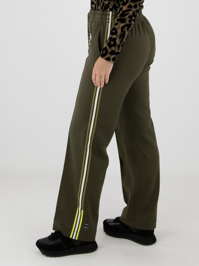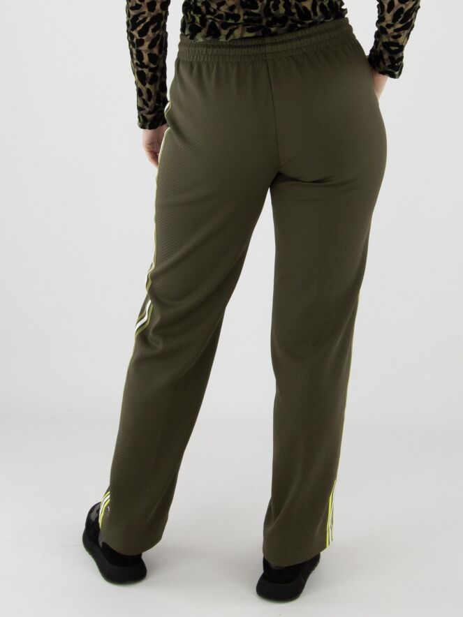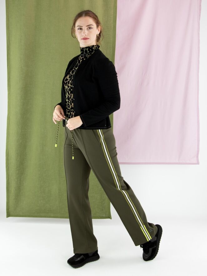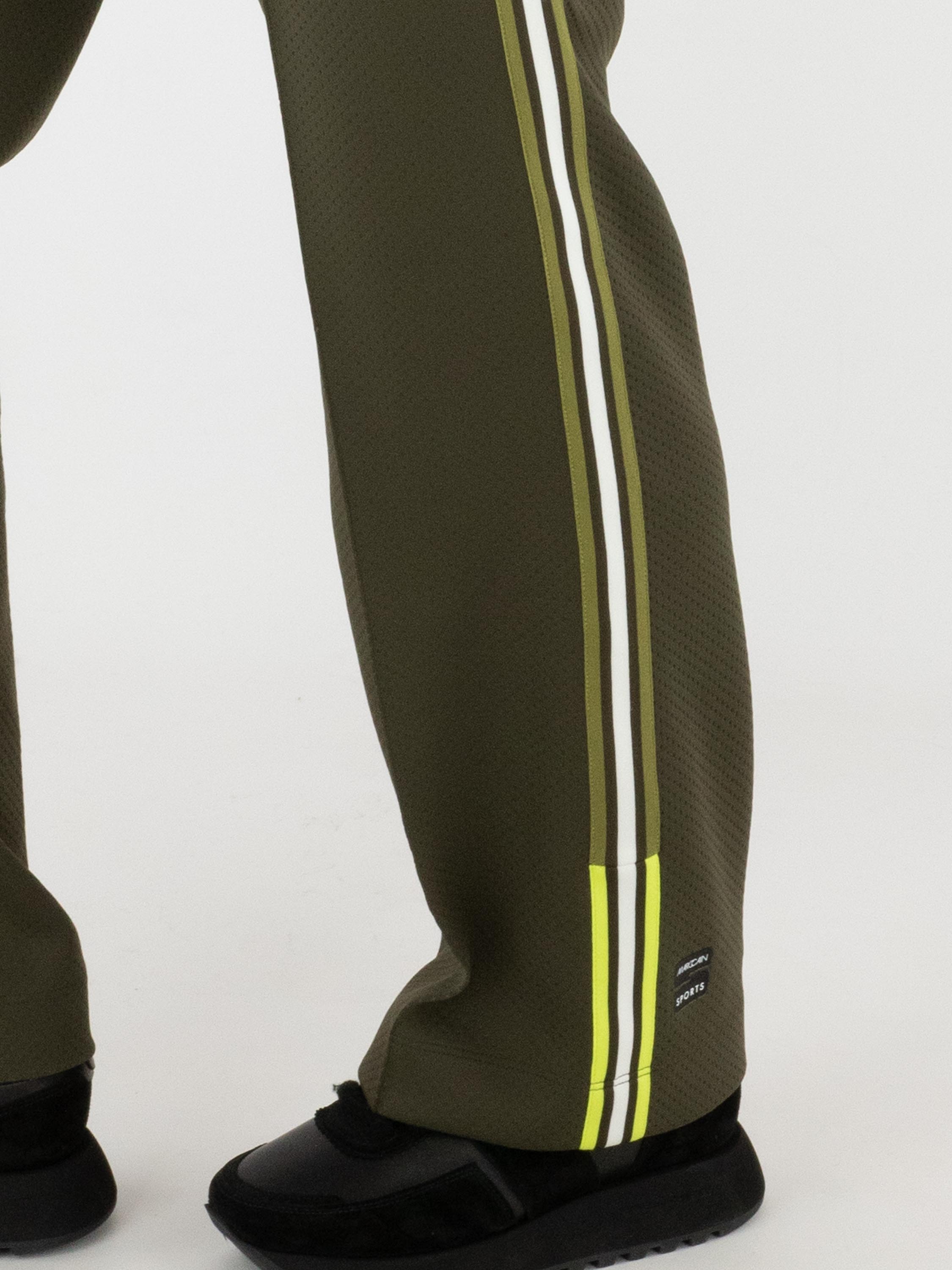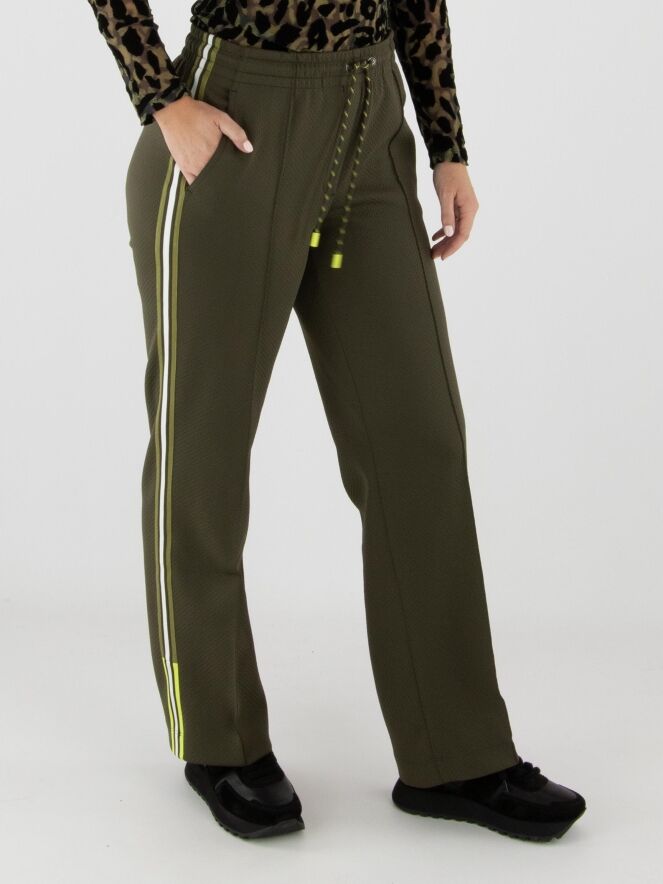 A pair of jogging trousers by Marc Cain in olive green. The trousers are made from two layers of fabric, with the top layer finely perforated. The wide, elastic waistband features a drawstring in a tunnel design. A stripe trim in pistachio green, white and black runs down the sides of the legs. The trousers have side pockets and can be washed at 30 degrees.
