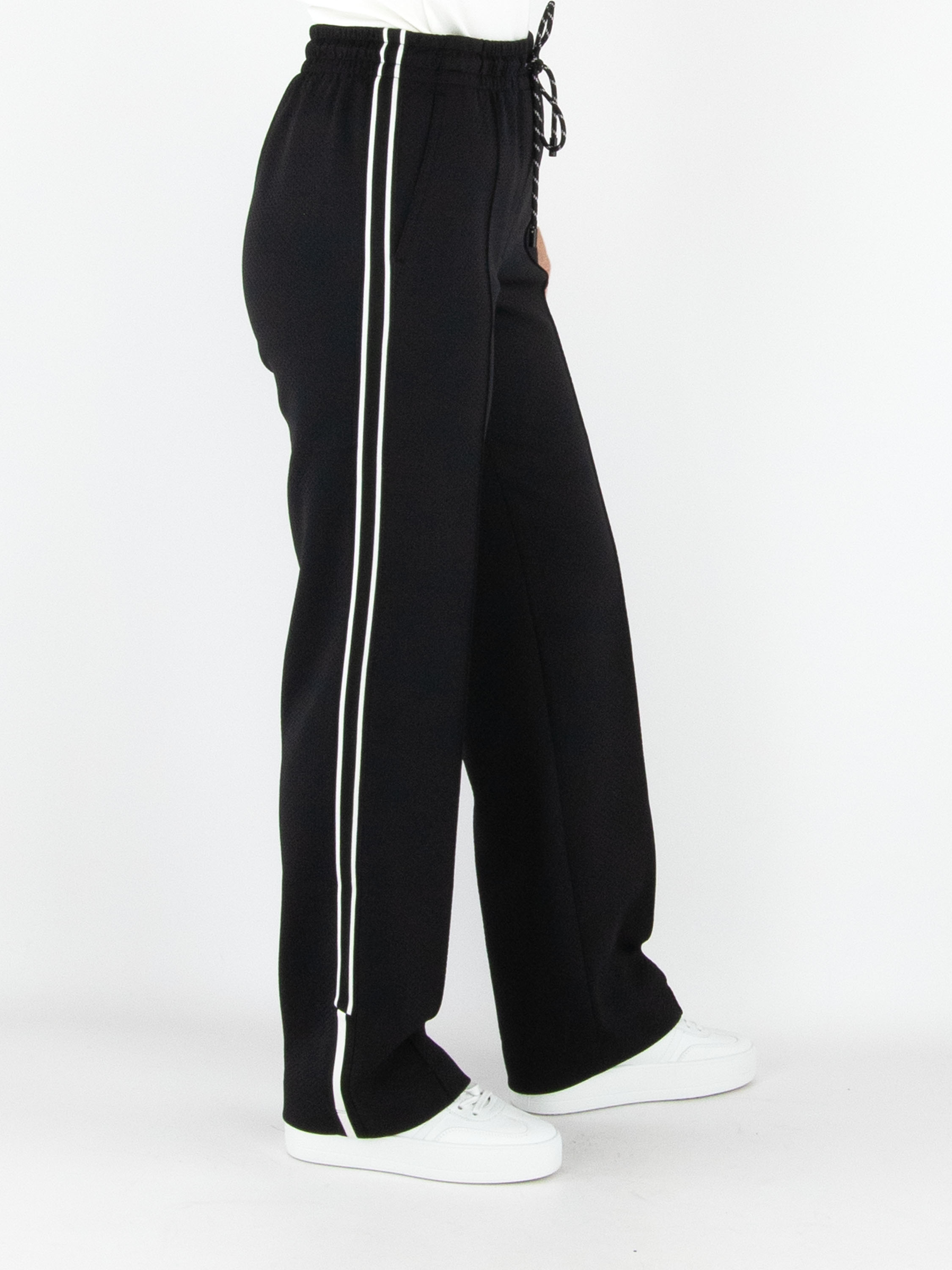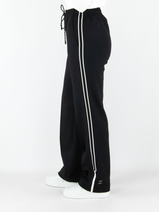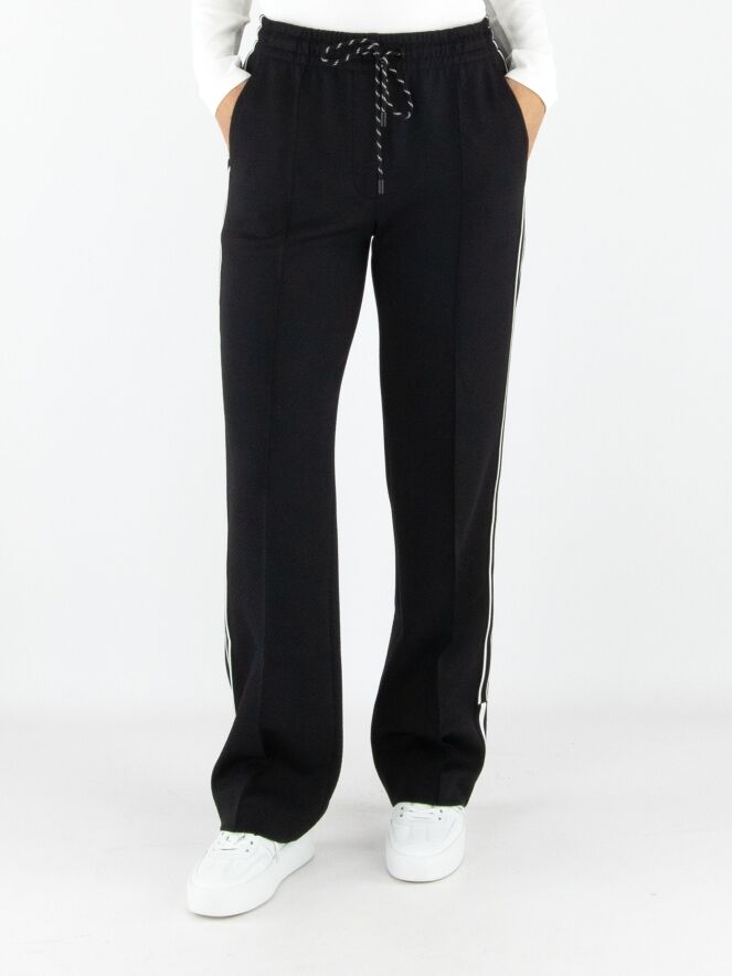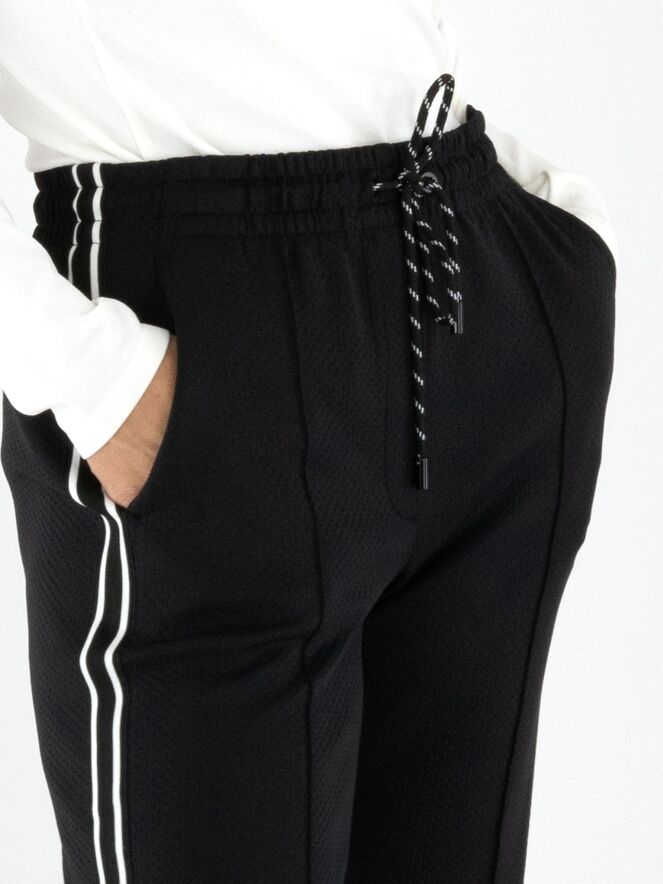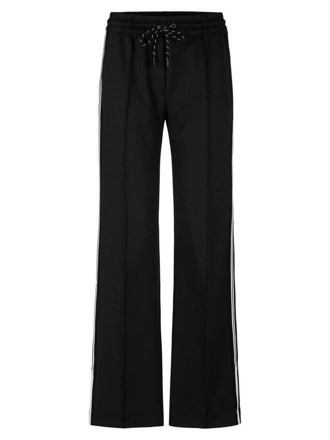 A pair of jogging trousers by Marc Cain in black. The trousers are made from two layers of fabric, with the top layer finely perforated. The waistband is wide and elastic, with a drawstring in a tunnel finish. A black and white striped trim runs along the sides of the legs. The trousers feature slit pockets and can be washed at 30 degrees.