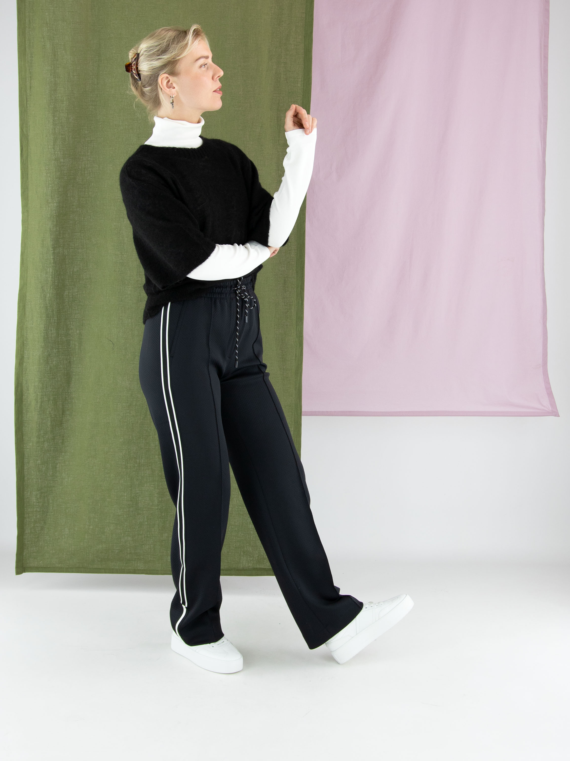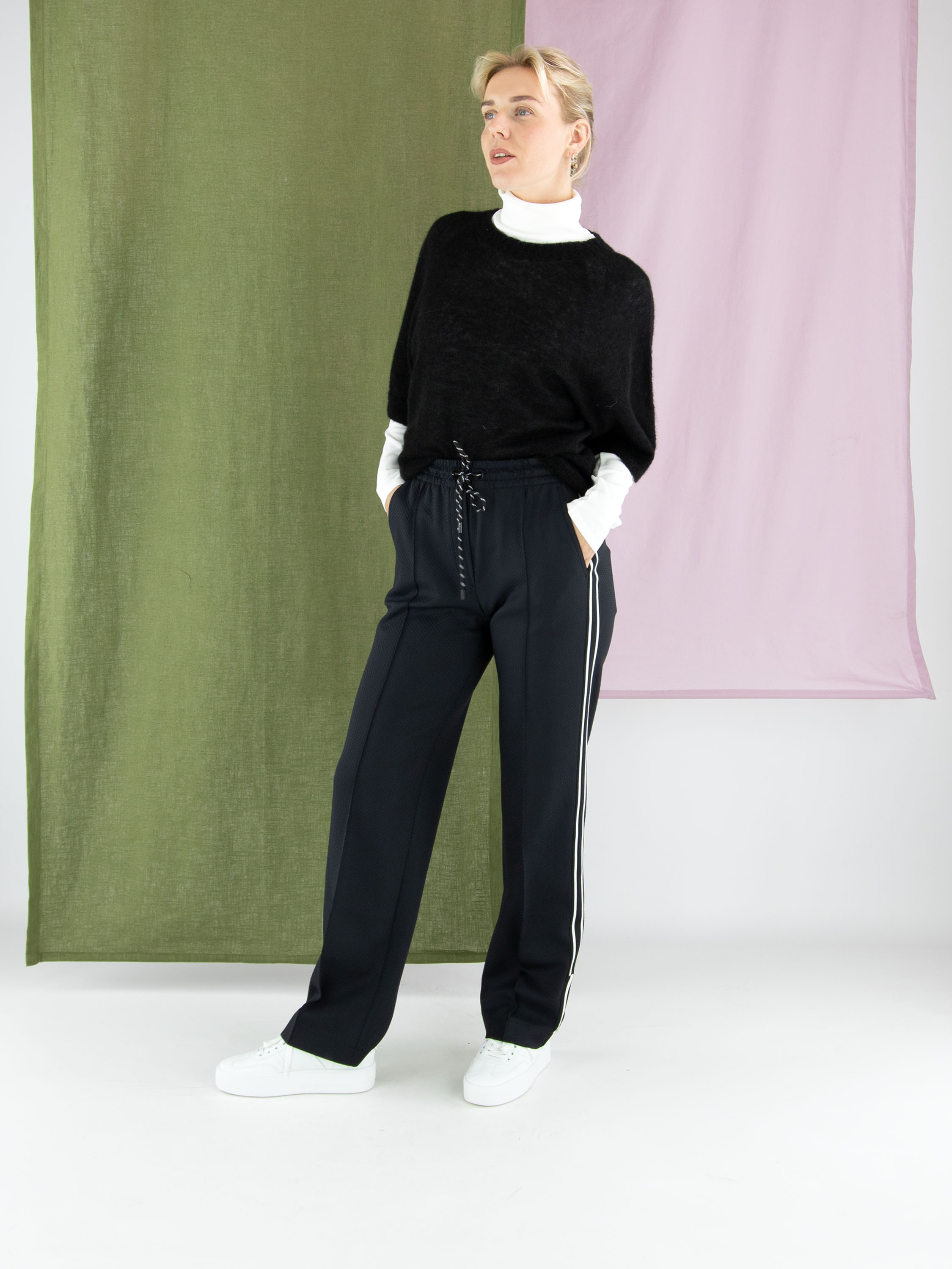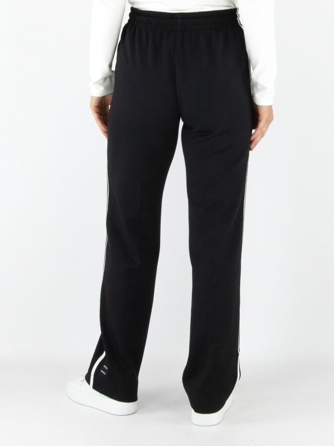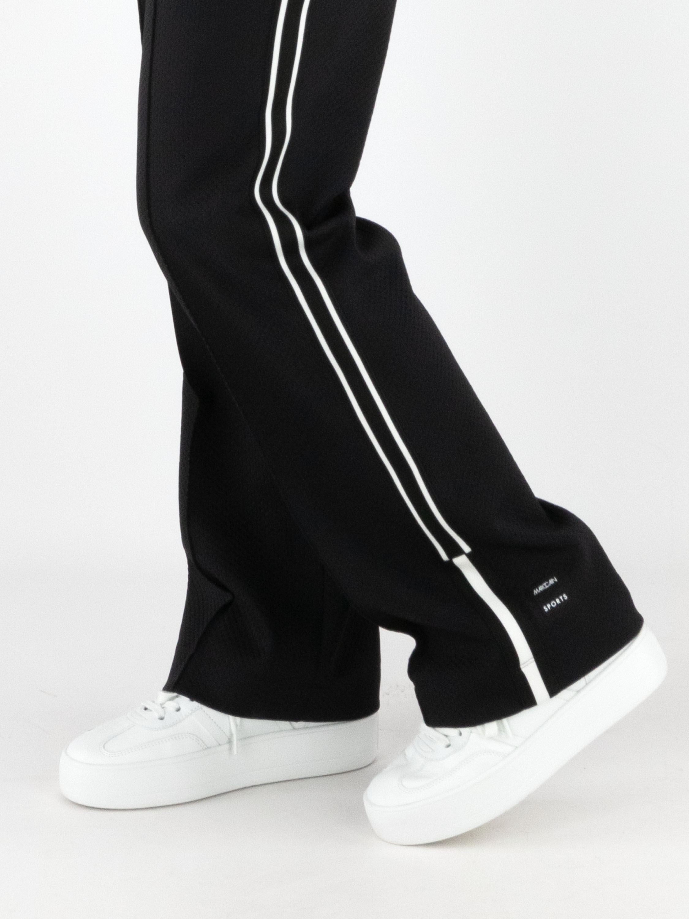 A pair of jogging trousers by Marc Cain in black. The trousers are made from two layers of fabric, with the top layer finely perforated. The waistband is wide and elastic, with a drawstring in a tunnel finish. A black and white striped trim runs along the sides of the legs. The trousers feature slit pockets and can be washed at 30 degrees.