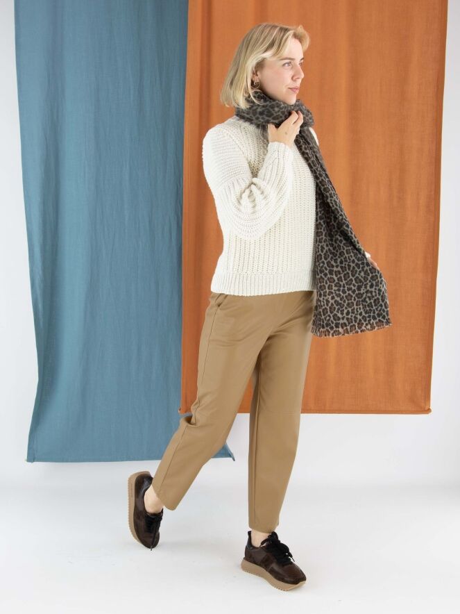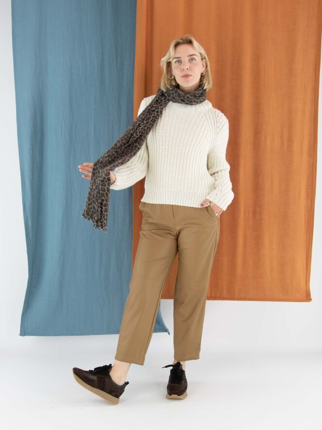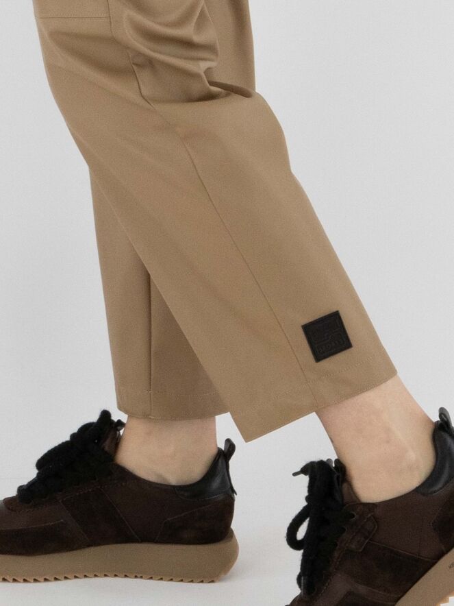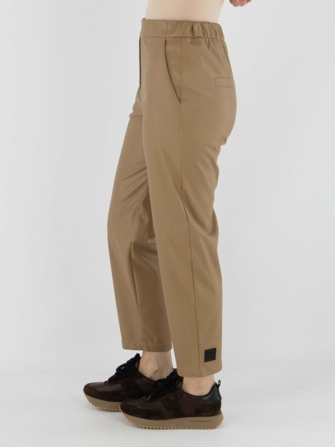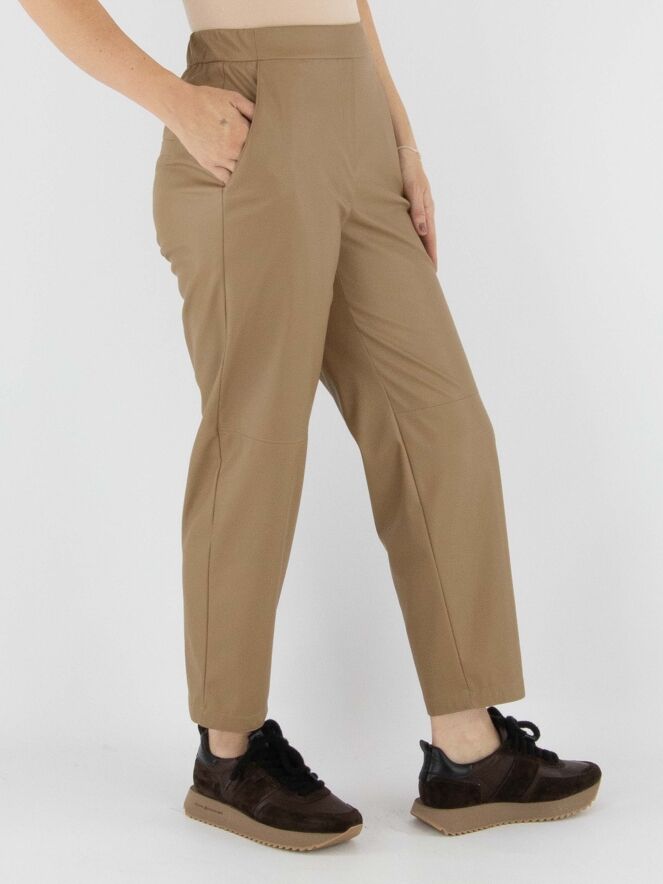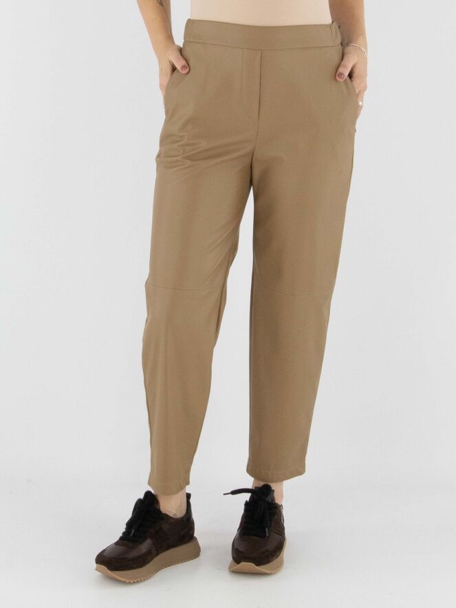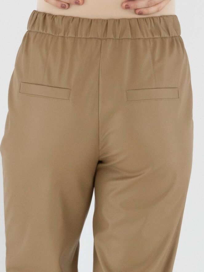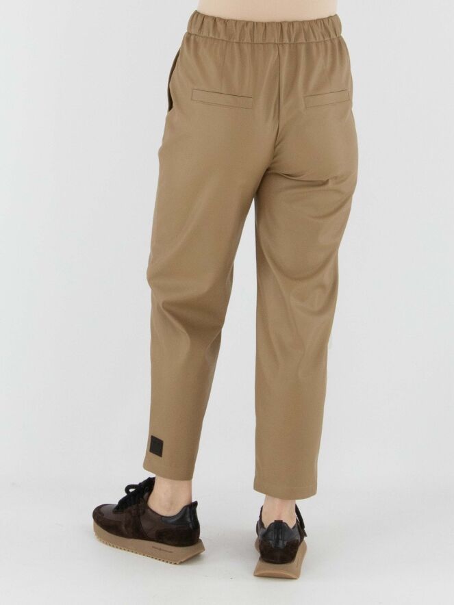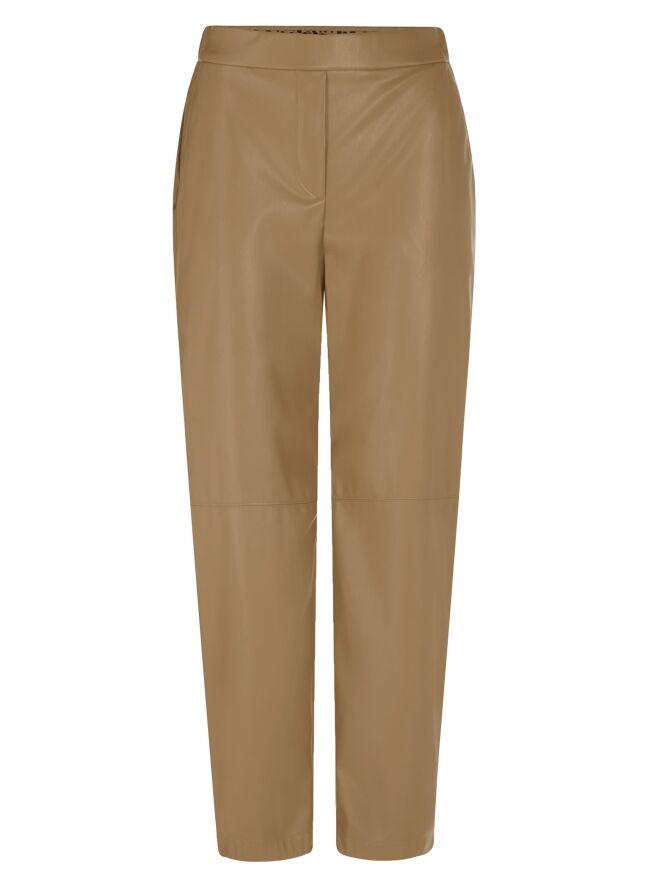A faux leather trouser by Marc Cain in camel. The waistband features an elastic band with fine pleats at the back. The trousers are designed with practical side pockets and can be washed at 30 degrees.