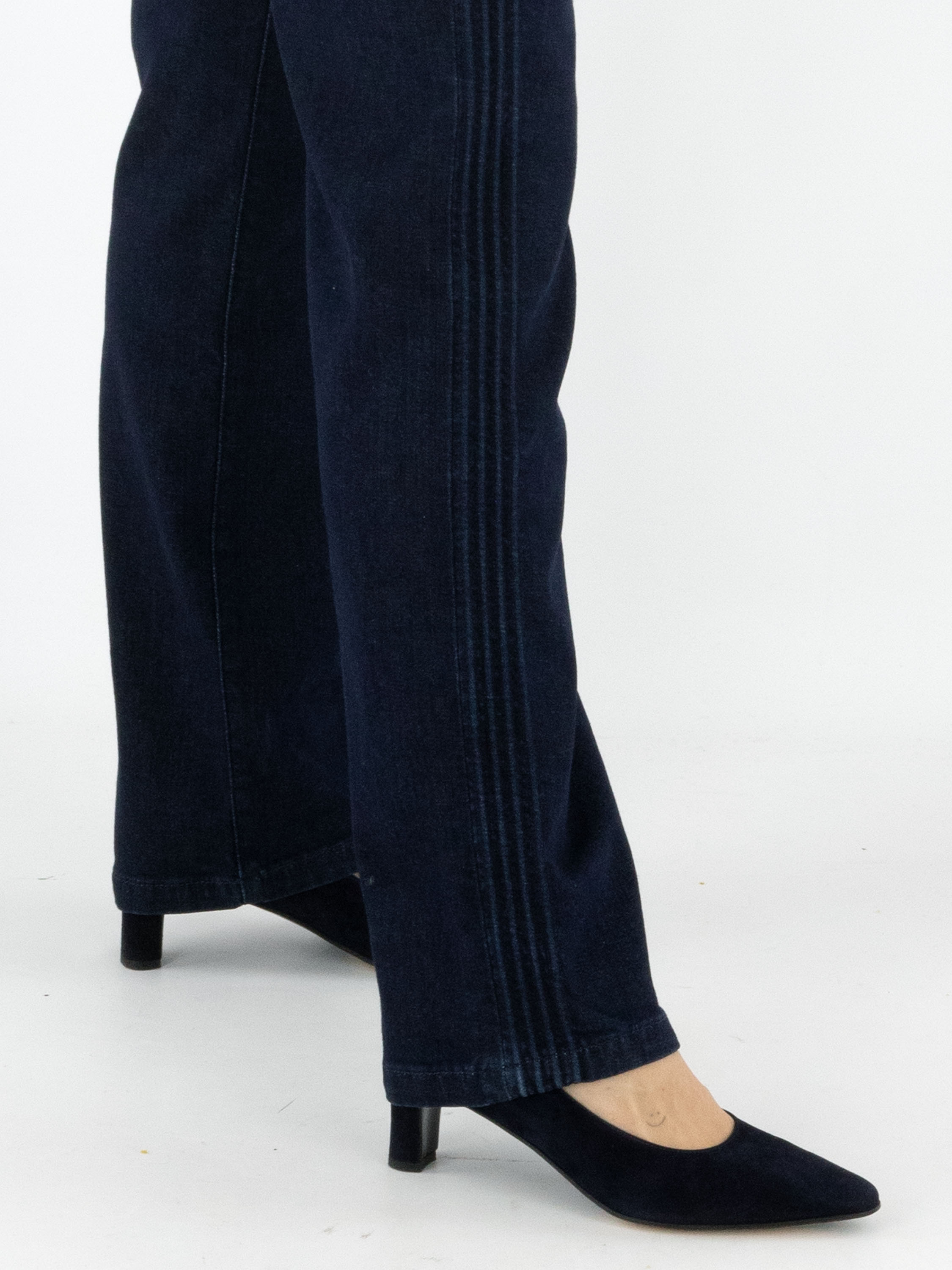 A dark denim jeans by Marc Cain in a deep indigo shade. The jeans are designed in a classic 5-pocket style. Along the sides run four embossed piping details in a ribbed structure. These jeans can be washed at 30 degrees.