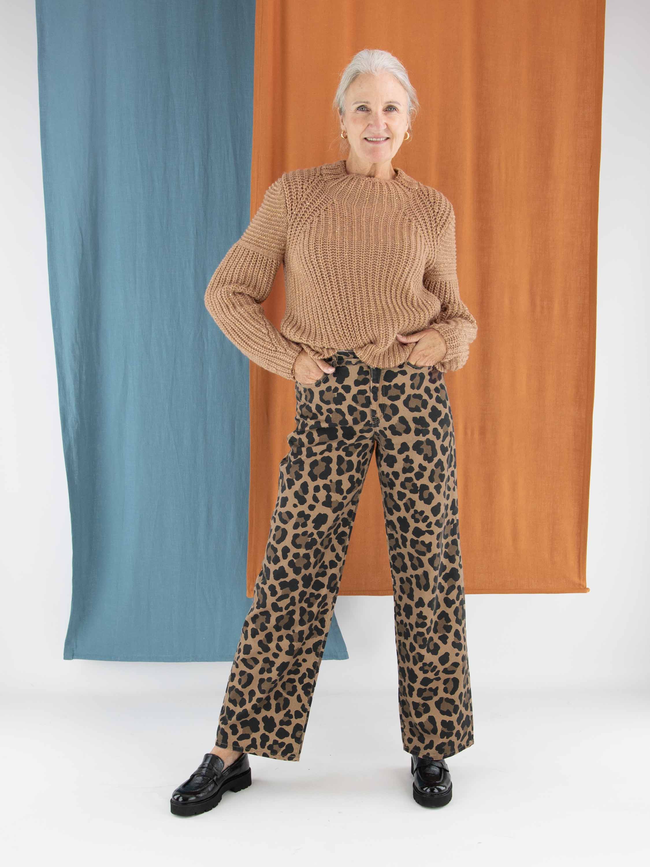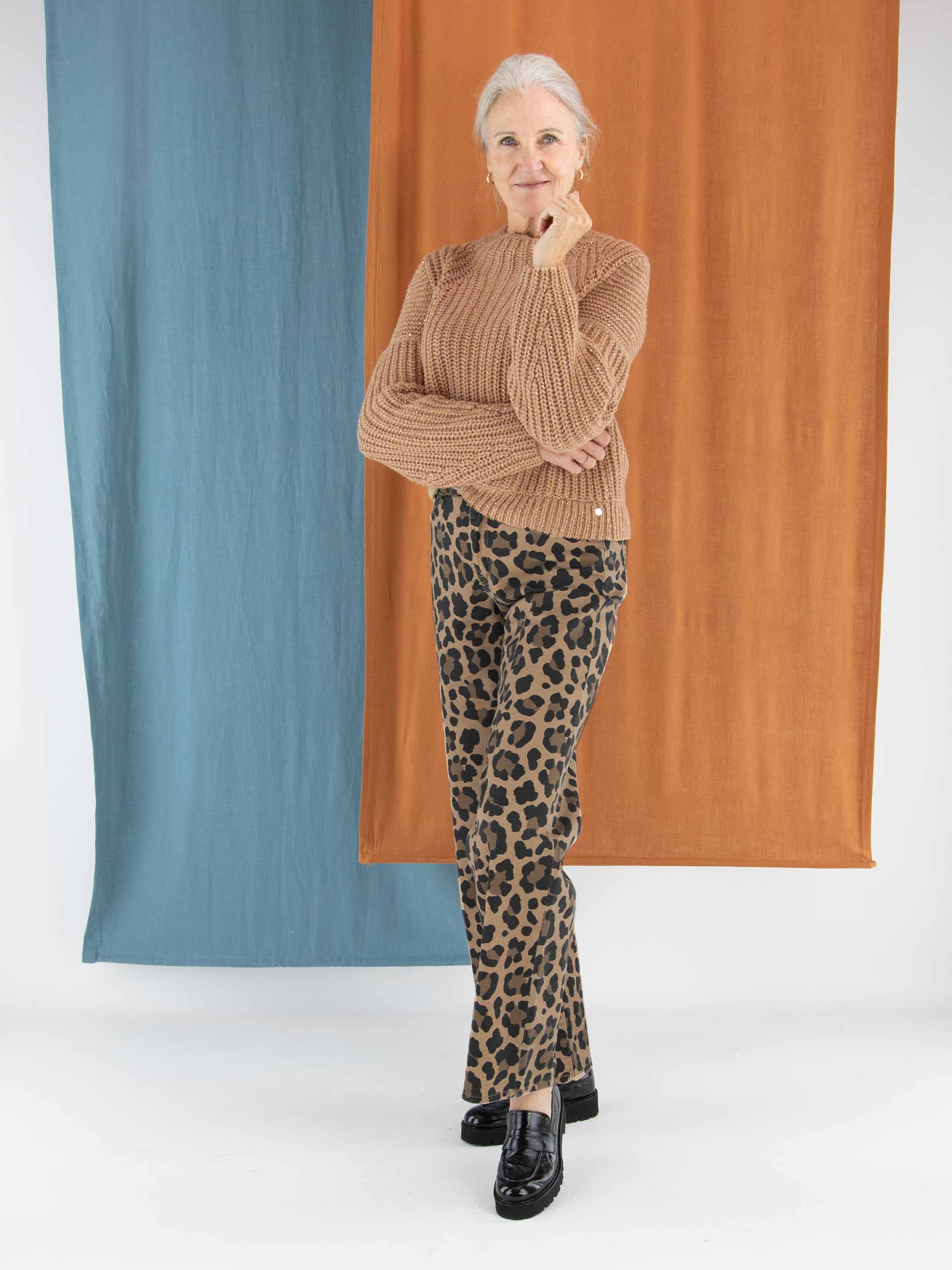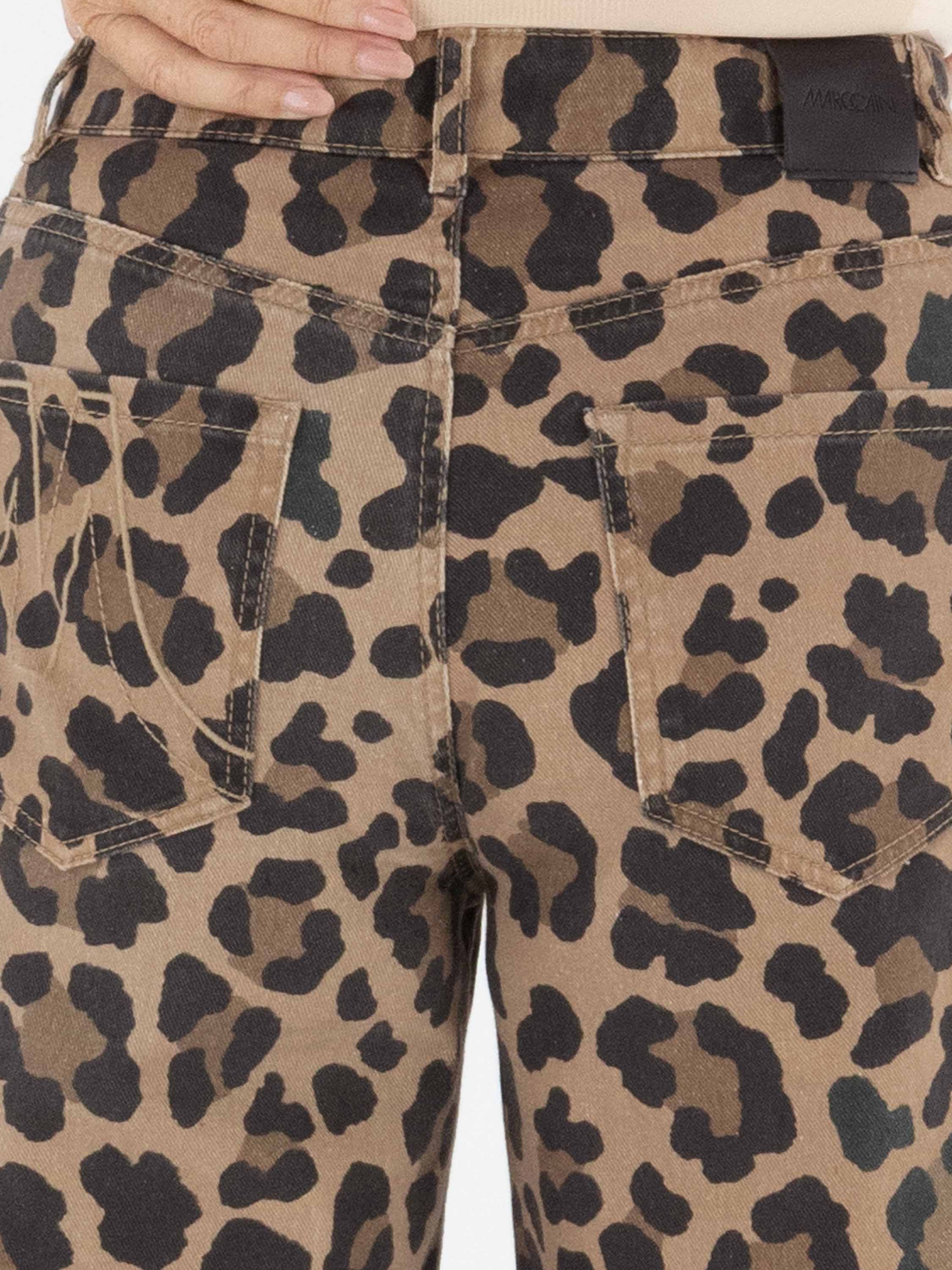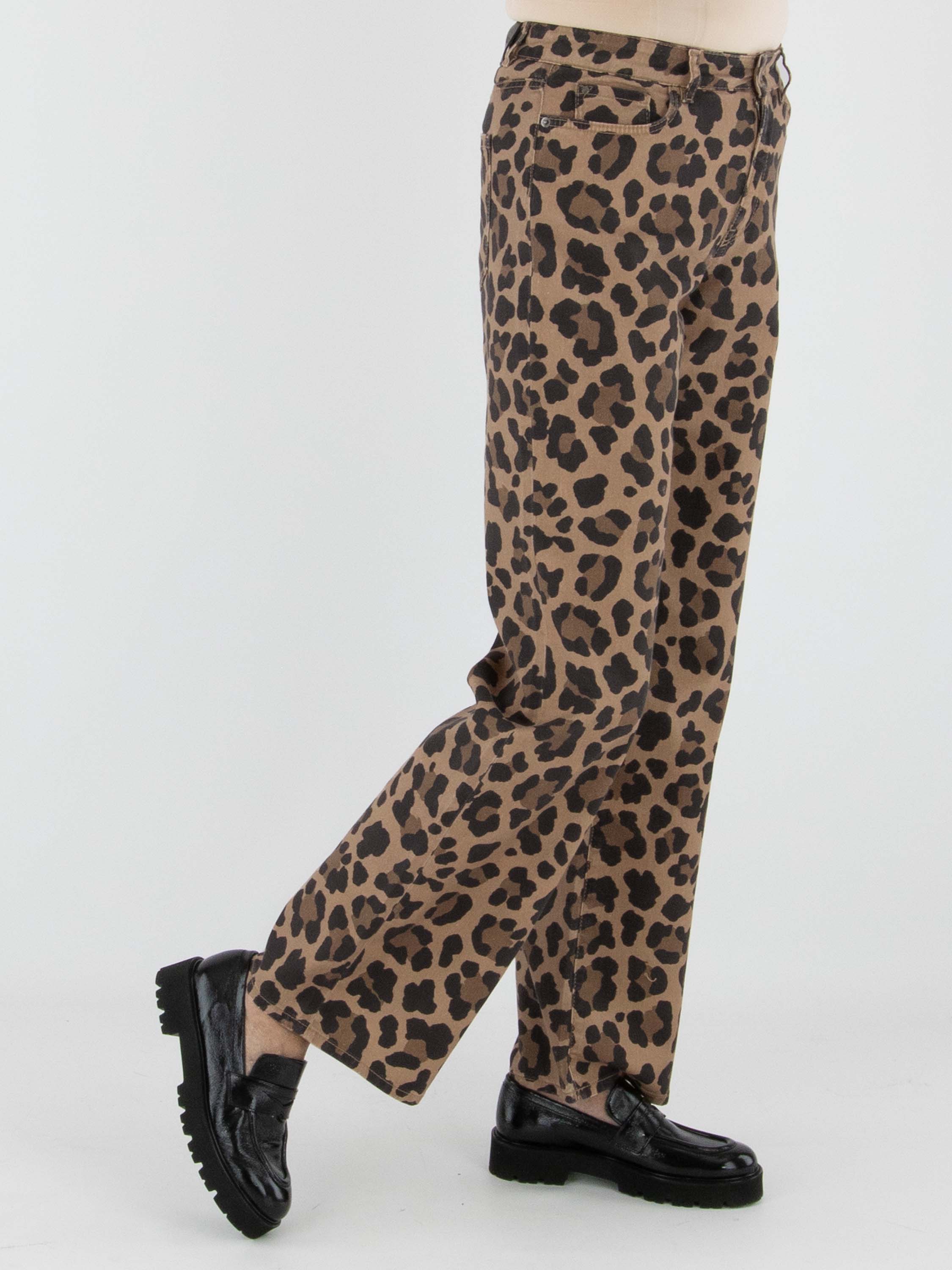 Wide-leg jeans from Marc Cain in a leopard print with various shades of brown and black. The jeans are designed in a classic 5-pocket style and can be washed at 30 degrees.