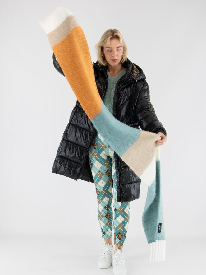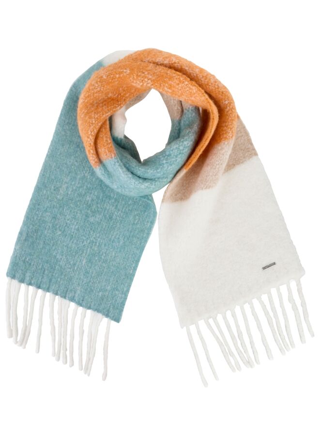 A luxurious long shawl from Marc Cain, designed with color blocks in shades of orange, off-white, turquoise, and beige. The ends are finished with long fringes, adding an elegant yet playful touch. This shawl can be hand-washed.