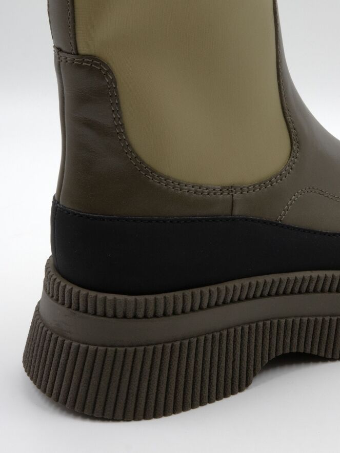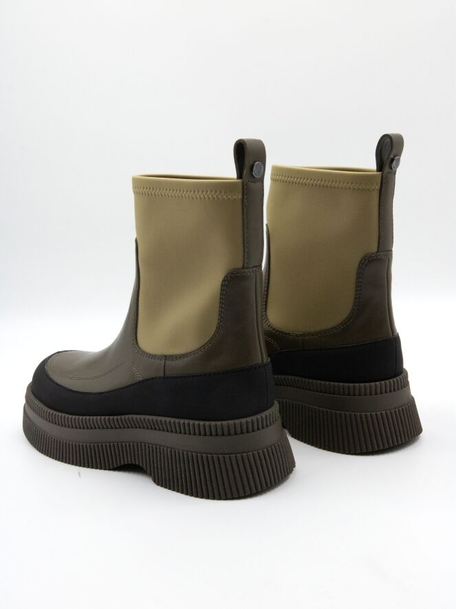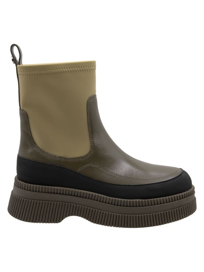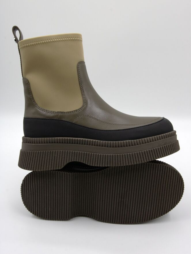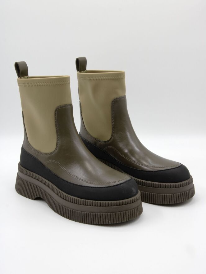 Ankle boot by Marc Cain in various shades of green with black. Along the edge of the moss green finely ribbed sole runs a band in matte black leather. The forefoot, with a narrow edge toward the heel, is made of olive green leather. The shaft is pistachio green and made from a stretchy fabric.