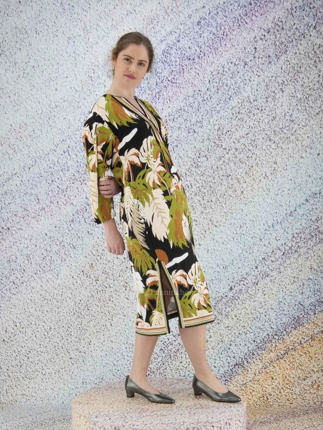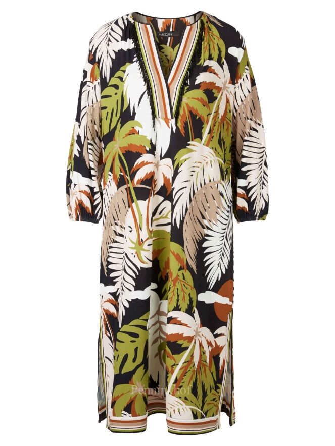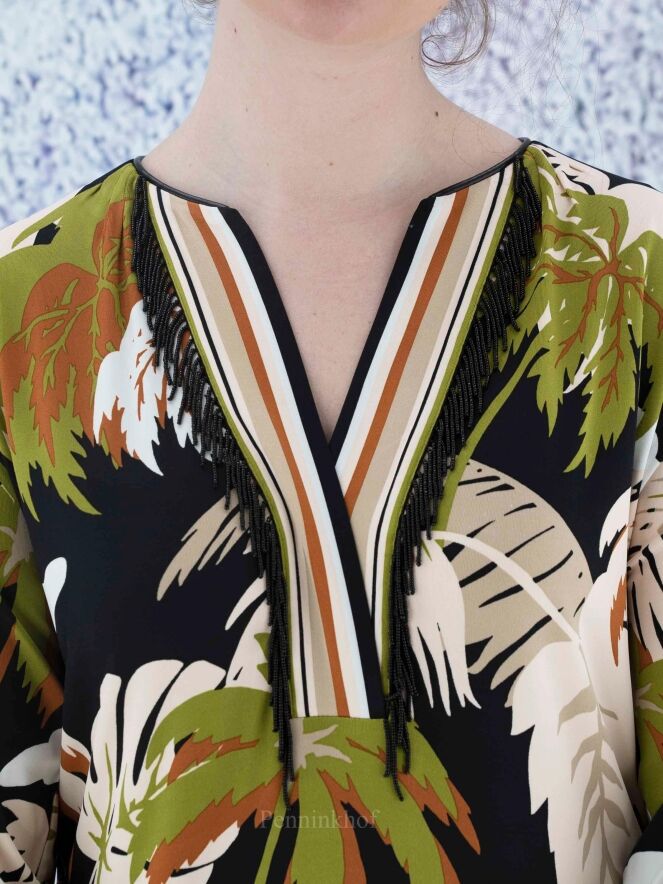 A Marc Cain dress in a print with leaves in the colors pistachio green, cognac, creamy white and black. Along the edge of the V - Neck is a striped trim. On both sides of the center is a split with a striped trim on both sides of the split. In the edge of the long sleeves is a finely pleated elastic trim. This dress can be washed at 30 degrees.