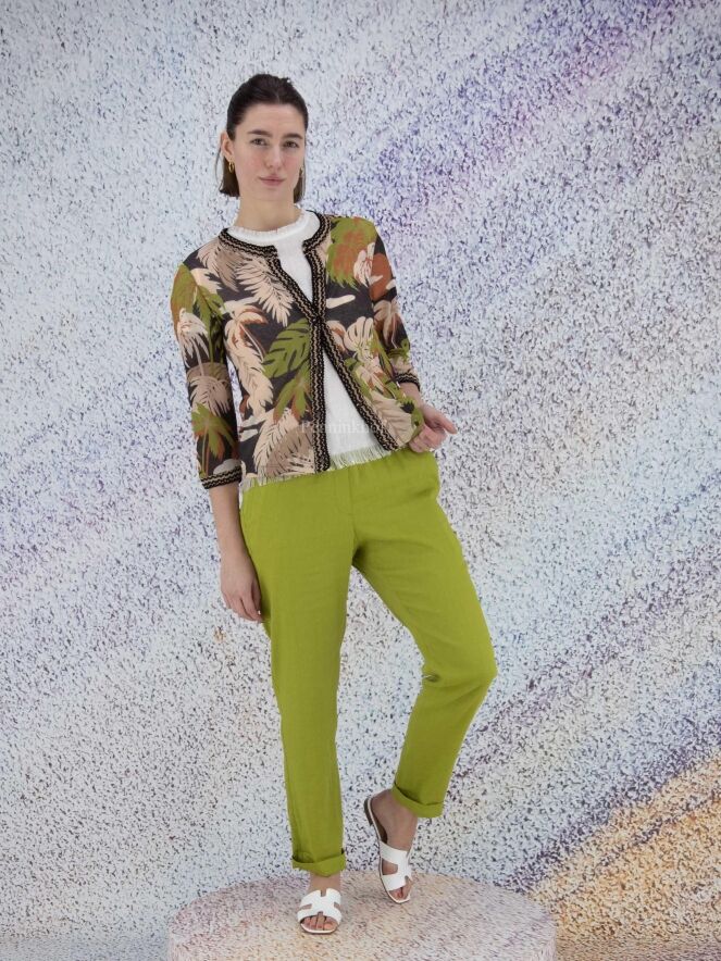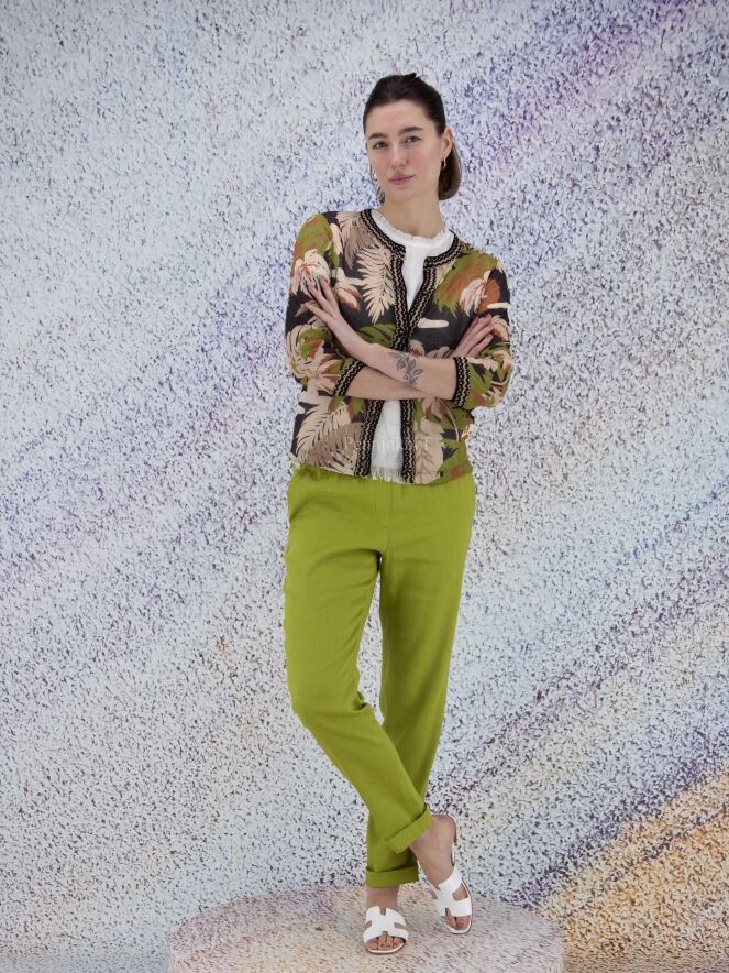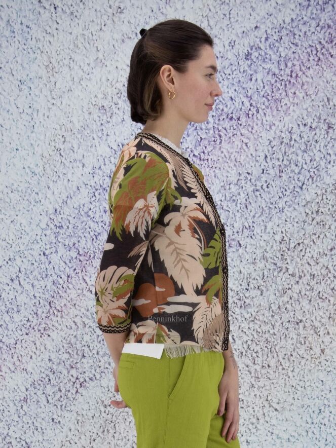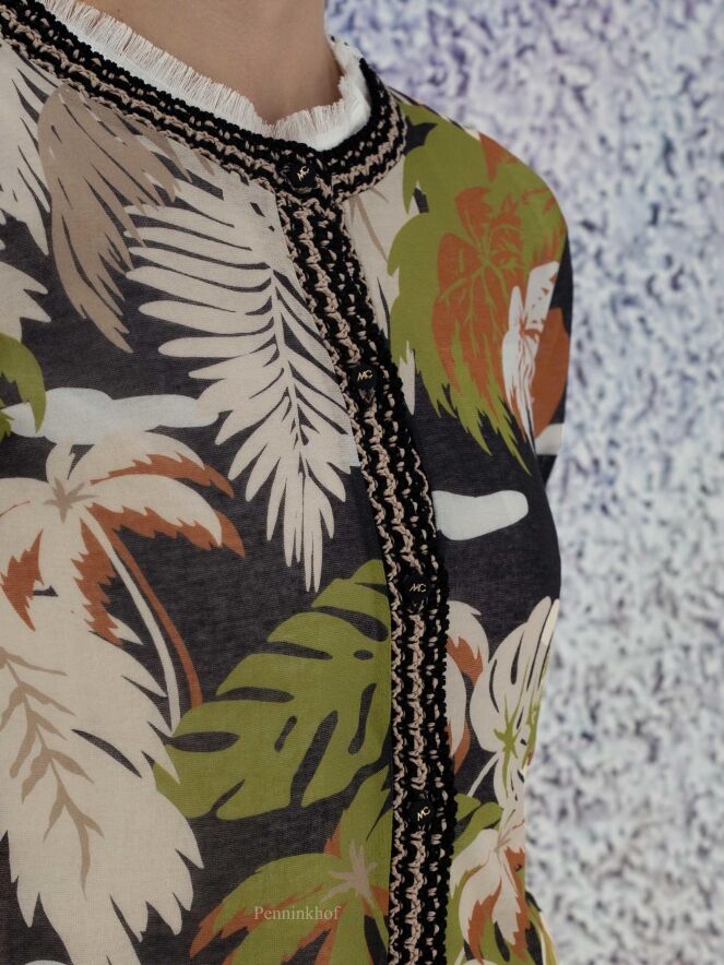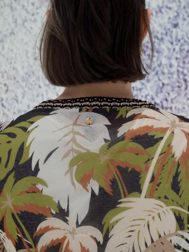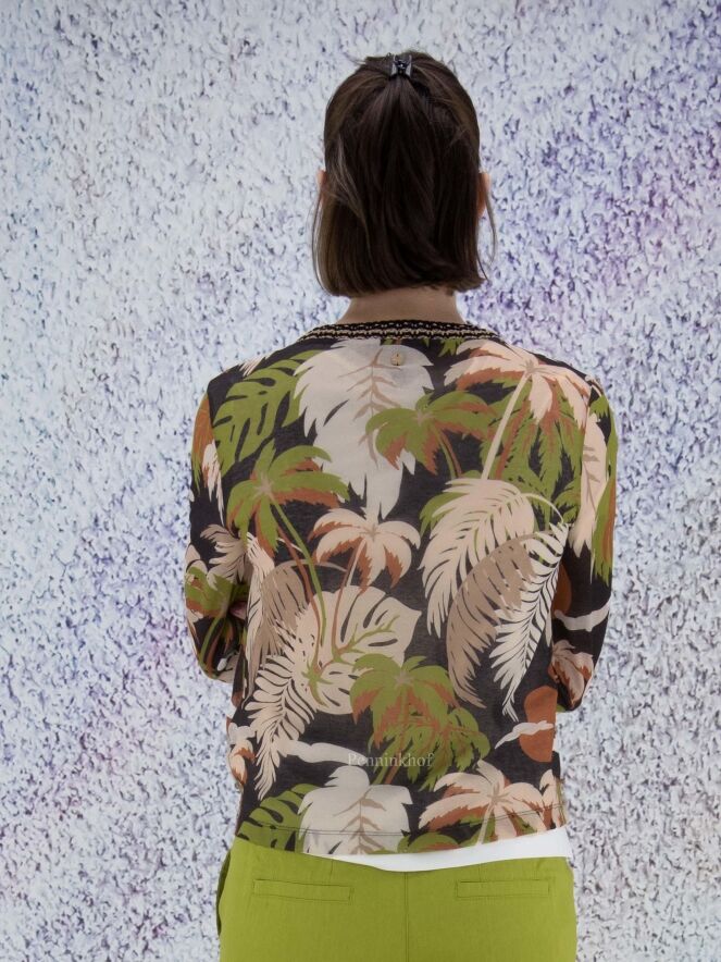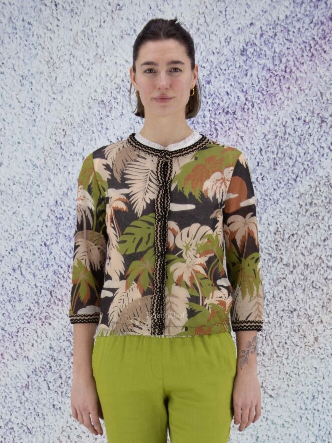 A slightly transparent cardigan by Marc Cain in a print of leaves and palm trees with the colors pistachio green, black and cognac on a creamy white background. Along the edge of the round neckline, the closure and the ends of the half-long sleeves is a braided trim in the colors black and sand. This vest can be washed at 30 degrees.