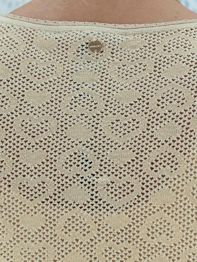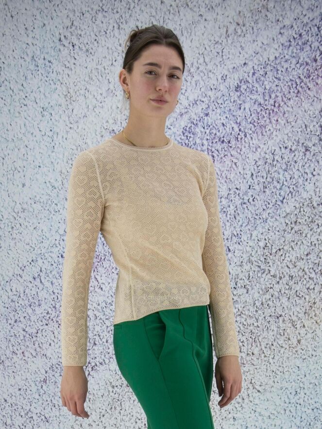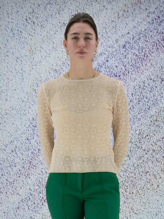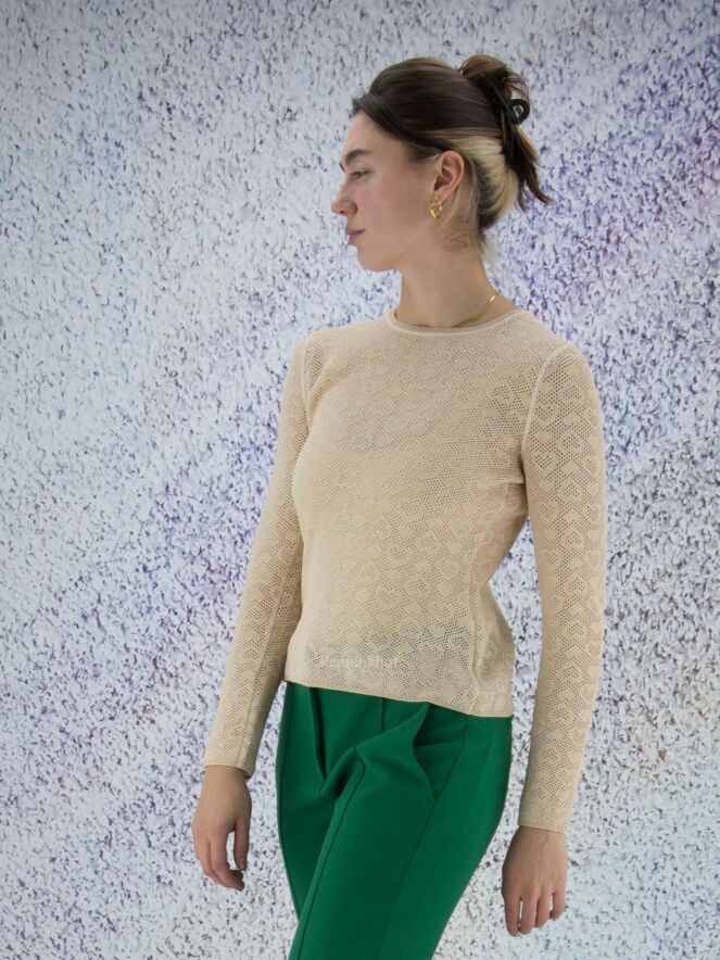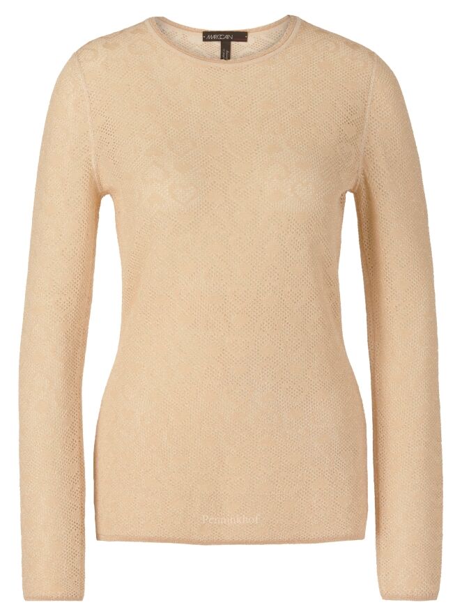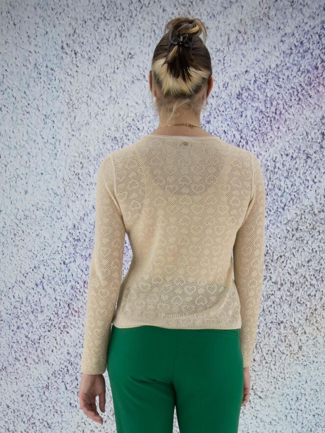 A perforated shirt by Marc Cain in the color nude with a gold thread through the fabric. 2 types of hearts are woven into the fabric. There is an openwork trim along the edge of the round neckline. This shirt can be washed at 30 degrees.