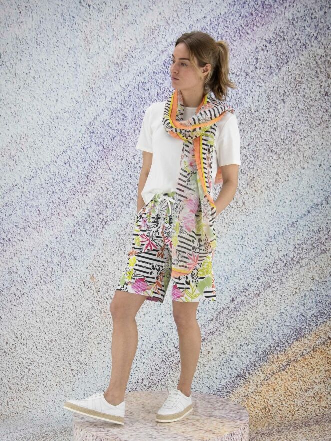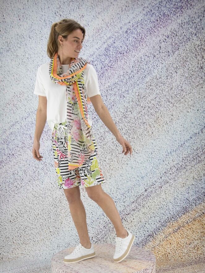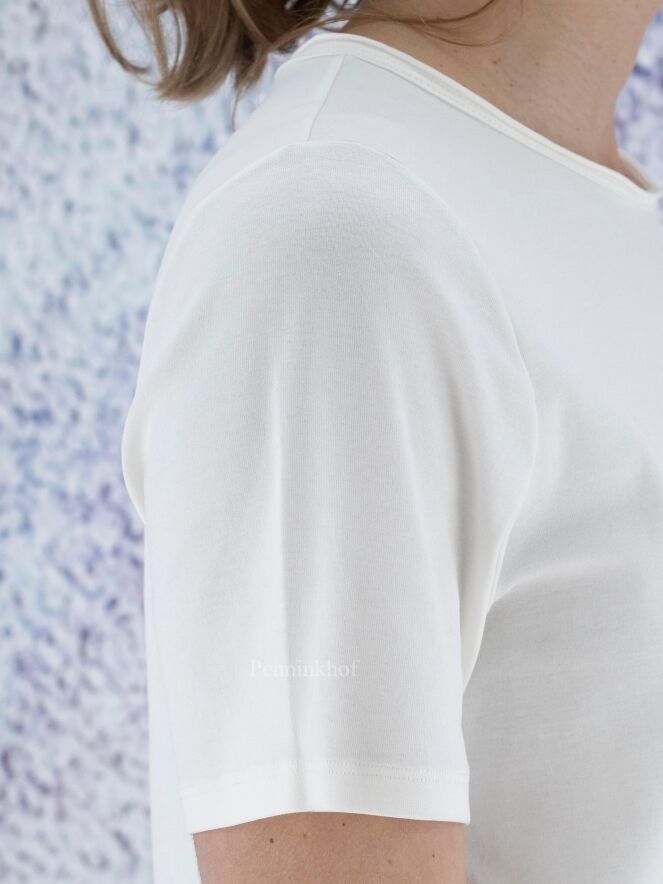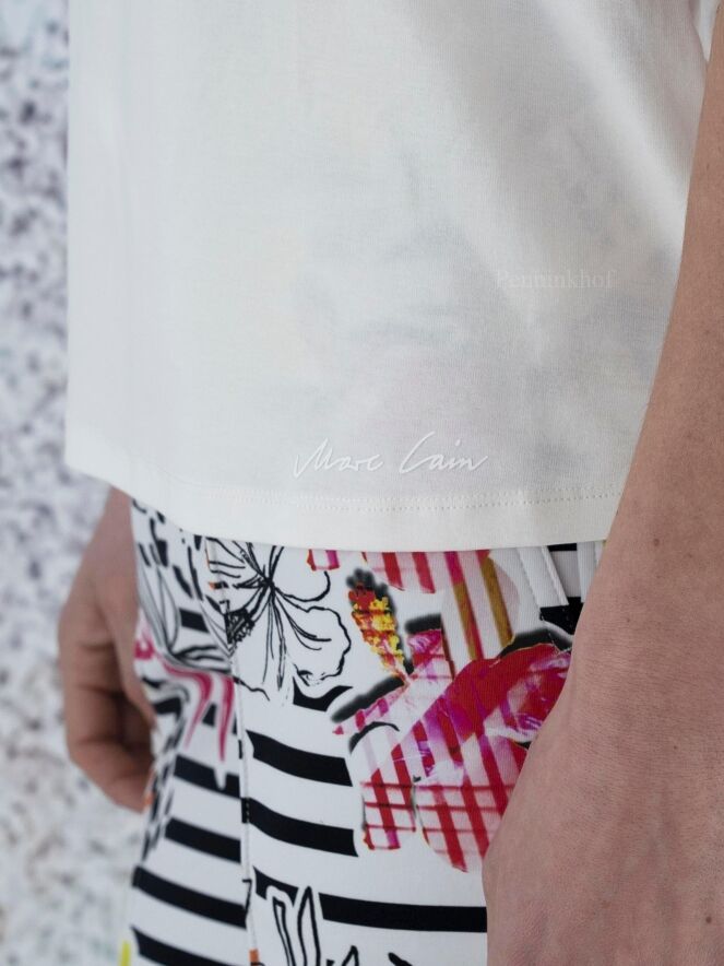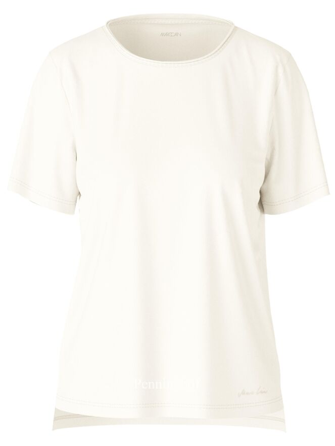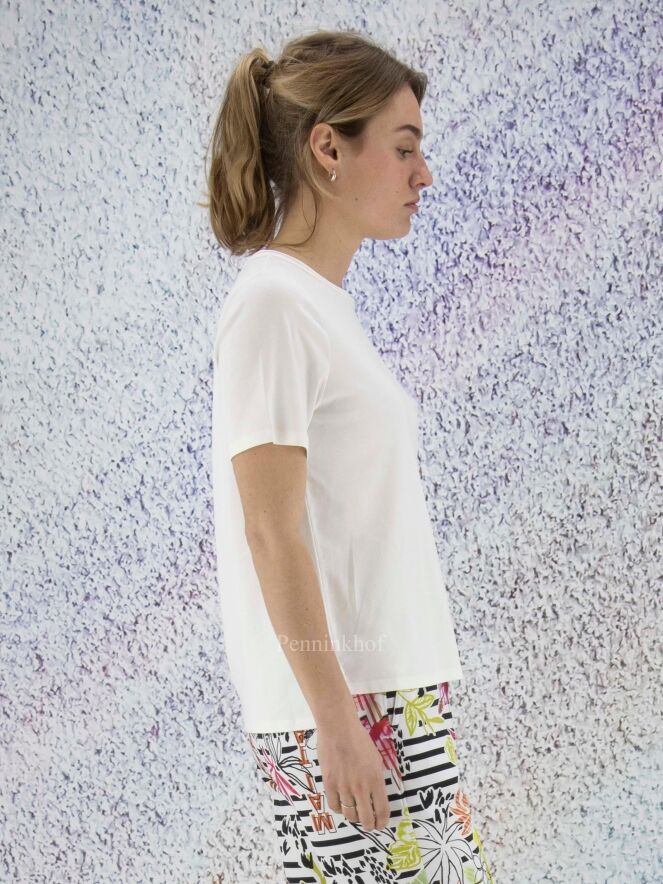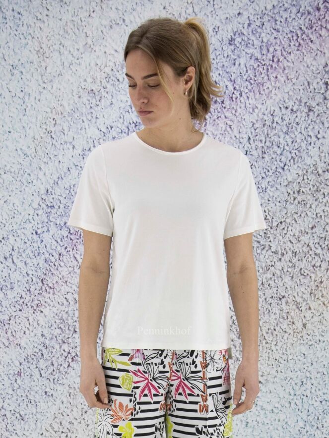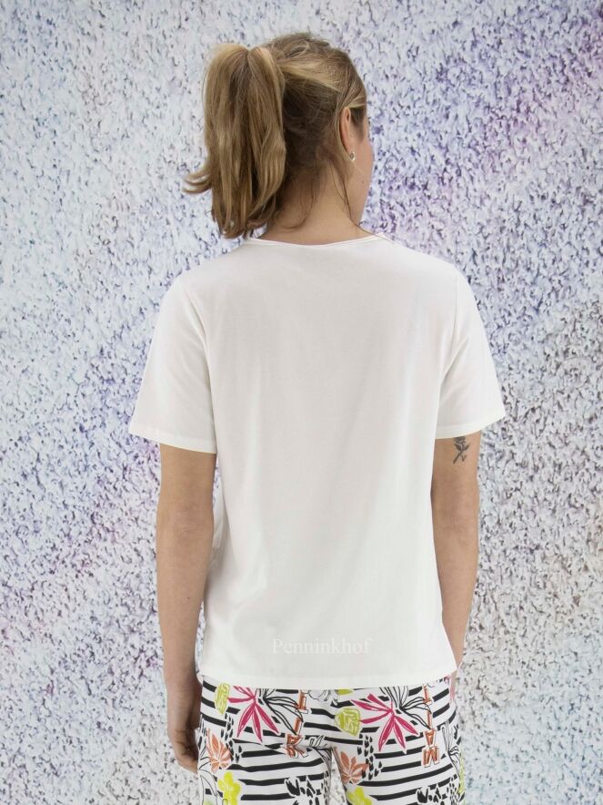 A Marc Cain shirt in a creamy white color. Along the edge of the round neck is a transparent trim. There is a short slit on both sides at the bottom. The shirt has short sleeves and can be washed at 30 degrees.