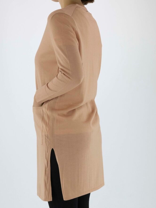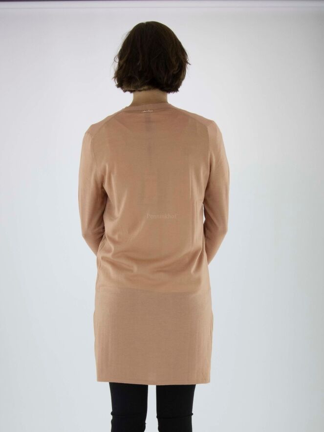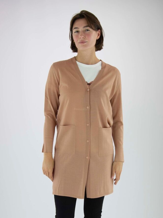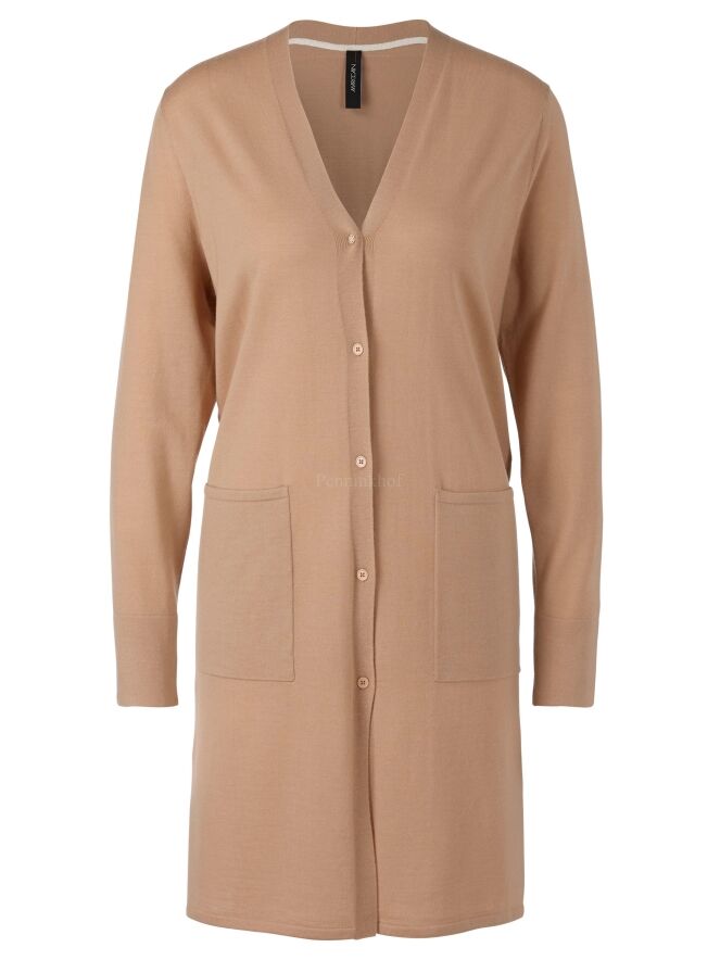 A long cardigan by Marc Cain in the color canmel. There are deep slits on both sides at the bottom. The cardigan has long sleeves and can be washed by hand.