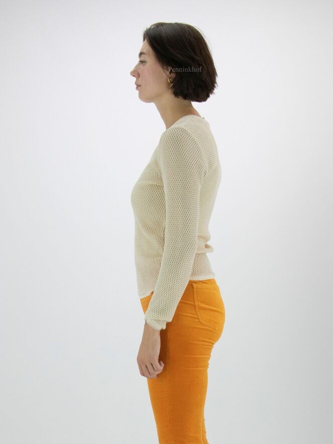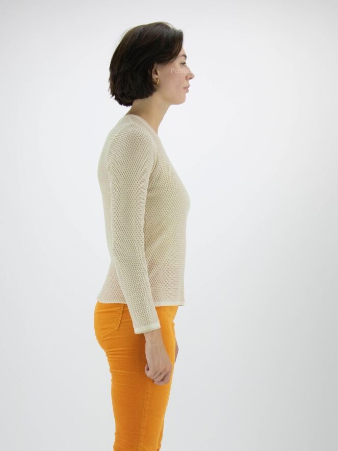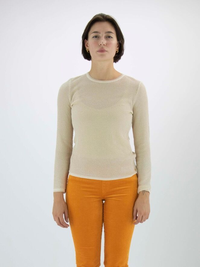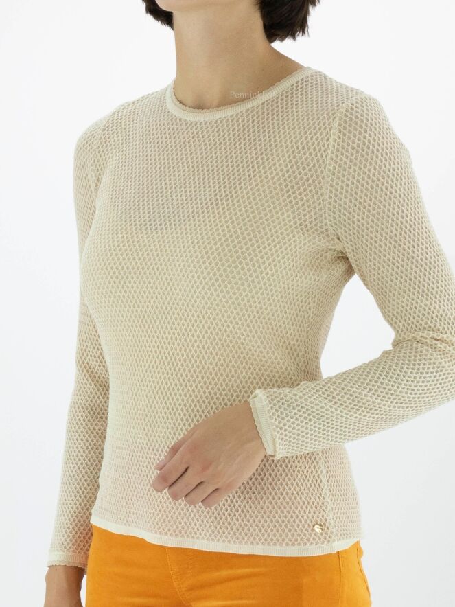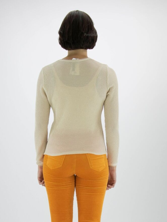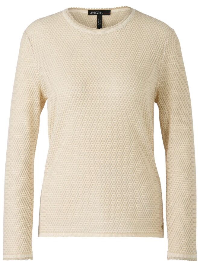 Pullover from Marc Cain in a rat pattern in the colour sand. A gold thread is woven through the fabric. There is a scaled trim along the edge of the round neckline and at the end of the long sleeves. This pullover may be washed at 30 degrees.