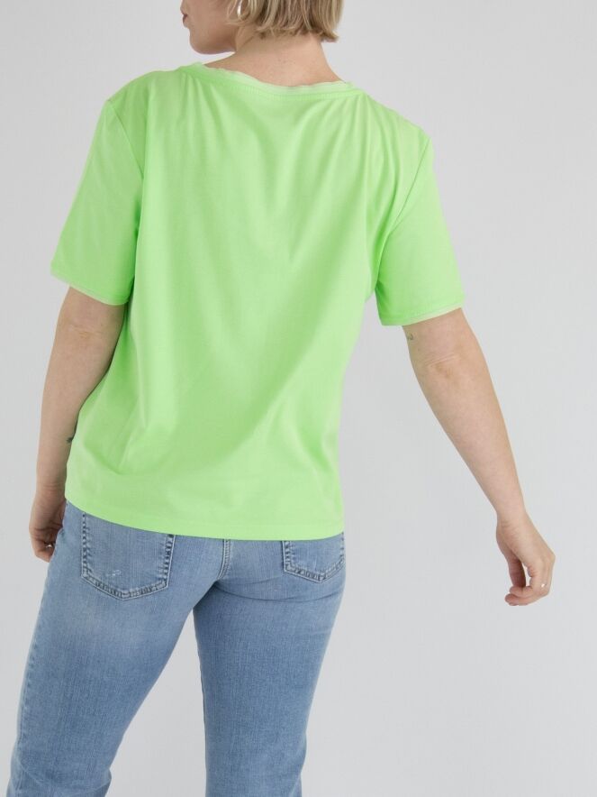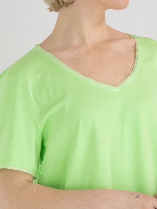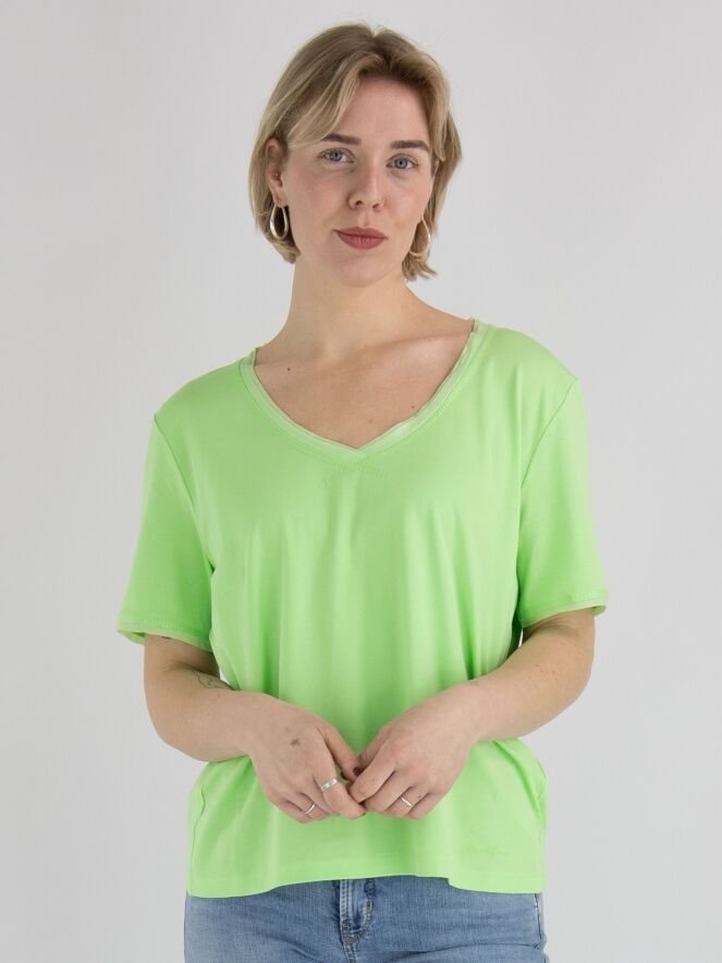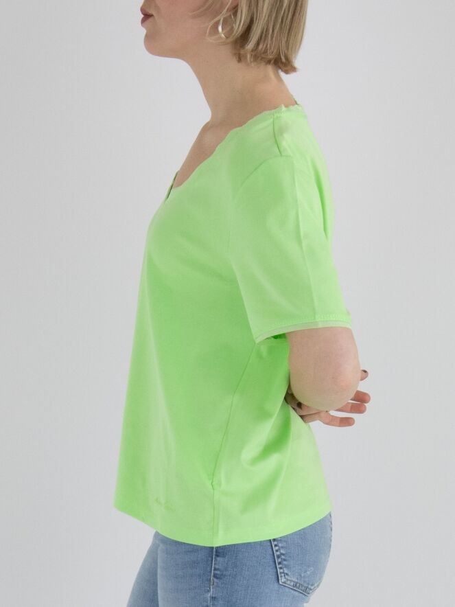 A shirt from Marc Cain in the color pistachio green. Along the edge of the round-cut V-neck and the short sleeves is a double trim with a voile fabric and a stitched ajour line. This shirt can be washed at 30 degrees.