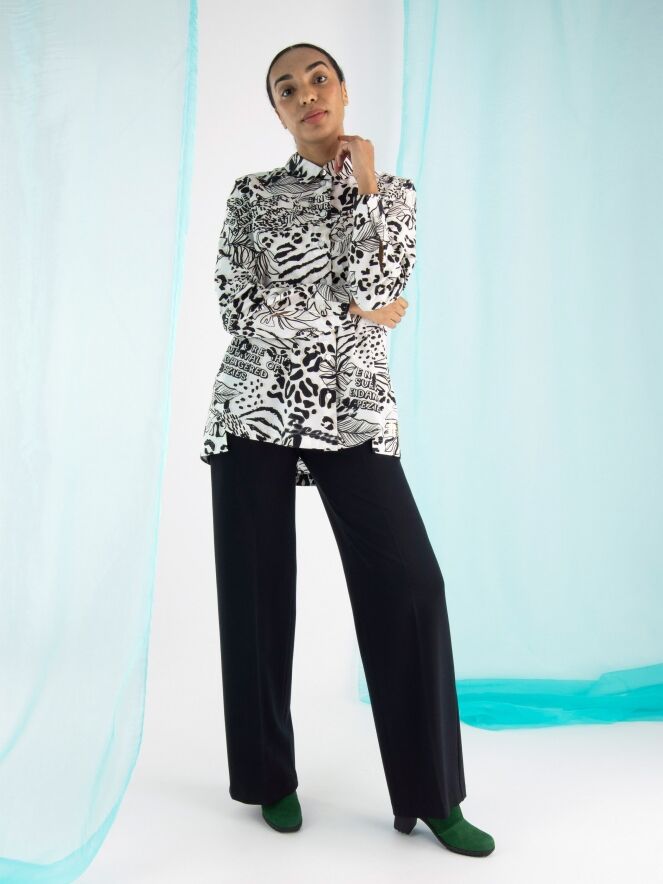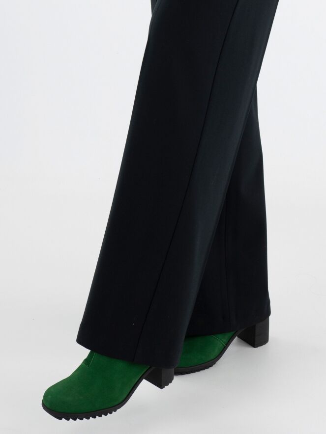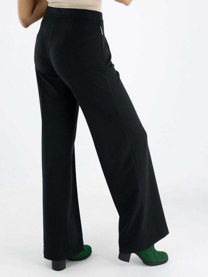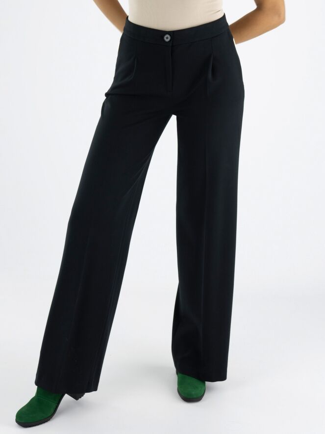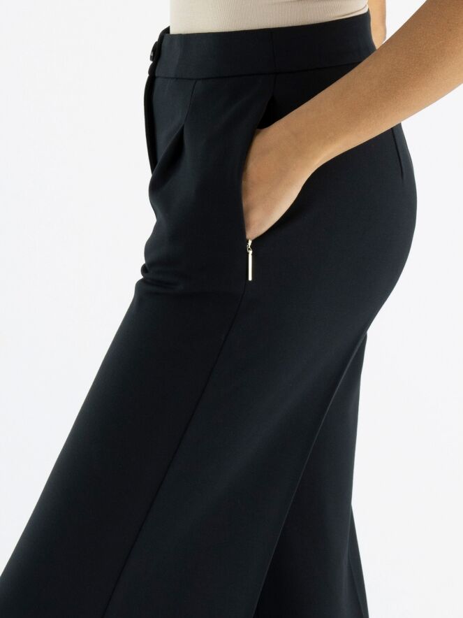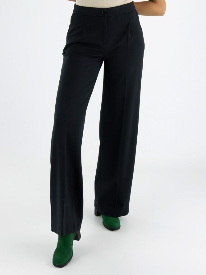 A pair of trousers by Marc Cain in black. The trousers feature two band pleats, and the side pockets have a concealed zipper closure. There is a sharply pressed crease down the center of the legs. These trousers can be washed at 30 degrees.