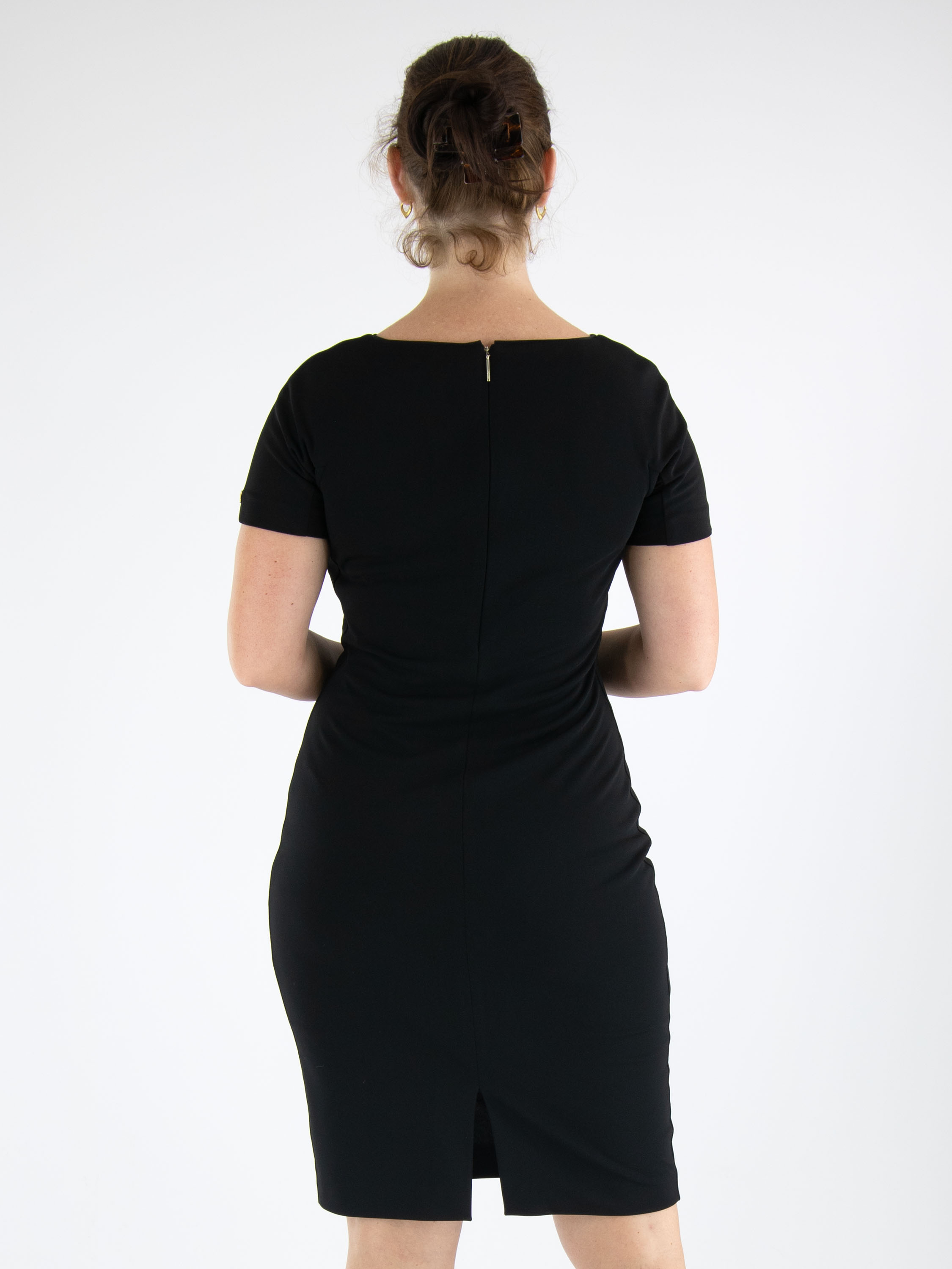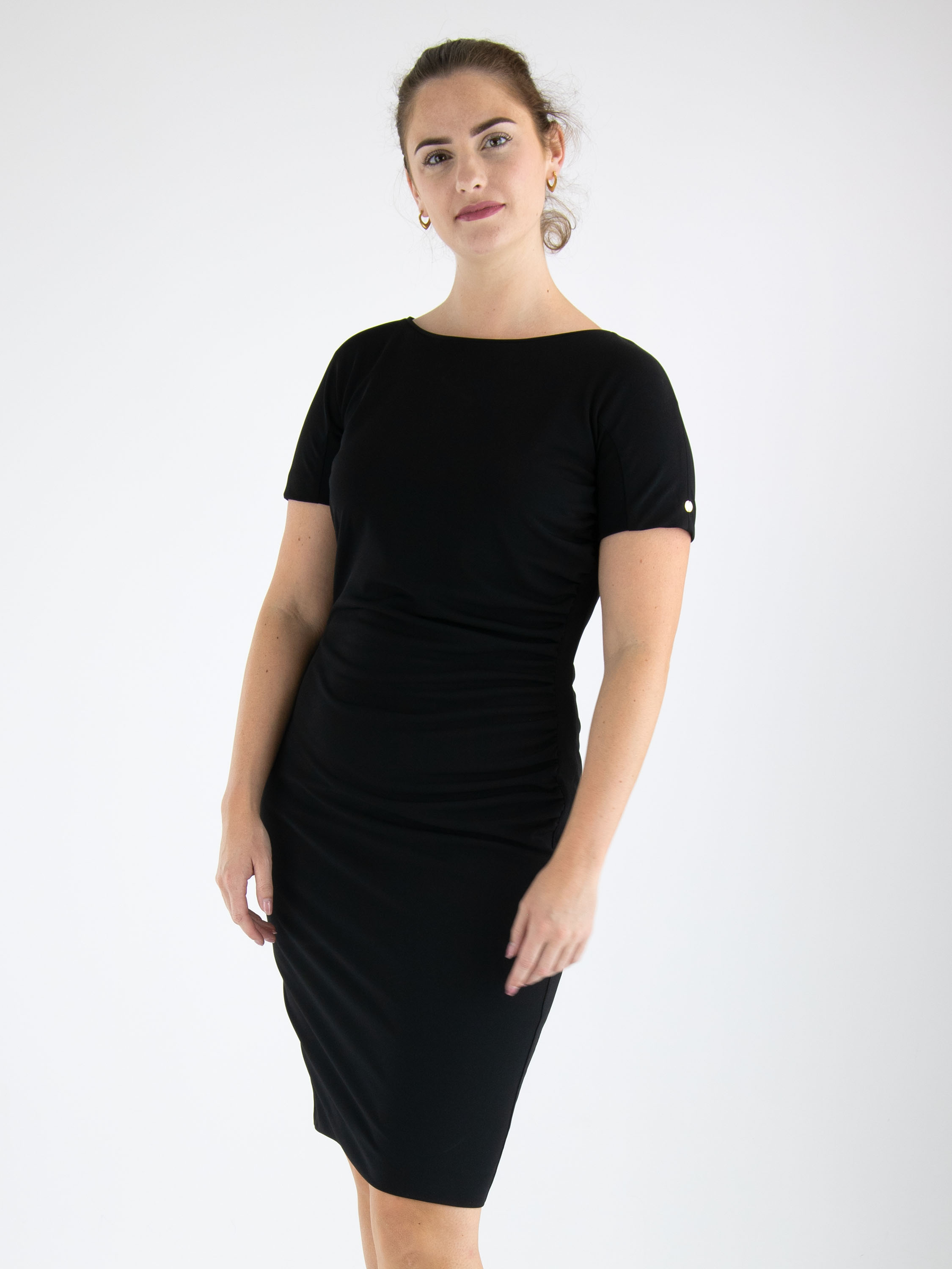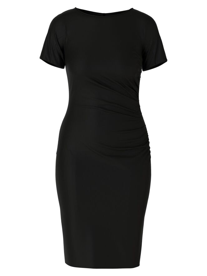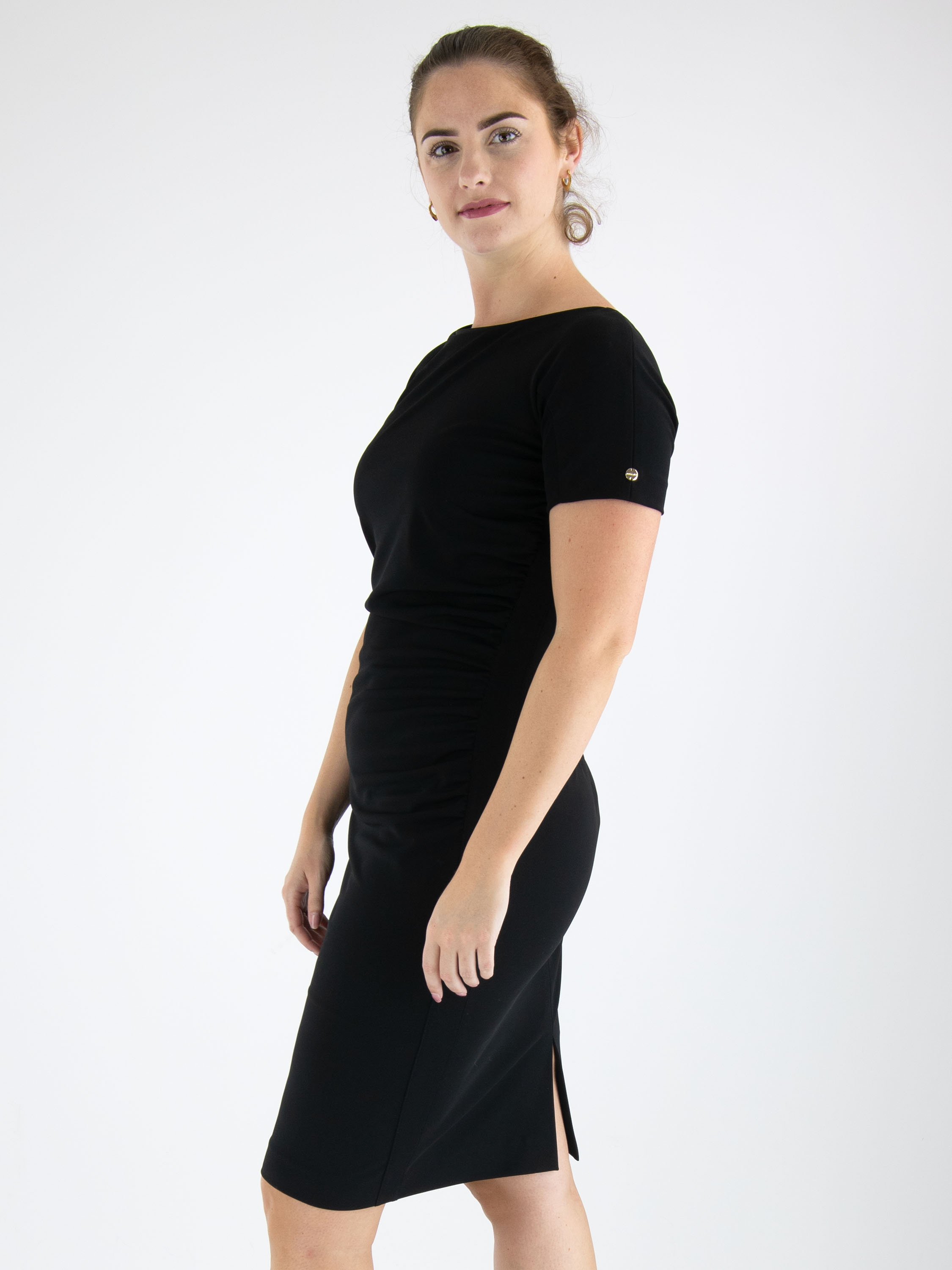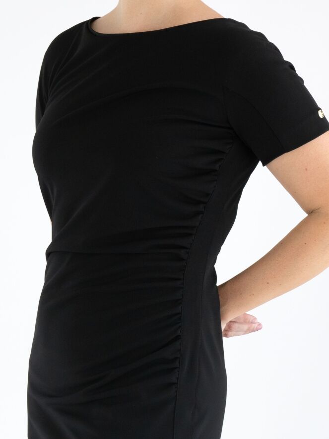 A dress from Marc Cain in black. Along the left side, the fabric is finely pleated along the seam, creating a draping effect at the front. The dress has short sleeves, a round neckline, and can be washed at 30 degrees.