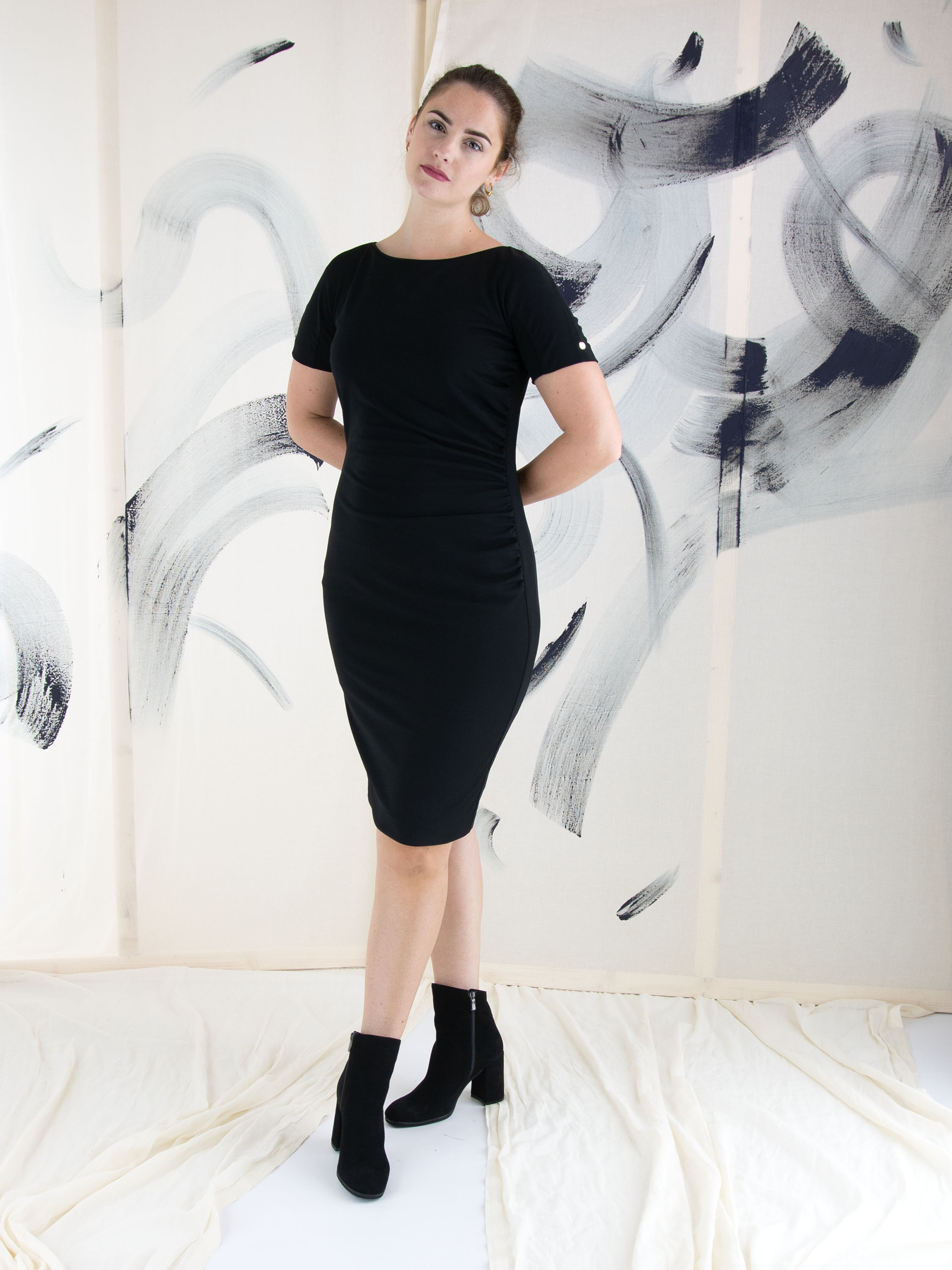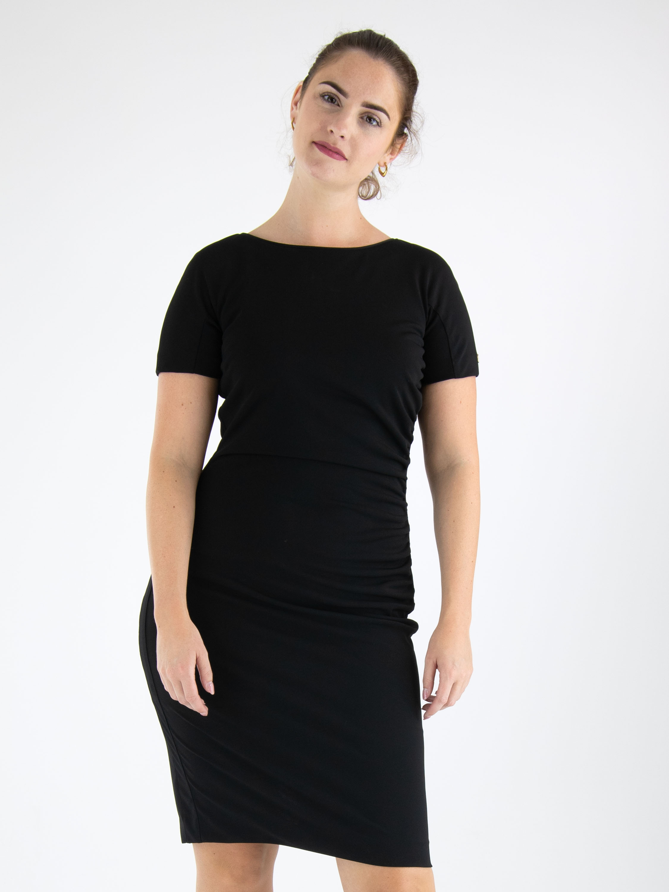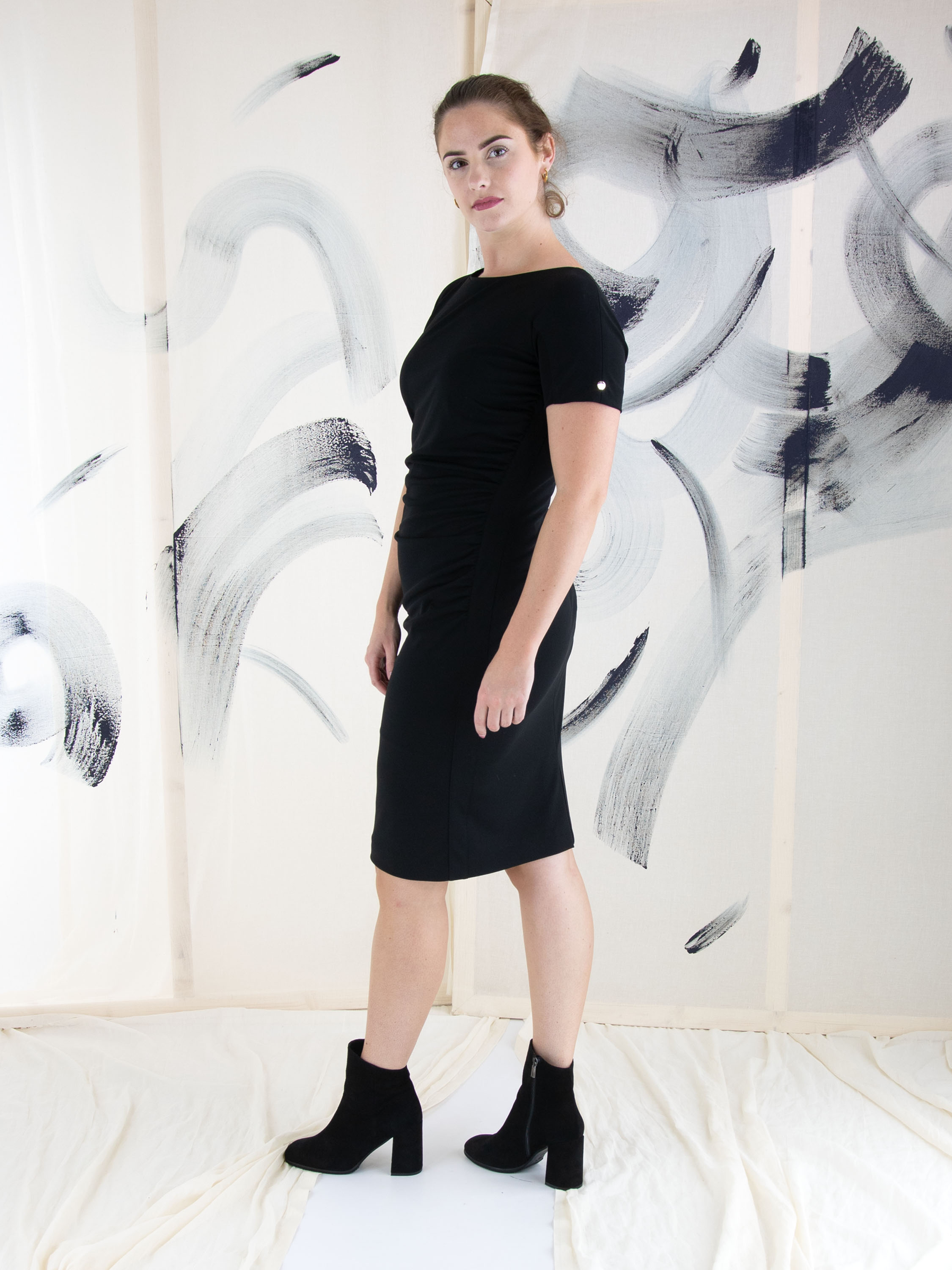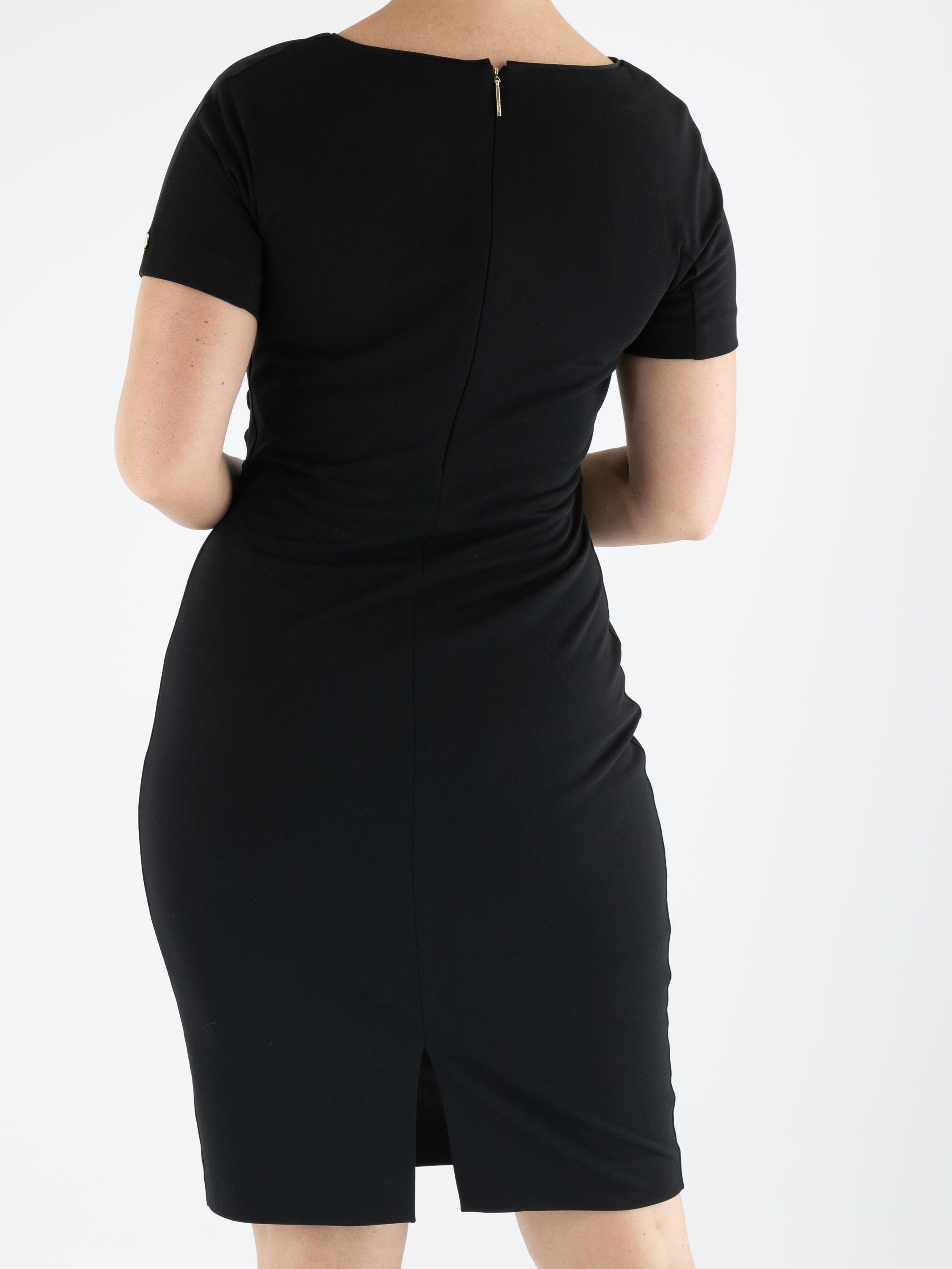 A dress from Marc Cain in black. Along the left side, the fabric is finely pleated along the seam, creating a draping effect at the front. The dress has short sleeves, a round neckline, and can be washed at 30 degrees.
