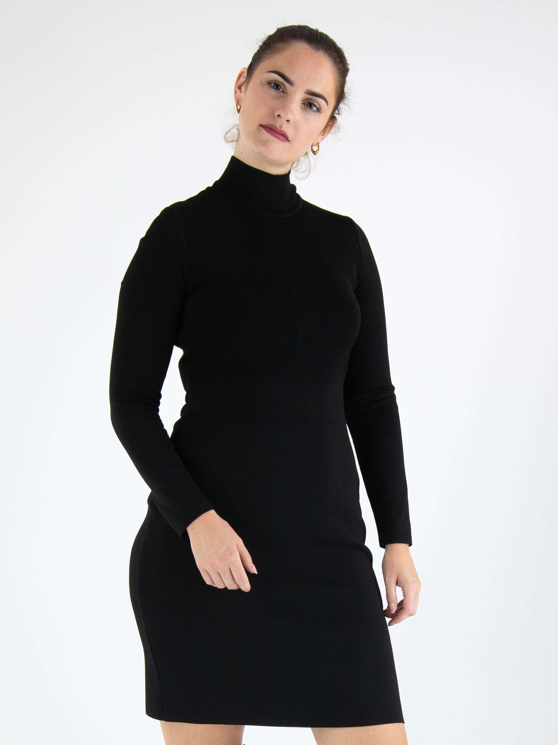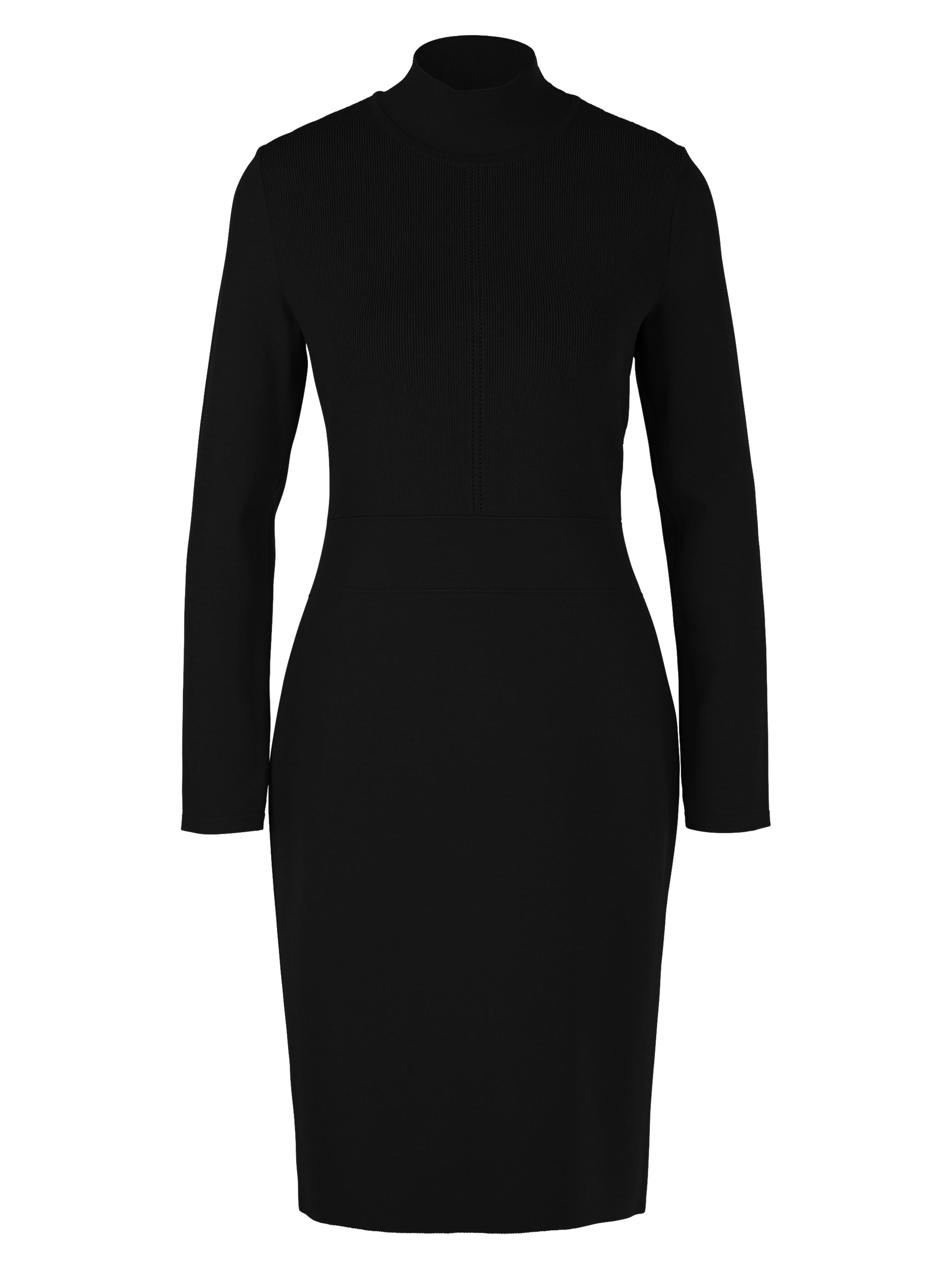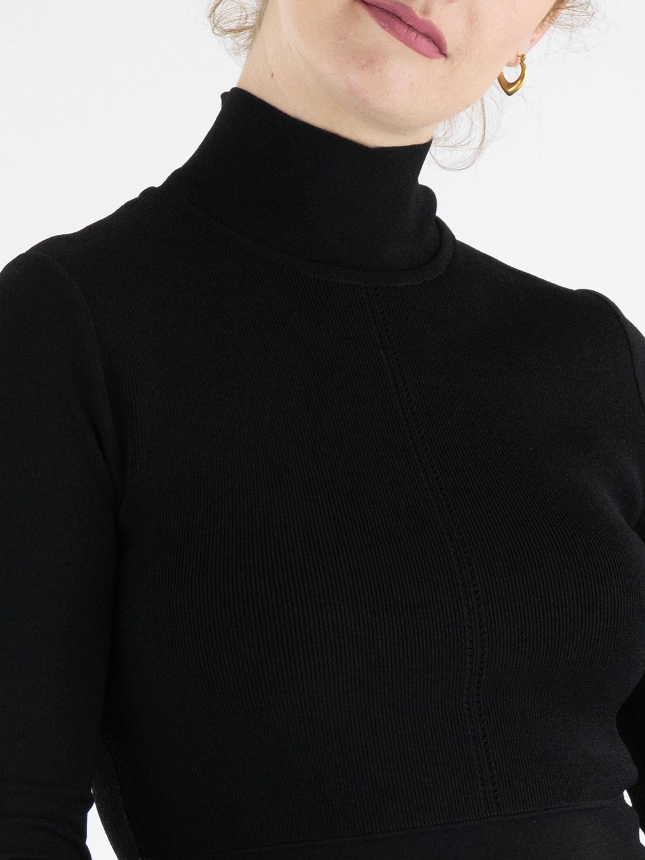 A knitted dress from Marc Cain in a fine ribbed texture in black. The dress features a turtleneck and long sleeves. There are two stitched seams at the waist, below which the fabric is of a uniform quality. This dress can be washed at 30 degrees.
